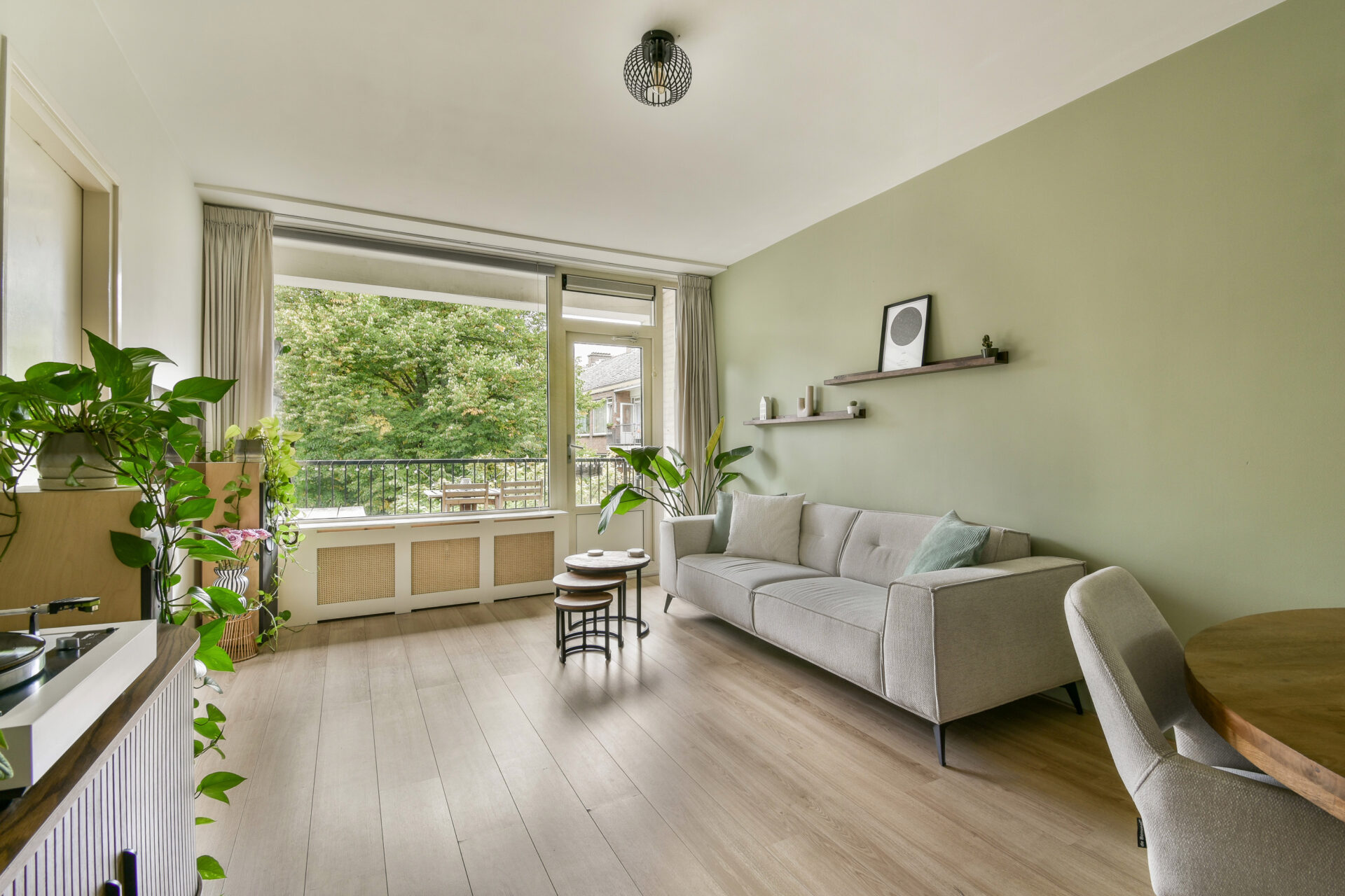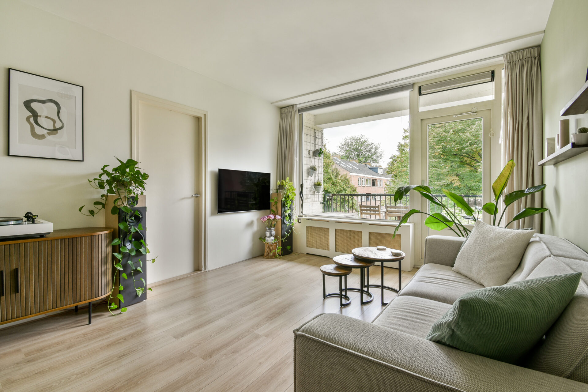 The apartment’s walls and ceilings are neatly and neutrally finished, and the floor features beautiful laminate.