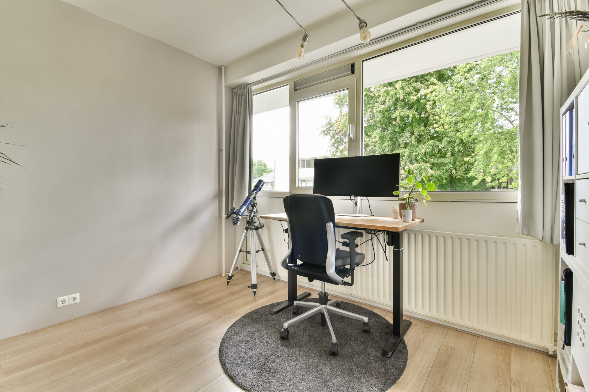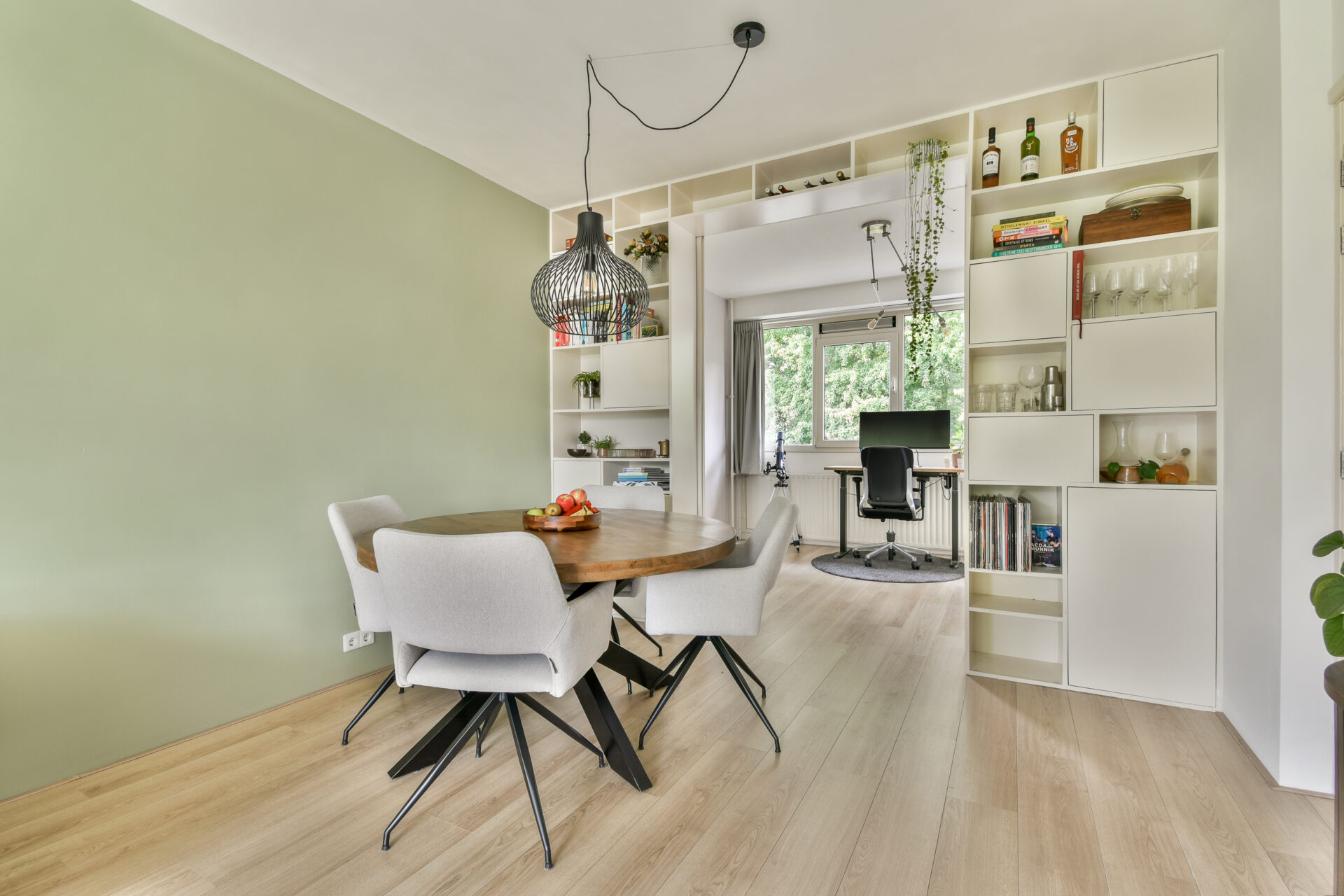 To the right is the first bedroom, currently used as a home office. Thanks to the convenient en-suite doors, this room is directly connected to the living room, making it multifunctional.