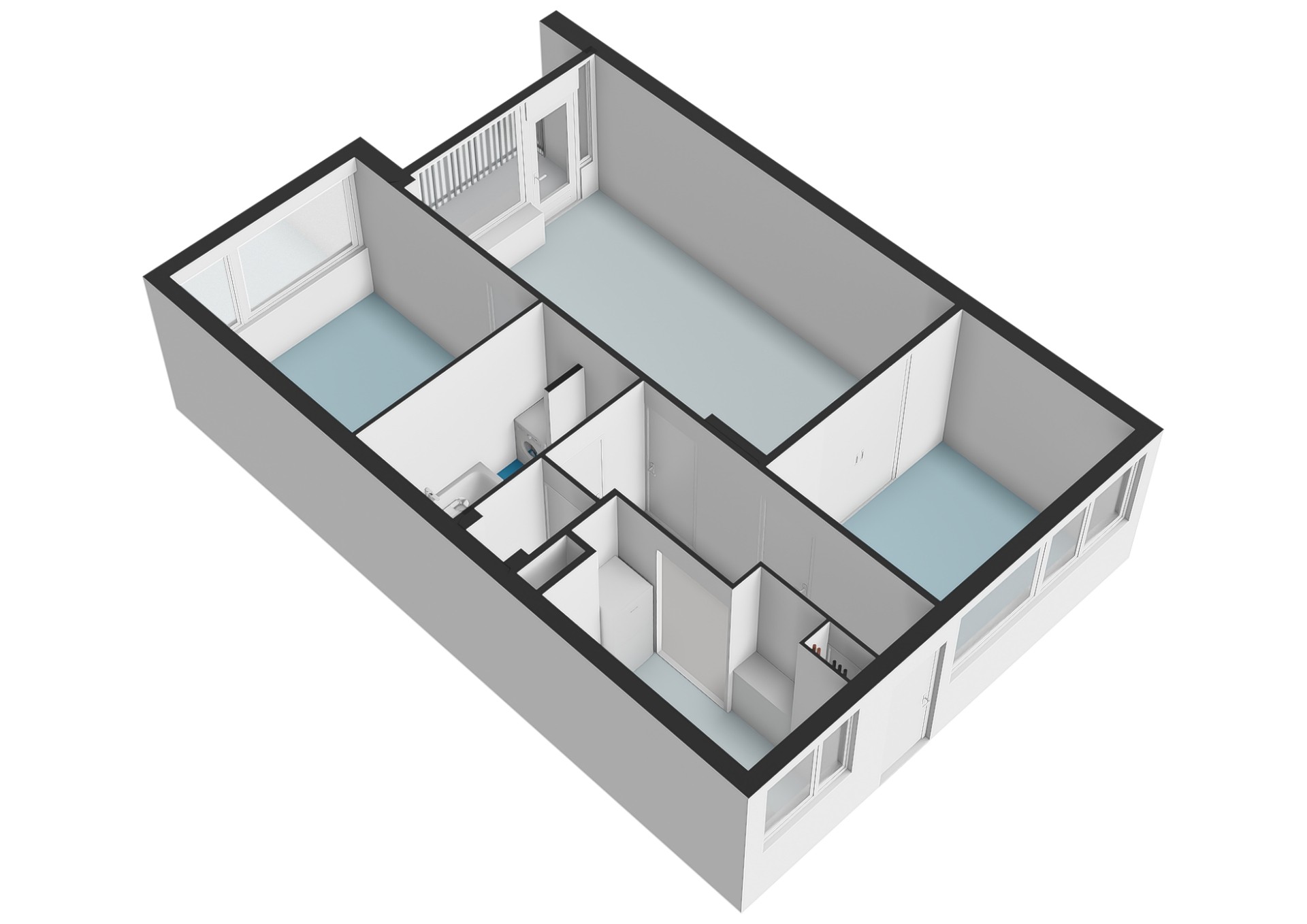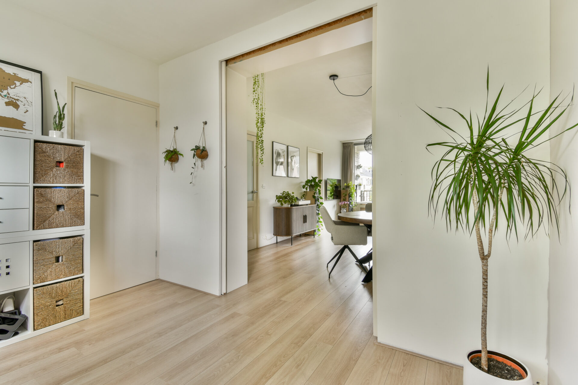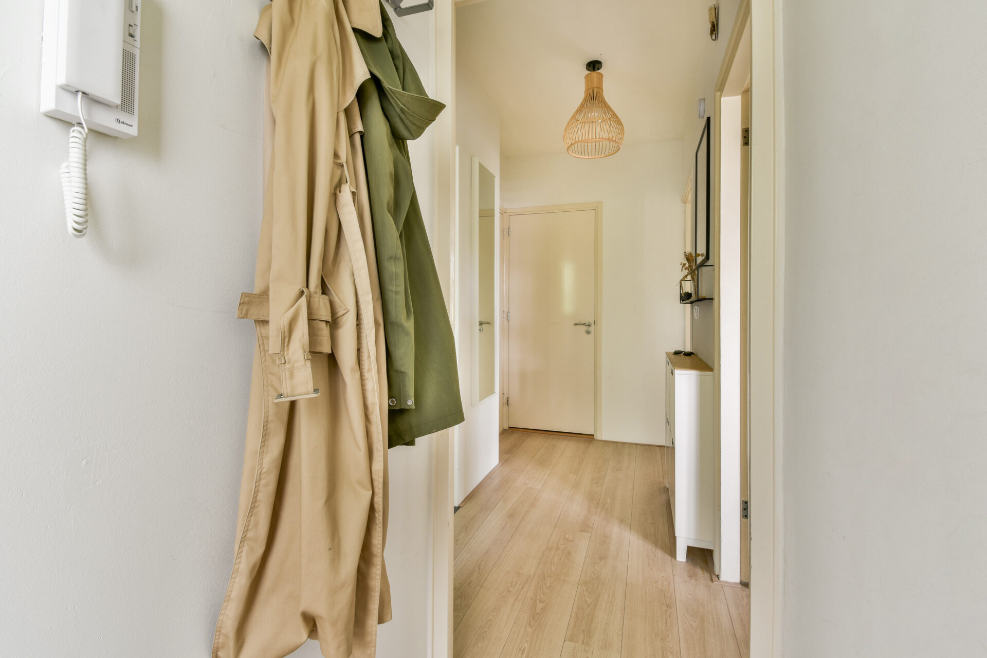 The apartment entrance is accessible via a staircase and gallery. The front door opens into a vestibule with a meter cupboard and coat space, which leads into a hallway connecting all rooms.