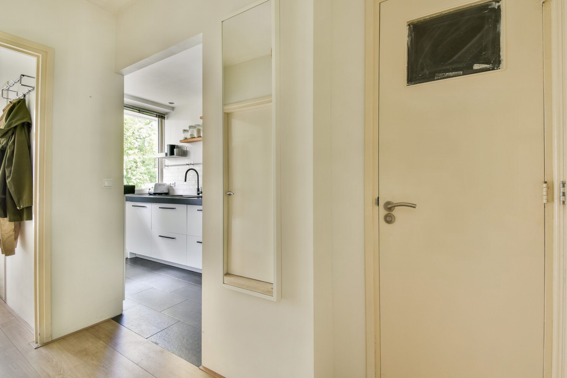Via de trap en gallerij is de voordeur van het appartement toegankelijk. De entree opent in een vestibule met meterkast en garderobe, vanwaar je toegang hebt tot de hal die leidt naar de verschillende ruimtes. Direct aan de linkerzijde is de moderne separate keuken. De keuken is modern door de witte kasten met zwarte grepen en is uitgerust met diverse inbouwapparatuur; zoals een nieuwe inductie kookplaat, recent vervangen vaatwasser, oven en afzuigkap.