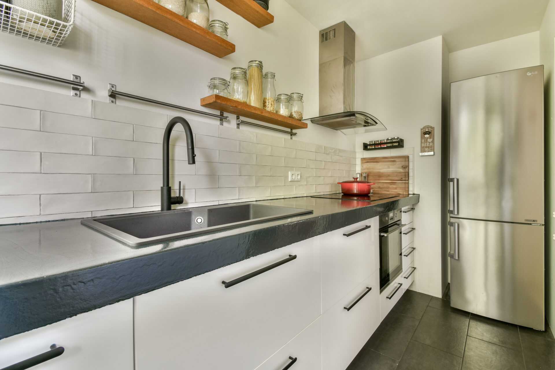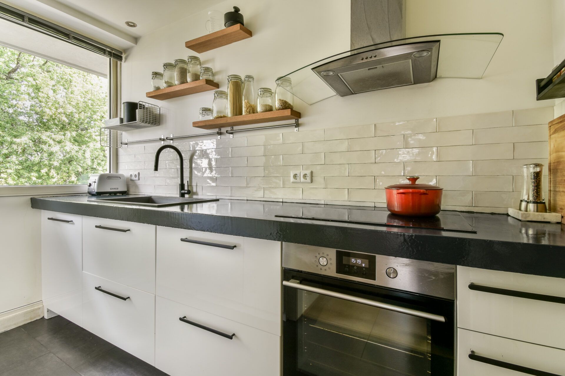 Immediately to the left is the modern, separate kitchen. This kitchen features sleek white cabinets with black handles and is equipped with built-in appliances, including a new induction cooktop, a recently replaced dishwasher, oven, and extractor hood.