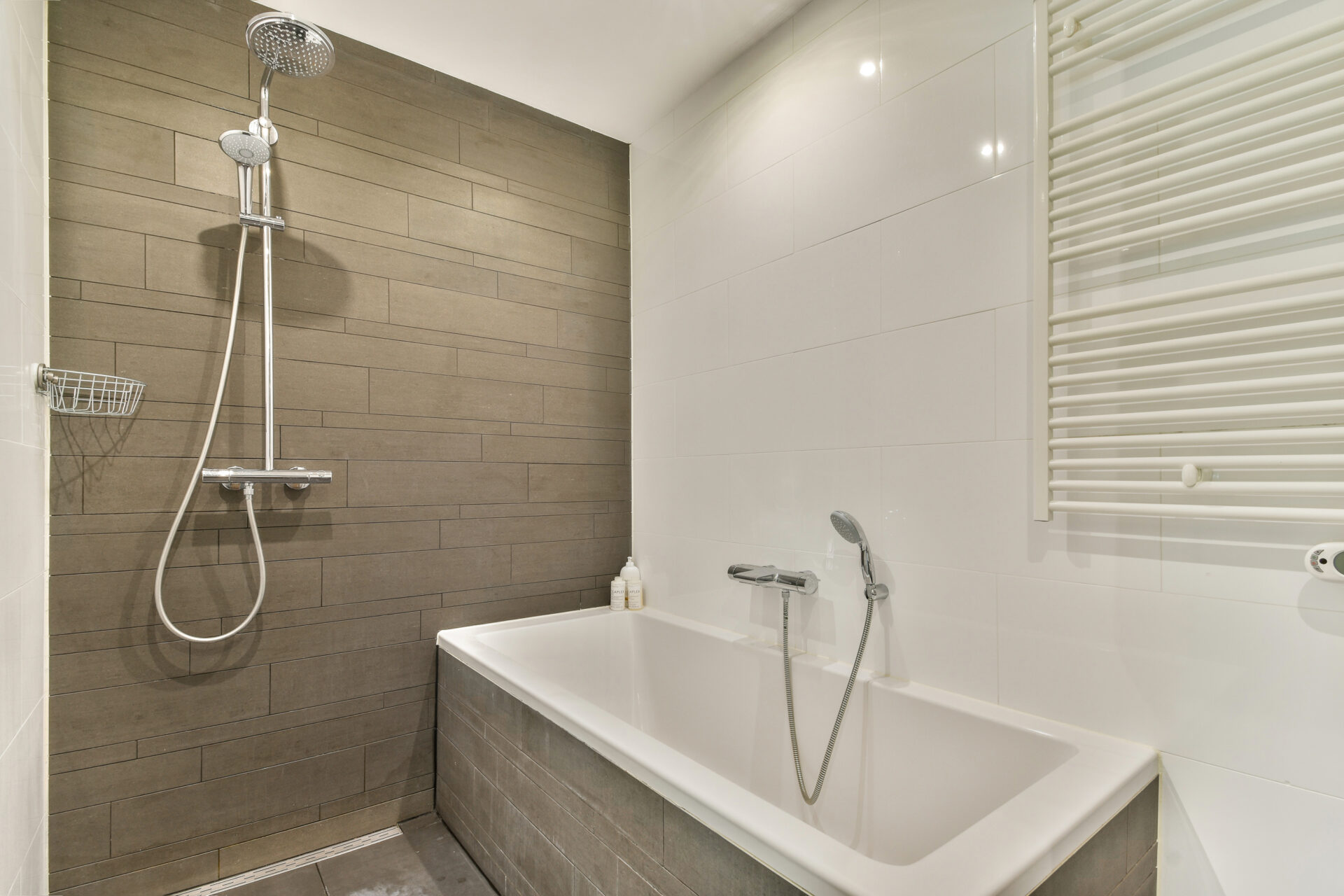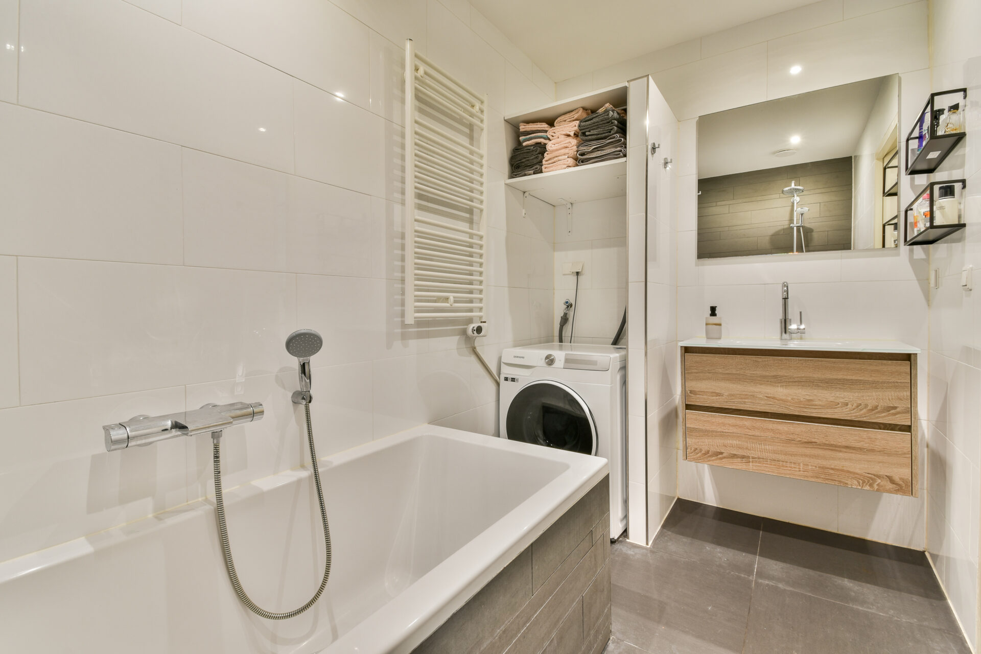 Back in the hallway, you’ll find a separate toilet and the bathroom. The bathroom is generously sized and includes a bathtub, walk-in shower, and a sink with a vanity unit. This is also where the washing machine and dryer are conveniently placed.