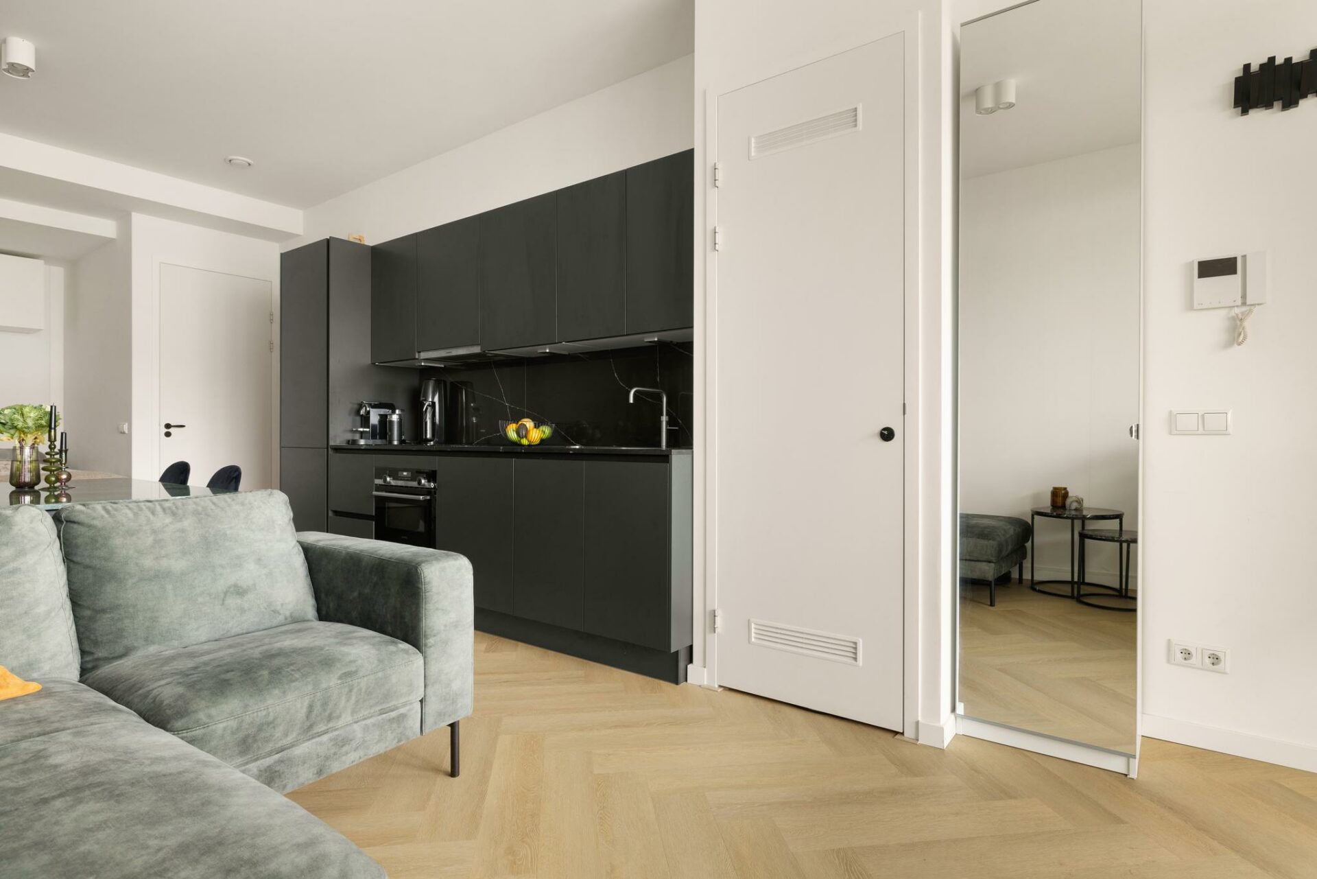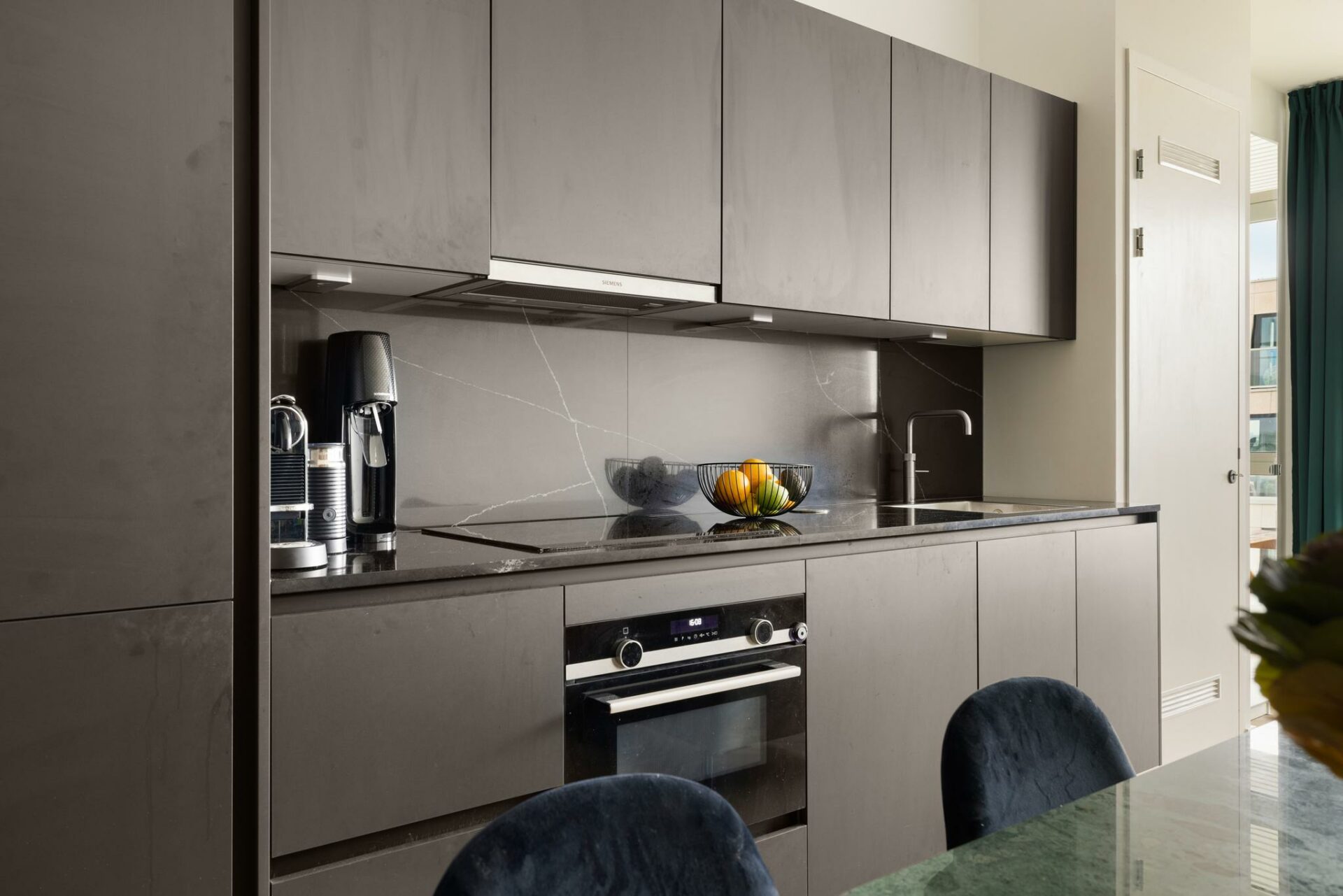 Via de centrale hal kunt u met de lift (in totaal 4 liften) naar de elfde verdieping. Bij aankomst bij de woning zie je meteen het fijne terras van maar liefst 8,3m2. Hier kan je heerlijk genieten van de zon en het uitzicht. Bij binnenkomst kom je terecht in het woongedeelte met de open keuken. De moderne open keuken heeft alles wat je maar wensen kan. Er is inbouwapparatuur zoals een koelkast, vriezer, inductiekookplaat, vaatwasser, oven/magnetron en zelfs een Quooker. Het slaapgedeelte is gelegen aan de achterzijde. De badkamer is erg ruim en voorzien van een inloopdouche, wastafelmeubel en toilet. De berging bevindt zich aan de andere kant van het slaapgedeelte met daarin het WKO systeem. Ook is hier voldoende opbergruimte.