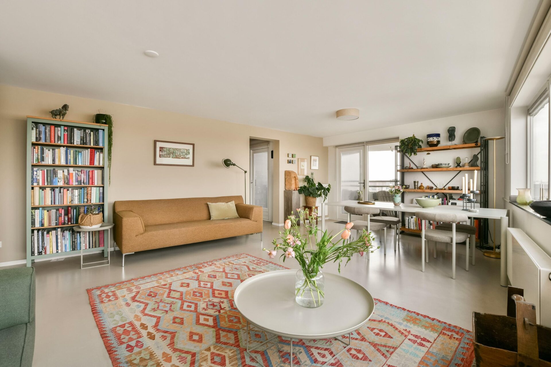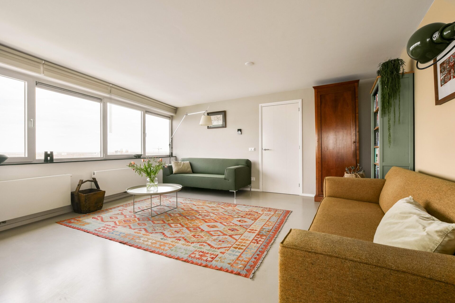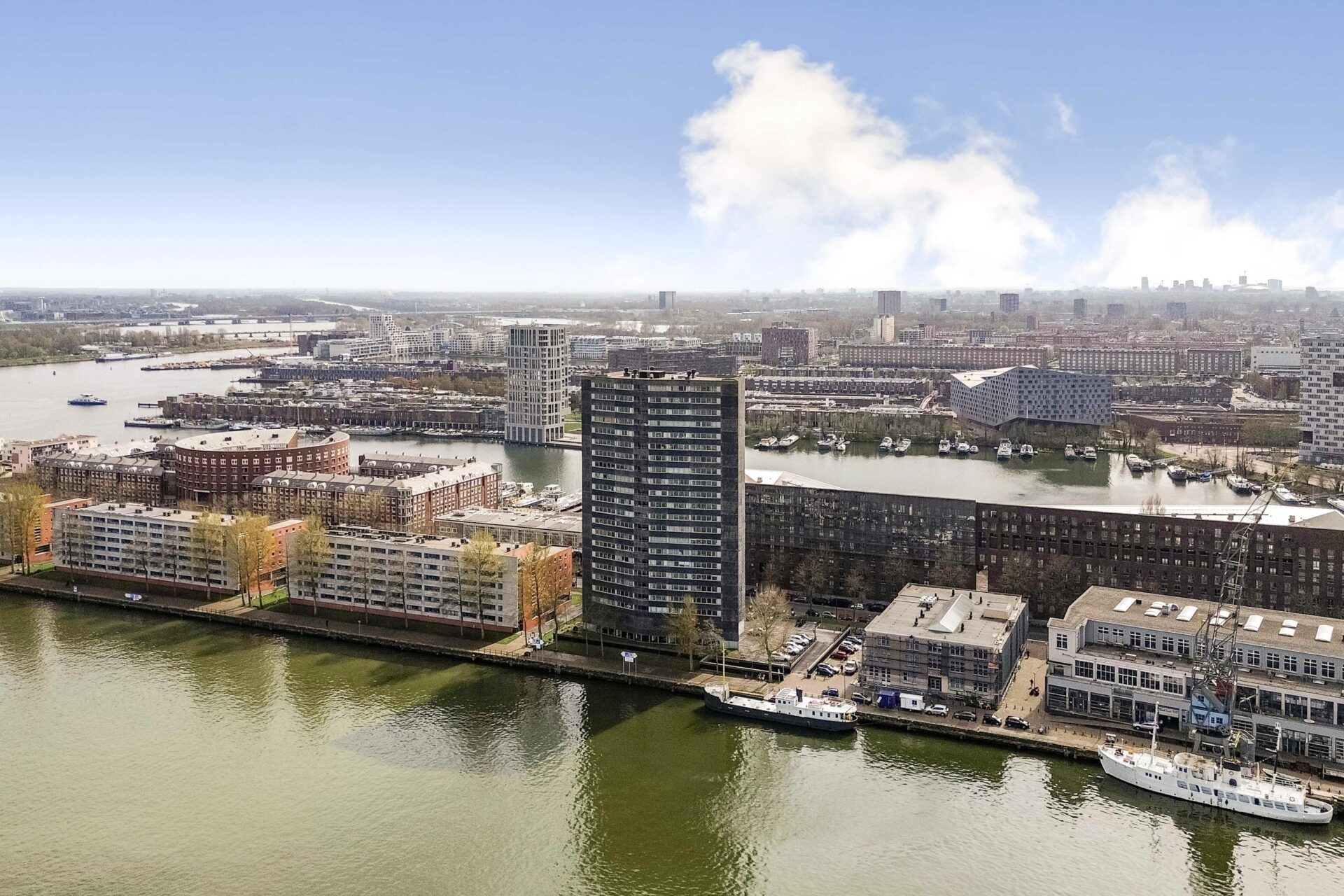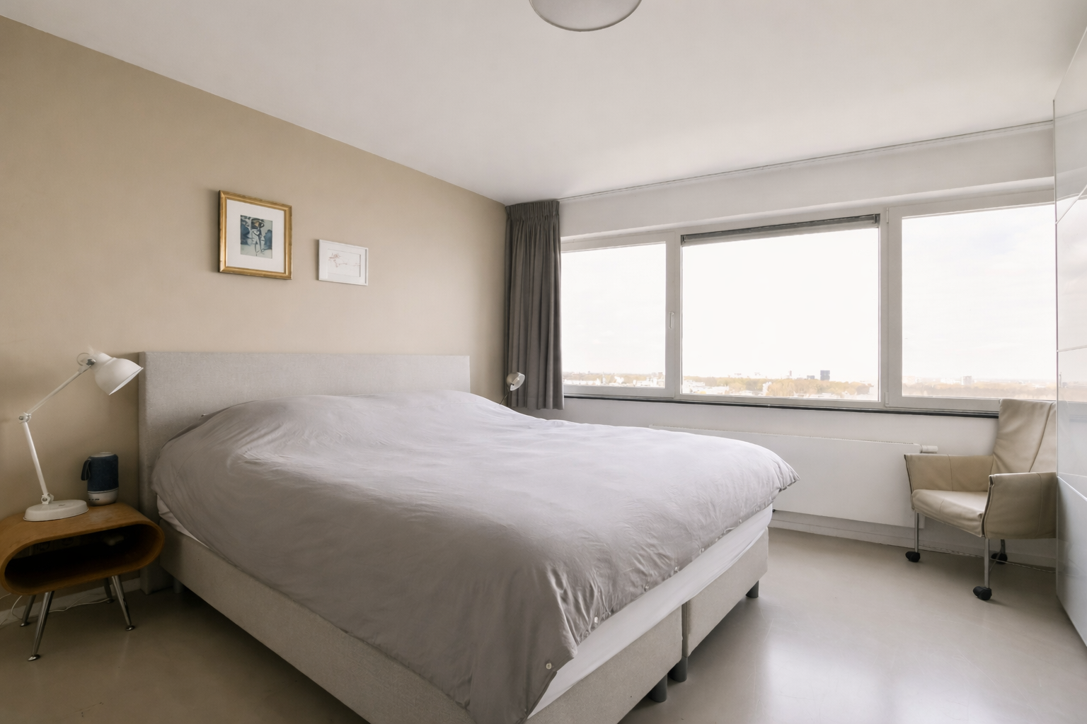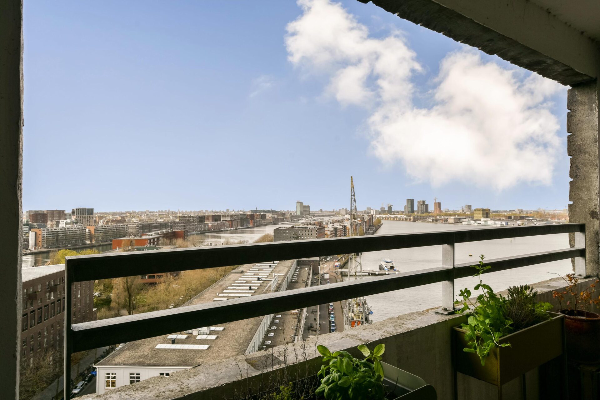 This spacious three-room apartment of over 100 m² is located on the fourteenth floor of the iconic Skydome building on KNSM Island. The complex, designed by architect Wiel Arets, is characterized by a sleek industrial design where quality and attention to detail are central. While the exterior has a modern, business-like appearance, great care has been taken inside to create a warm and comfortable atmosphere, with beautifully designed common areas.