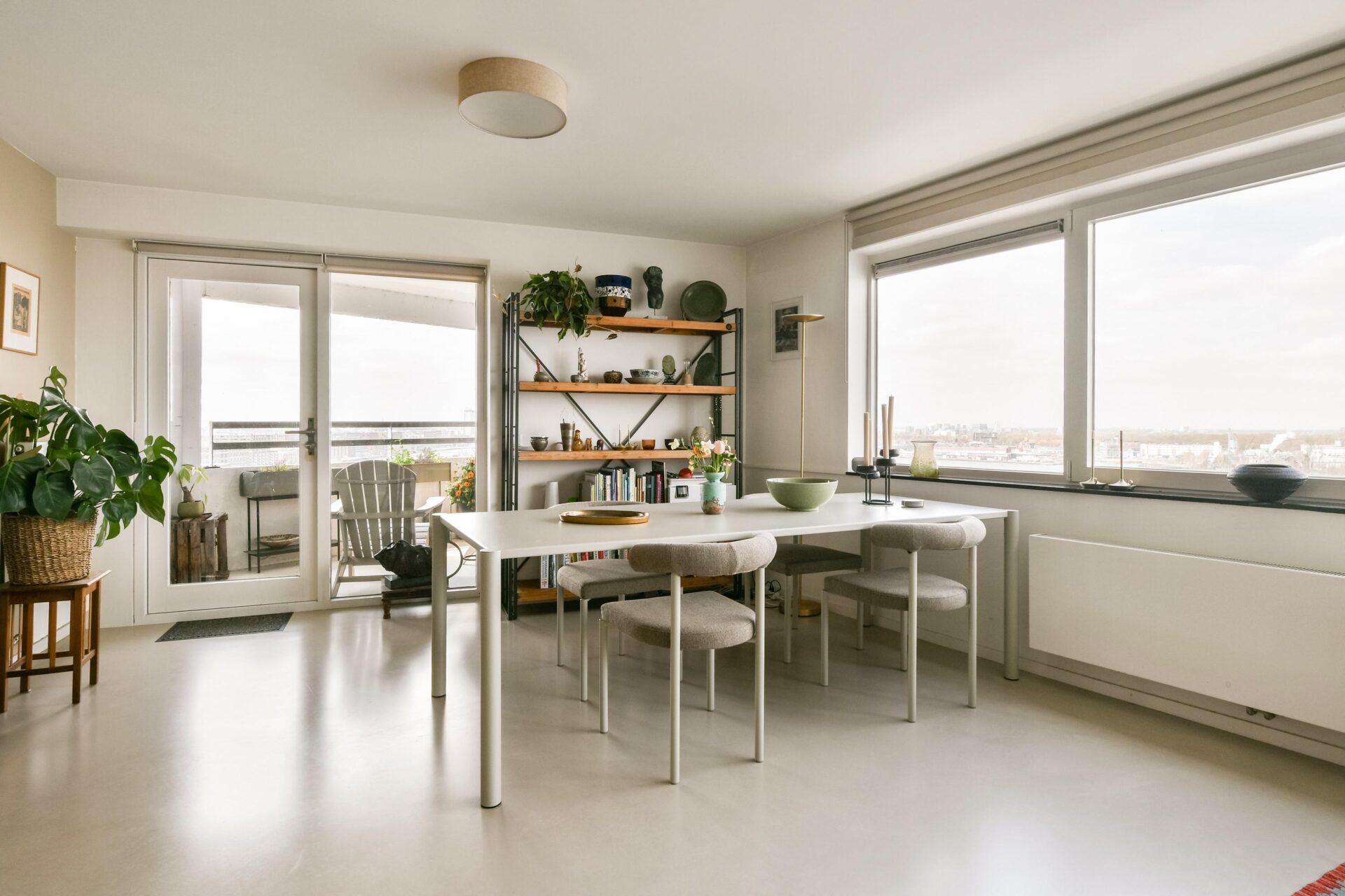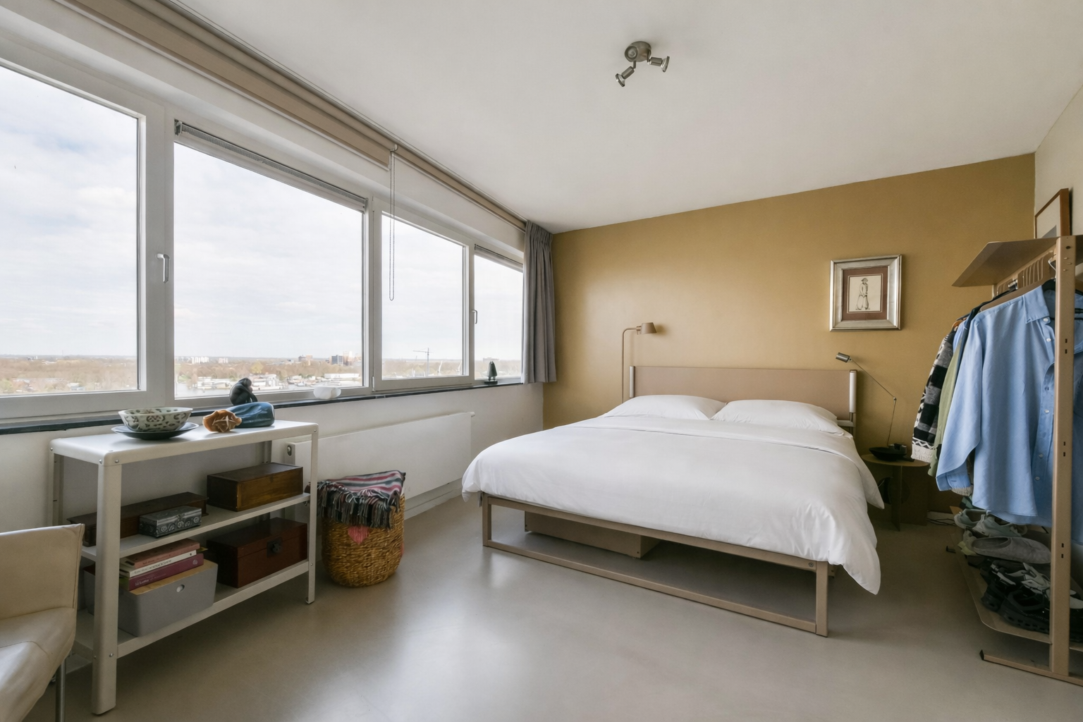 The west-facing balcony is accessible from the living room and offers stunning views of Amsterdam’s city center — perfect for enjoying the afternoon and evening sun.