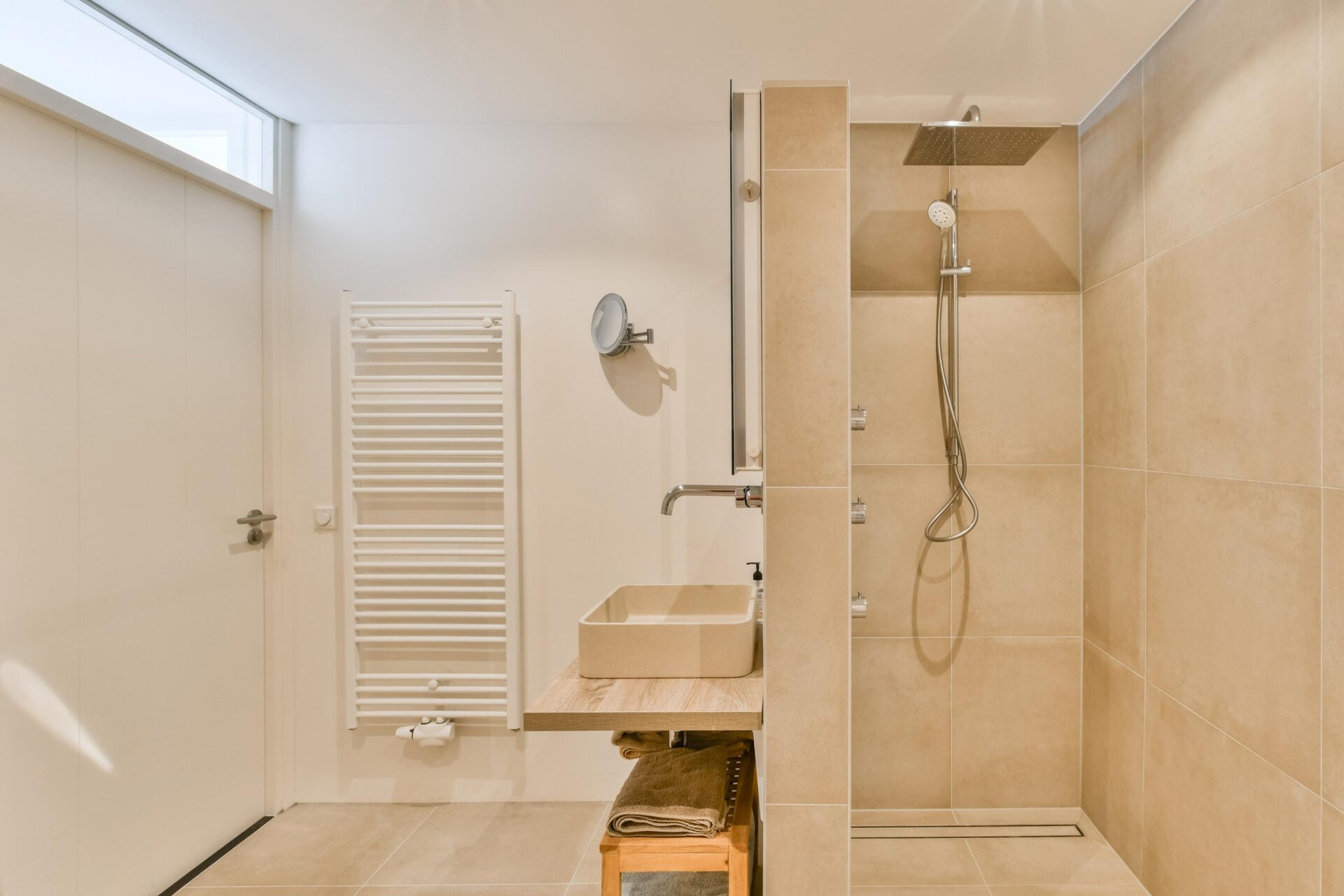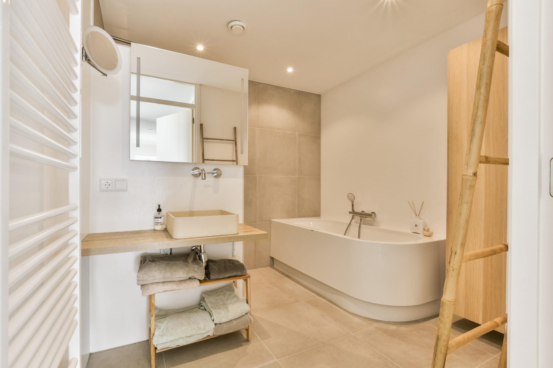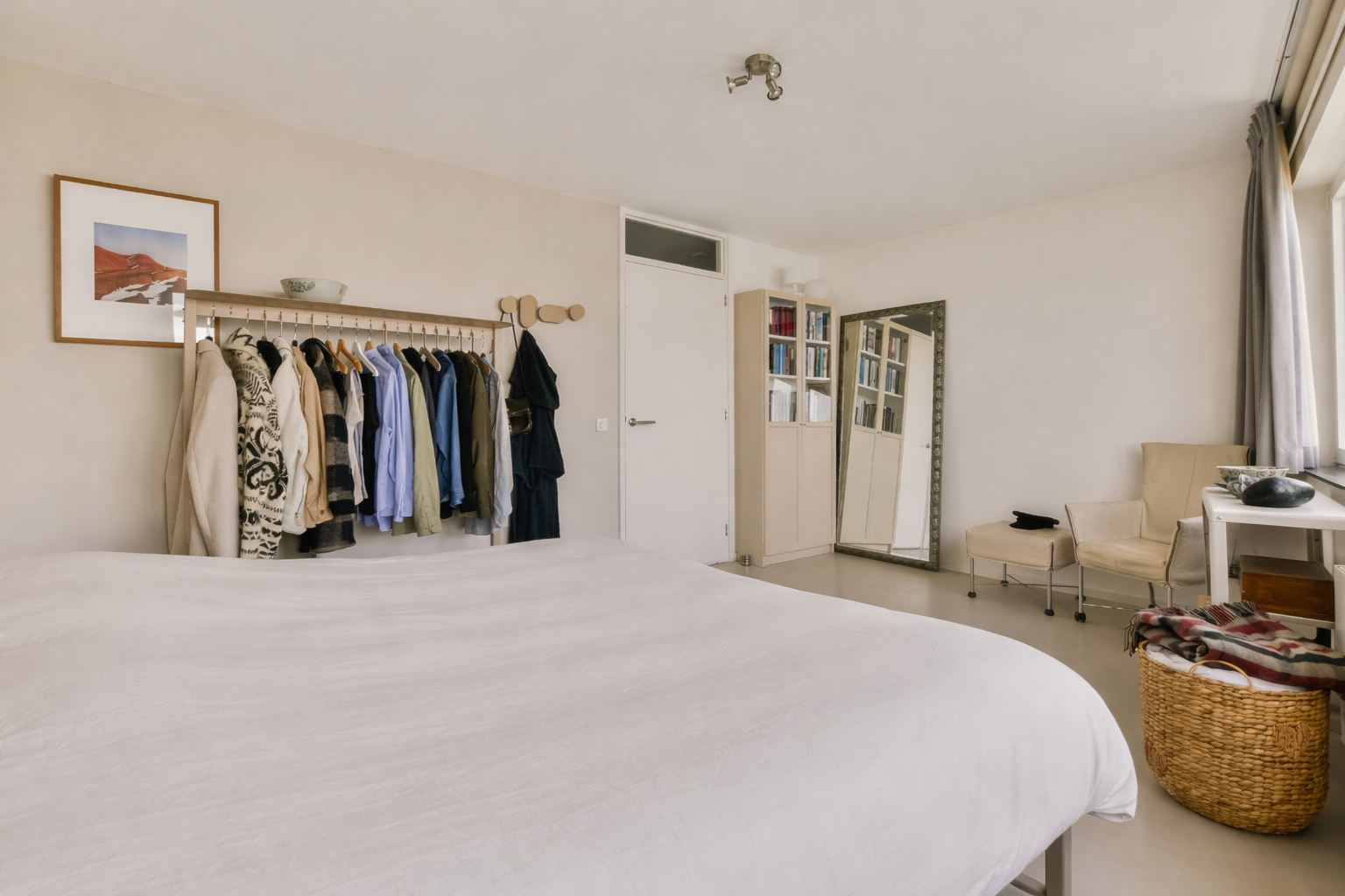 The apartment features two spacious bedrooms, both with views over the IJ. The bathroom, located at the end of the hallway, is modern, generously sized, and was renovated in 2023. It includes a walk-in shower, bathtub, vanity unit, and a large mirror. There is also a separate toilet and a practical internal storage room with connections for a washing machine and the central heating system.