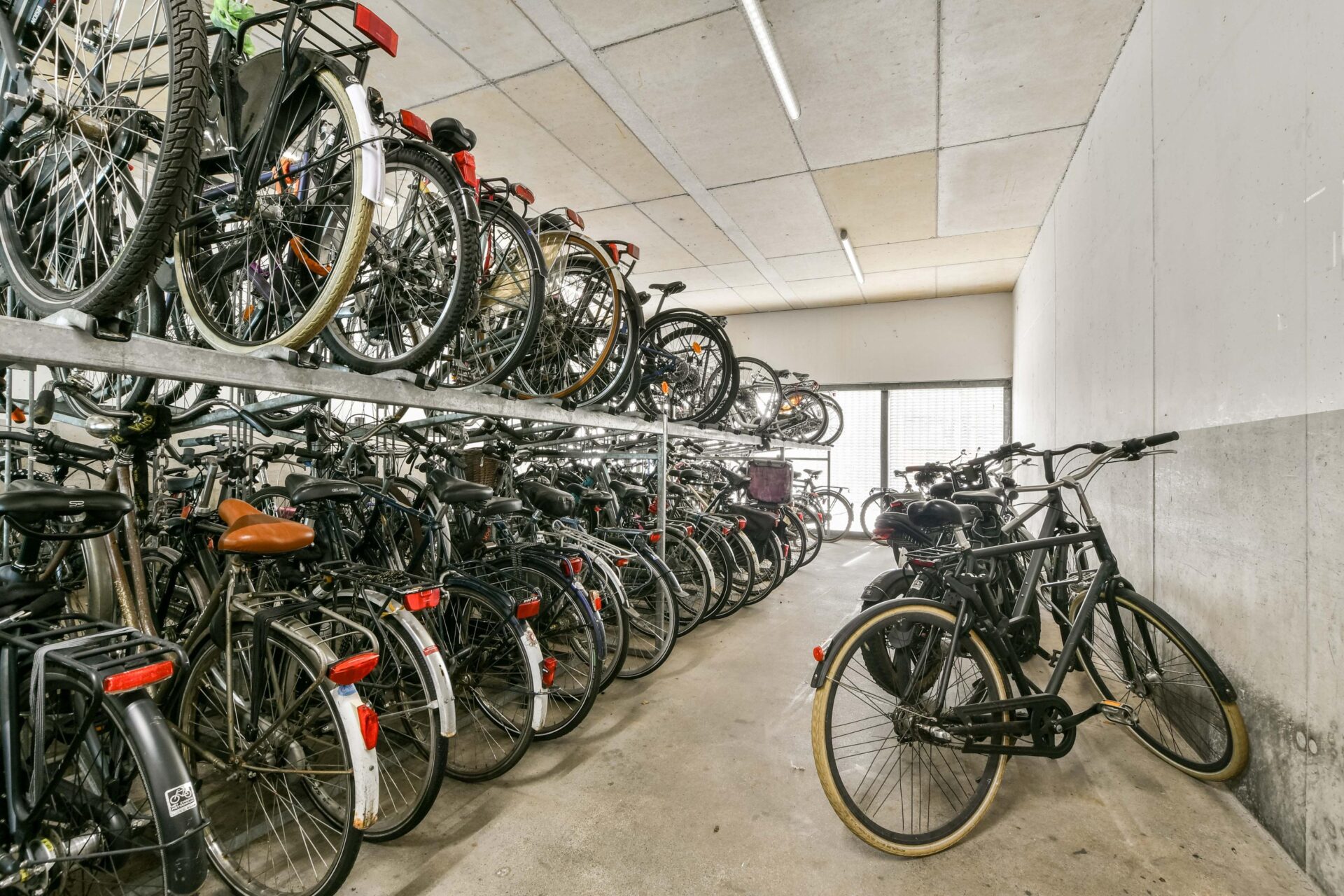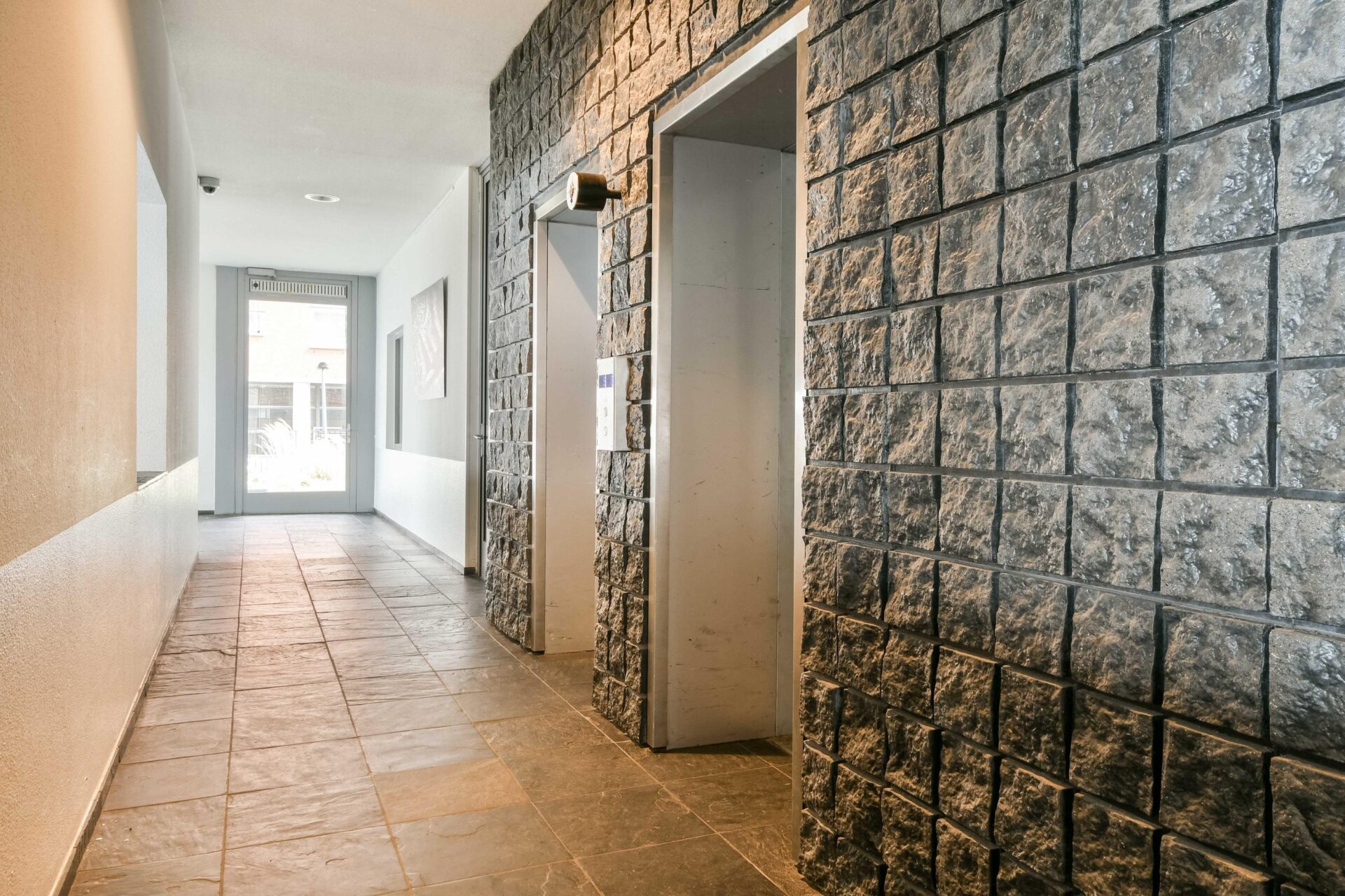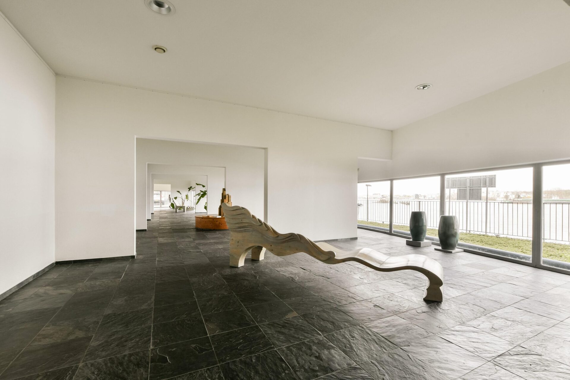 The generous shared entrance leads to a stylish lobby overlooking the IJ, enhanced with various artworks. The building features two elevators and a communal bicycle storage area.