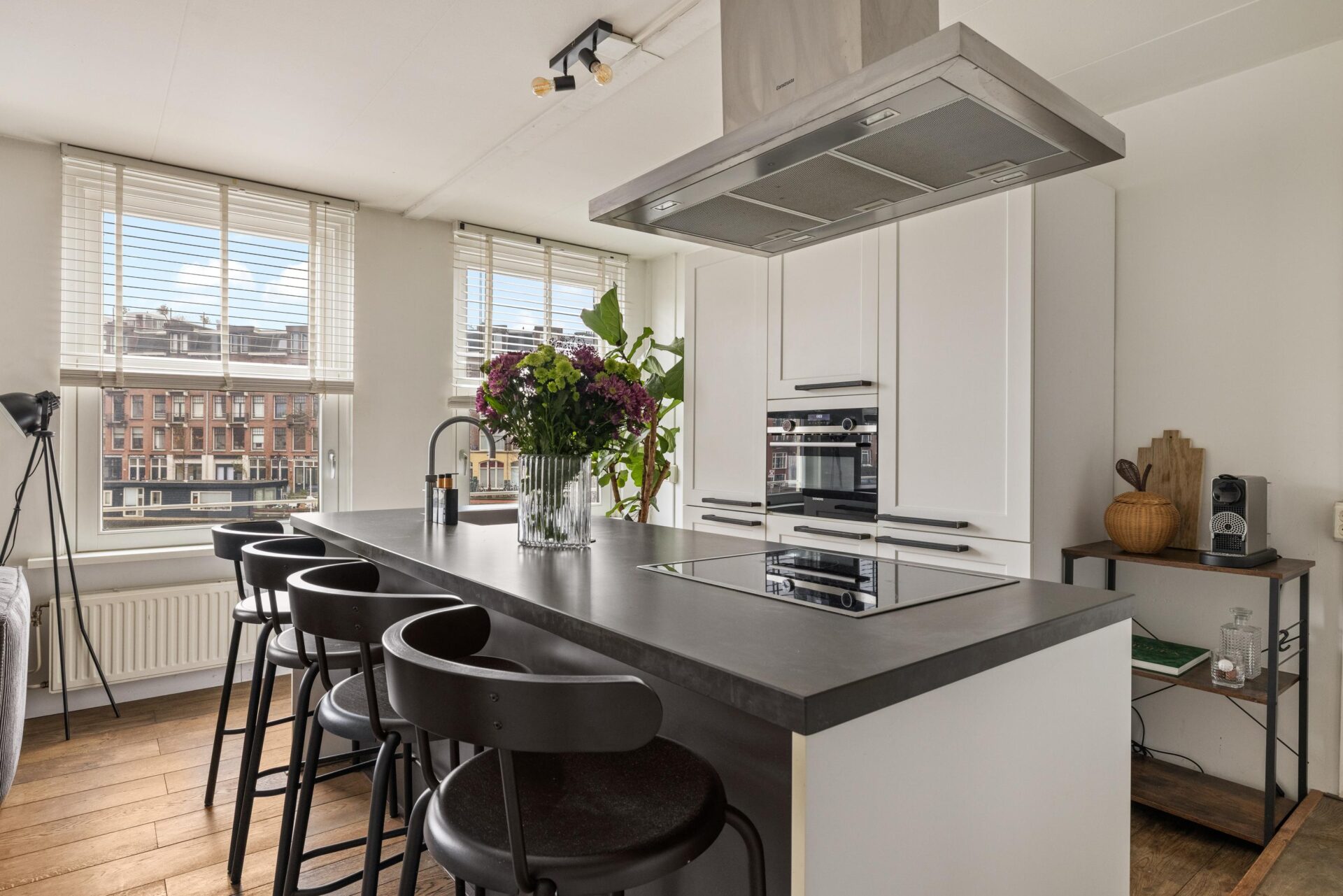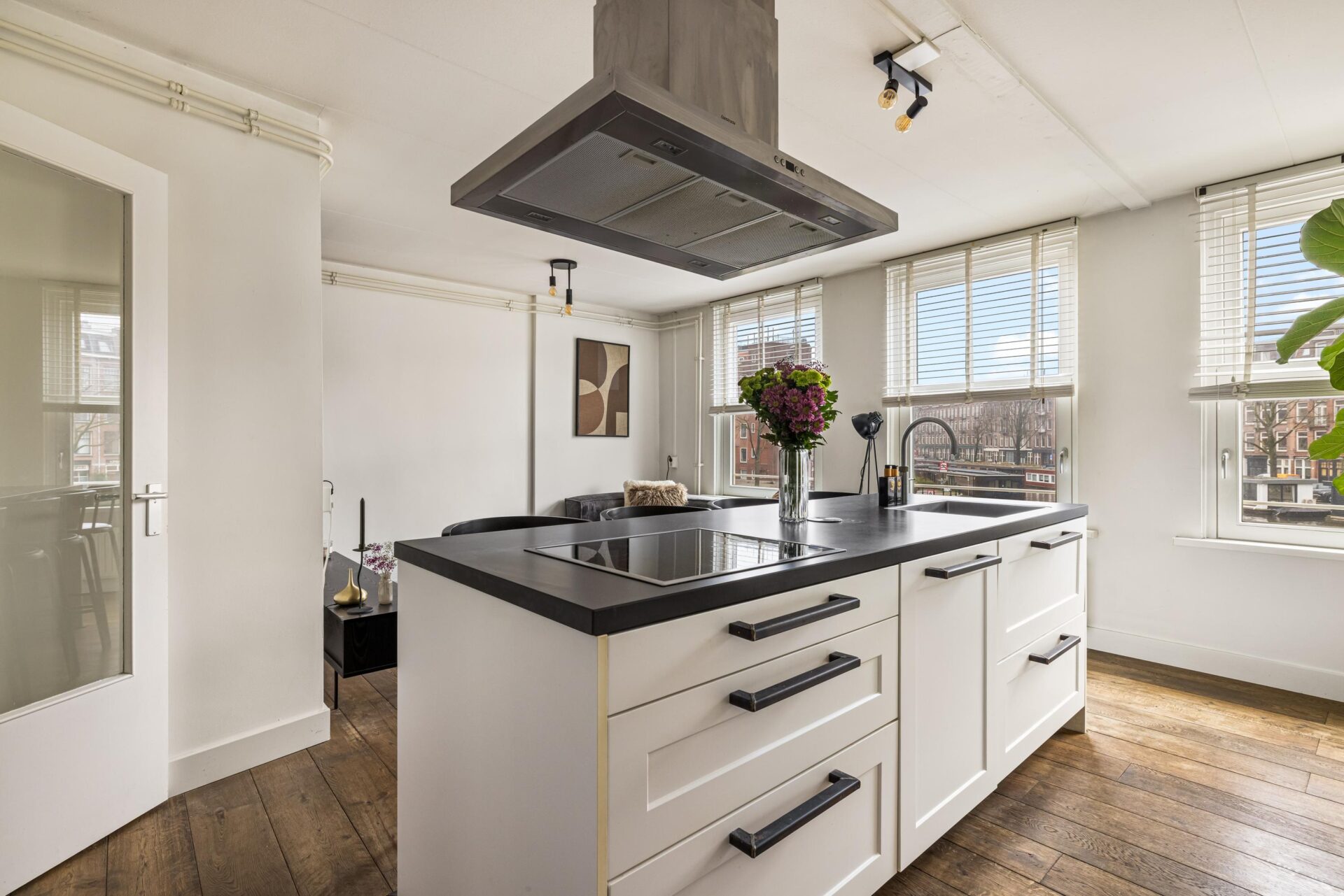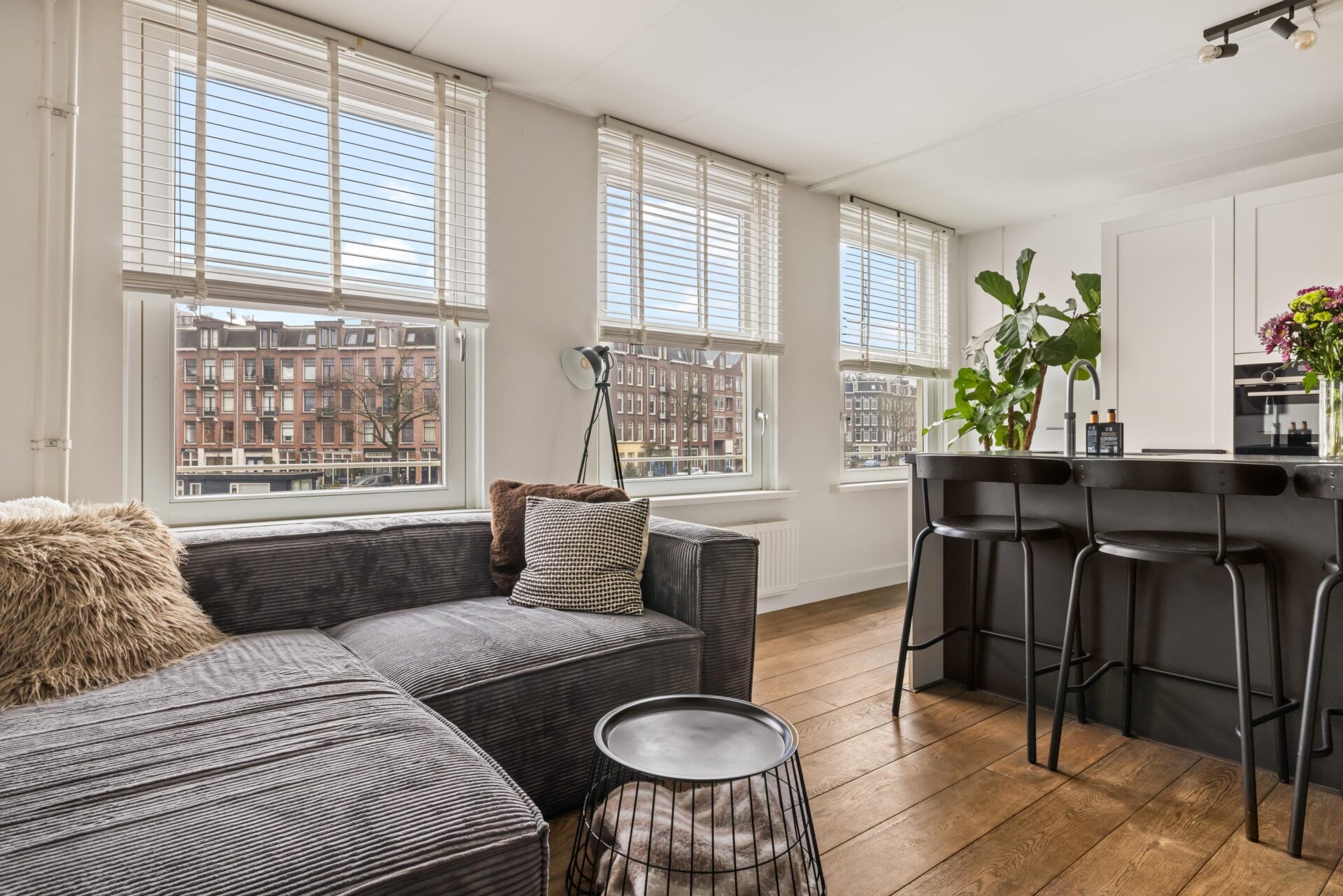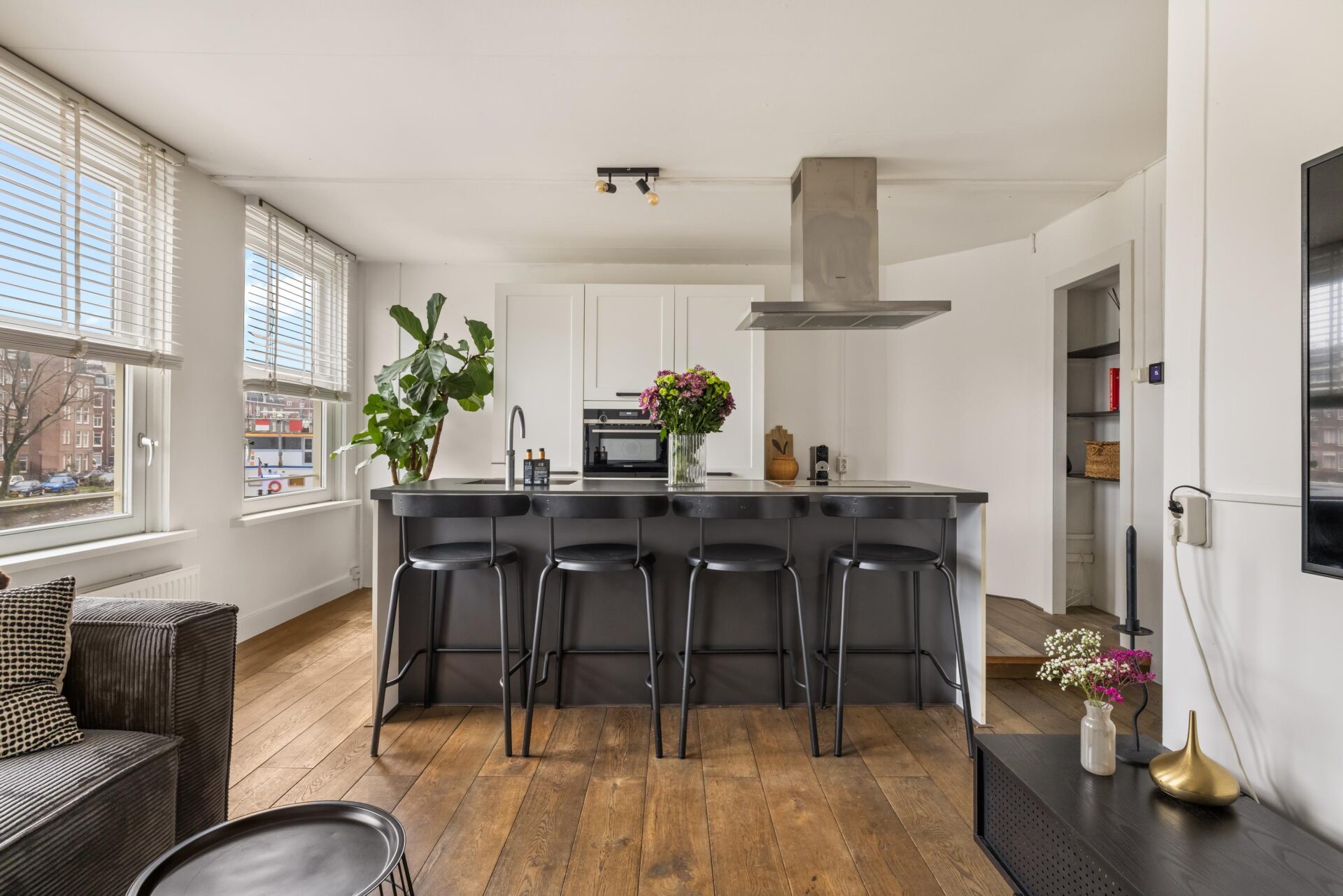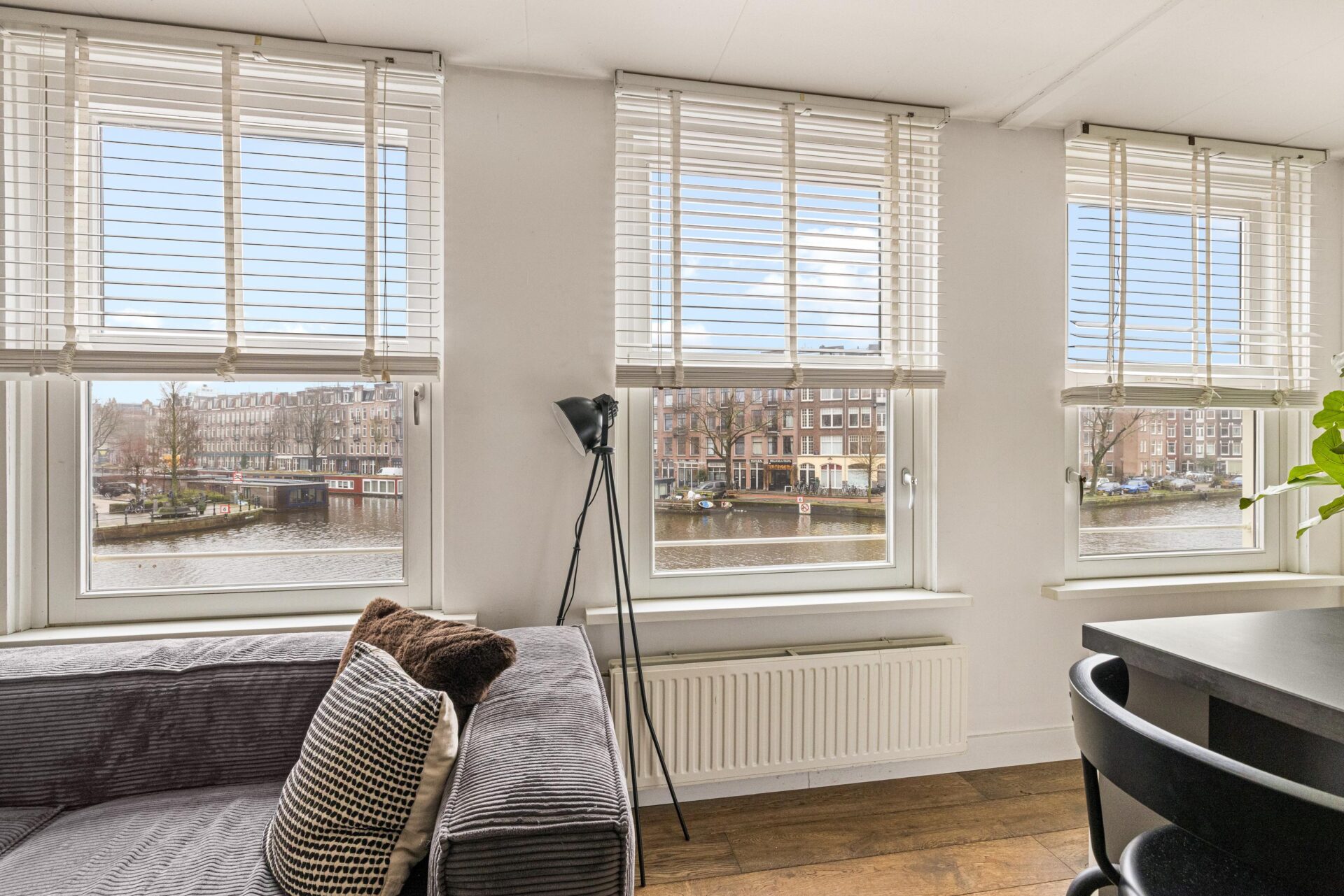 Via the neat communal stairwell you reach the apartment on the first floor. You enter into a pleasant hallway that provides access to all rooms. The front side is undoubtedly the eye-catcher of this apartment: a stunning view that never gets boring. From here you have front-row seats during King’s Day, Pride, and every summer when Amsterdam’s boats pass by in cheerful procession. Thanks to the large windows, this is a bright and inviting living space.