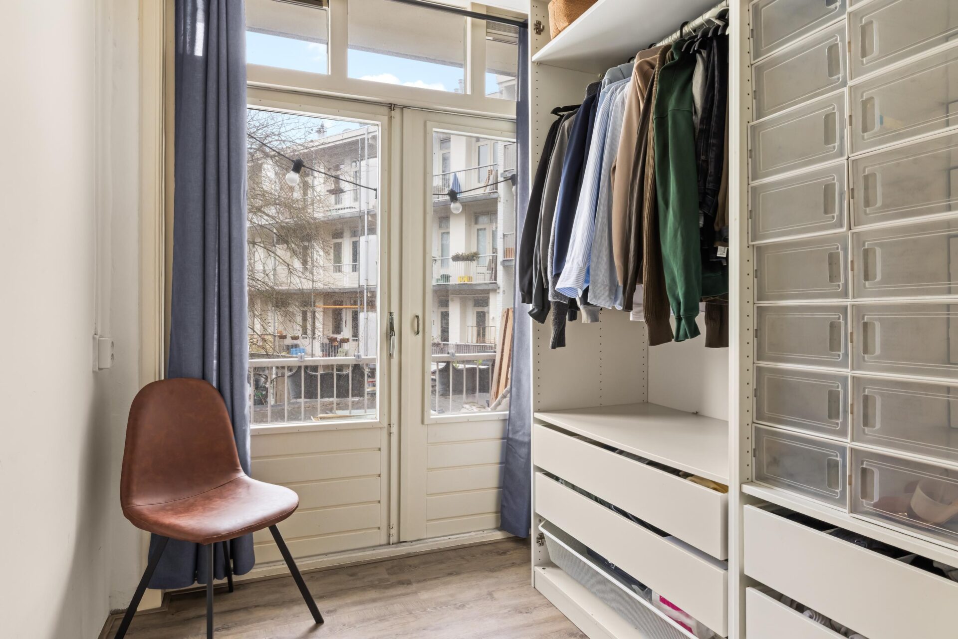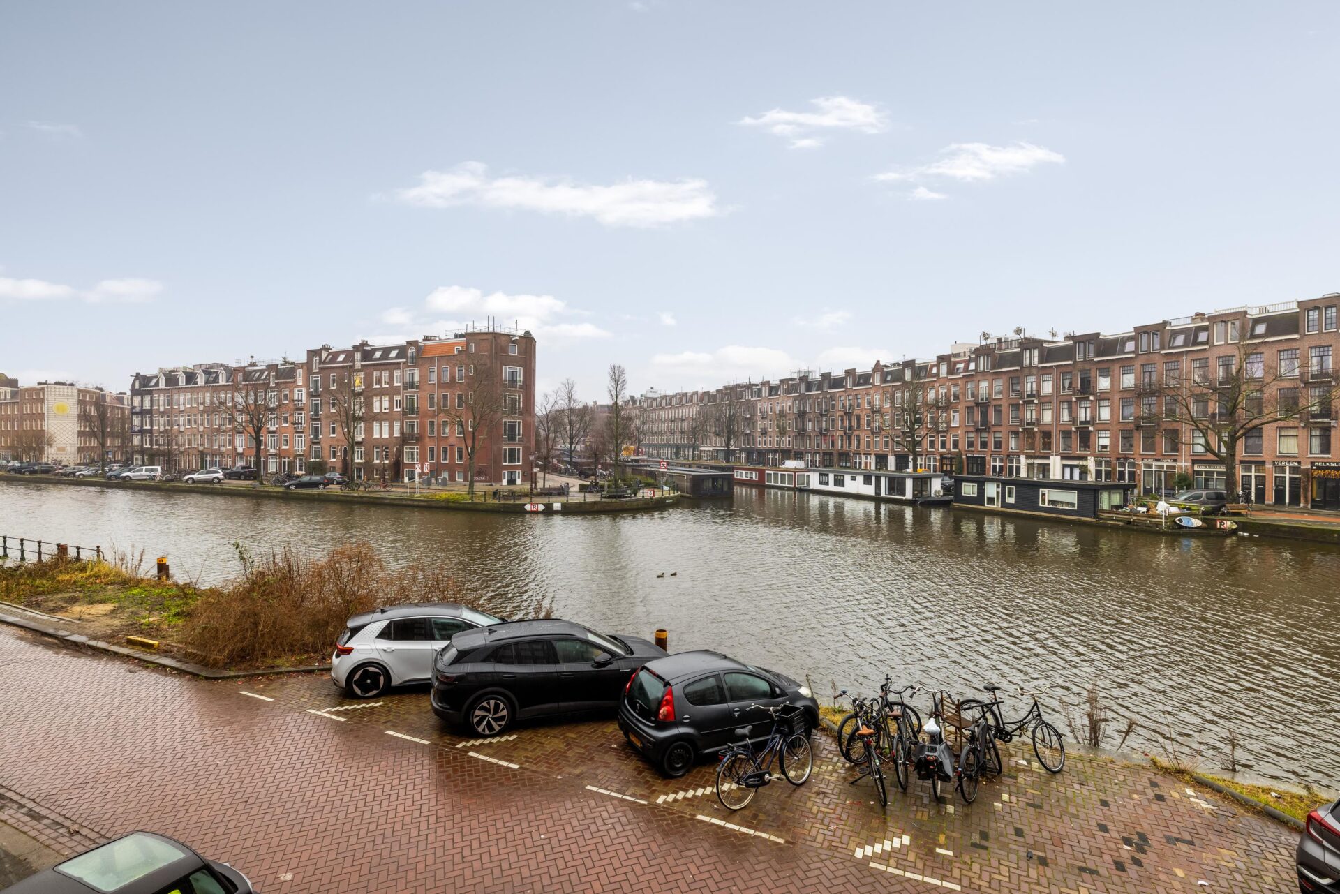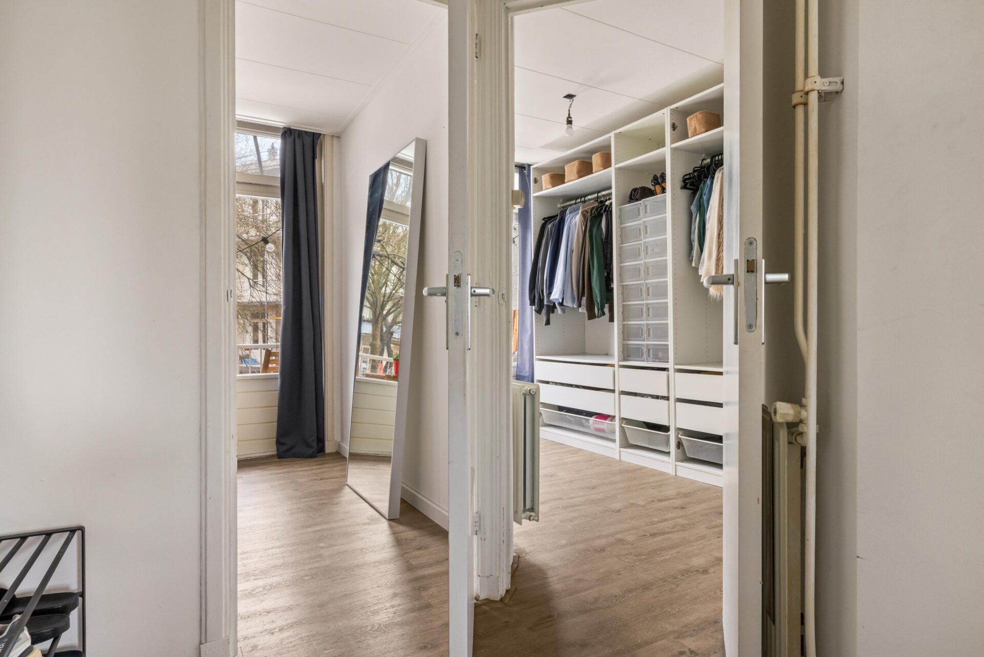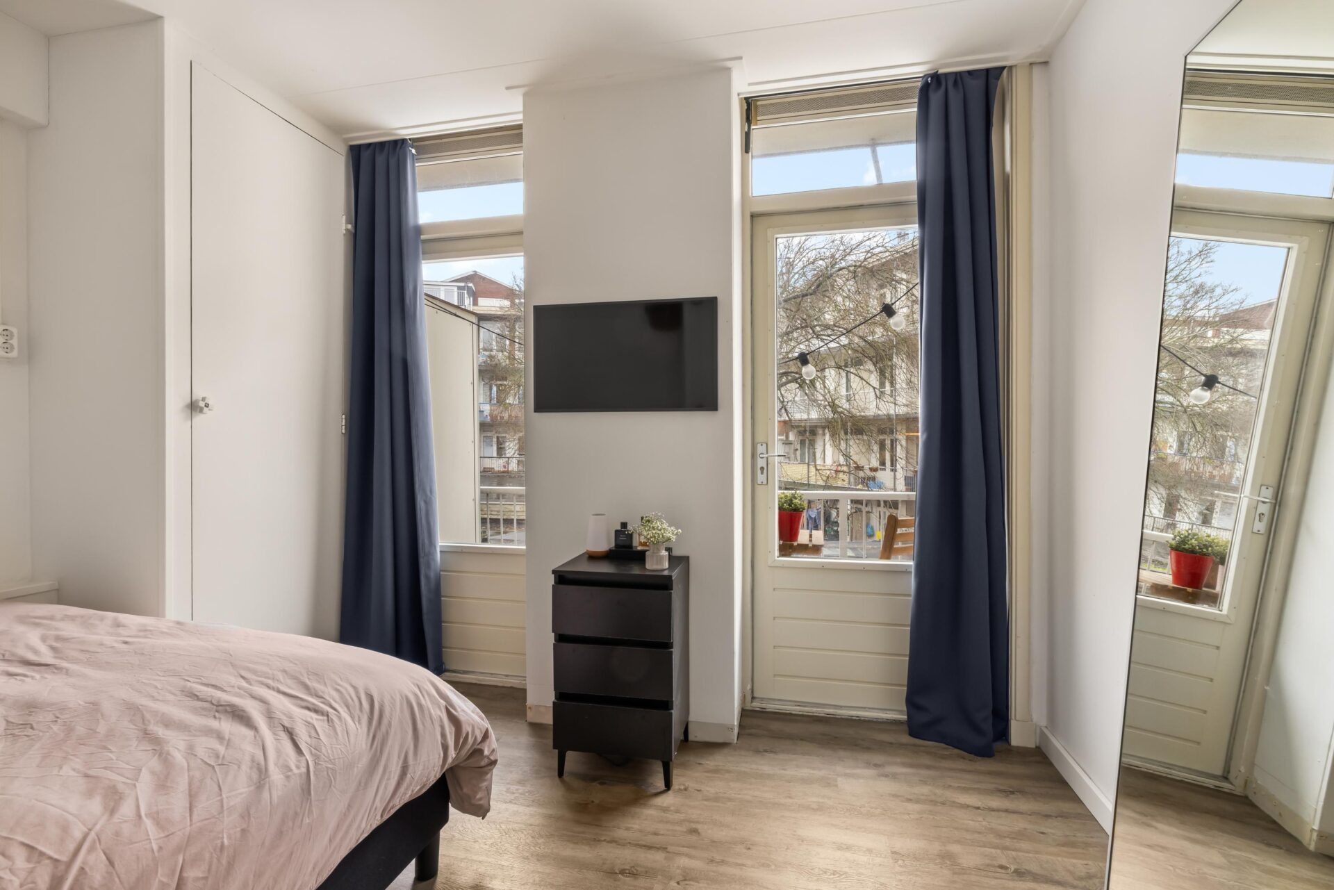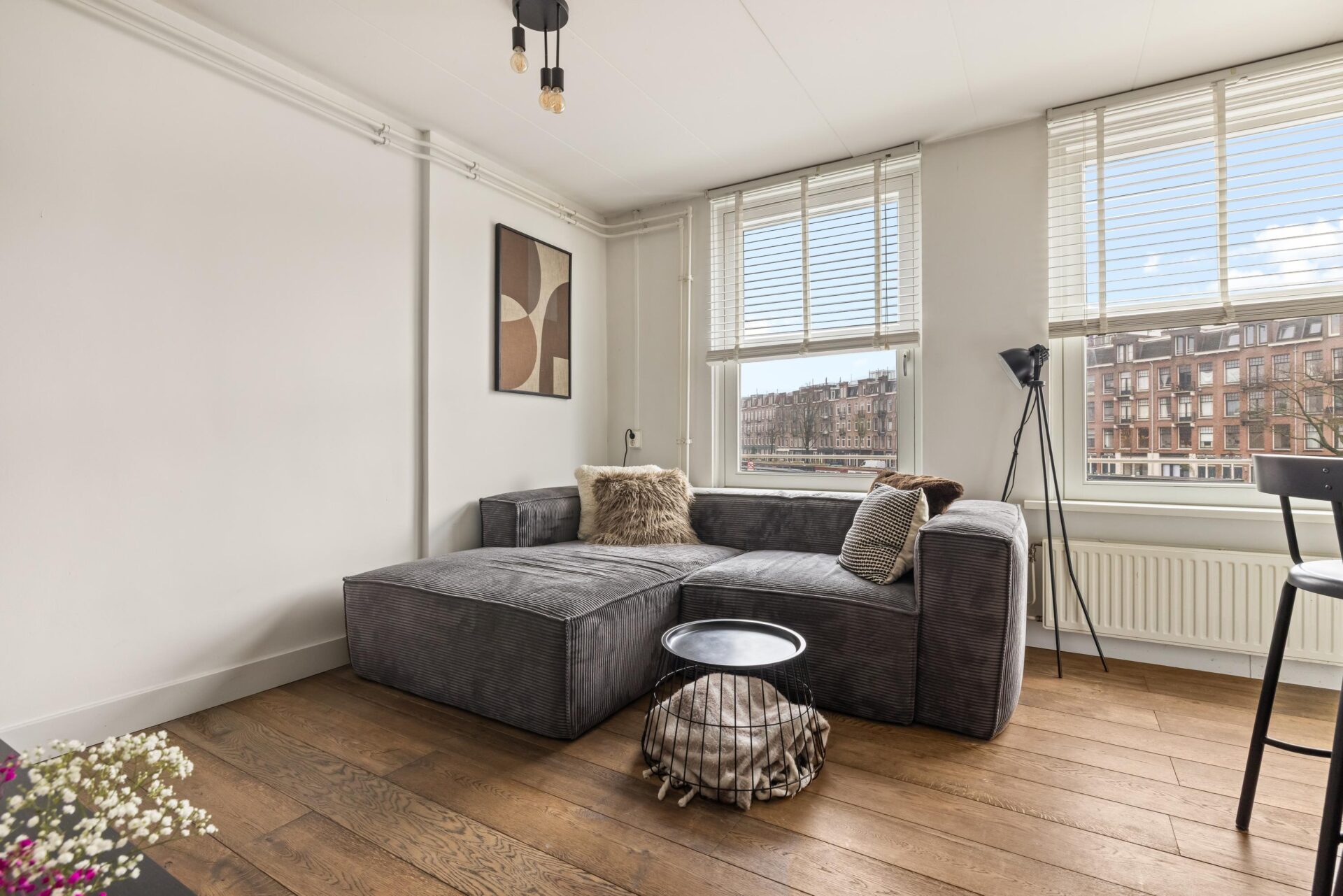 Via the neat communal stairwell you reach the apartment on the first floor. You enter into a pleasant hallway that provides access to all rooms. The front side is undoubtedly the eye-catcher of this apartment: a stunning view that never gets boring. From here you have front-row seats during King’s Day, Pride, and every summer when Amsterdam’s boats pass by in cheerful procession. Thanks to the large windows, this is a bright and inviting living space.