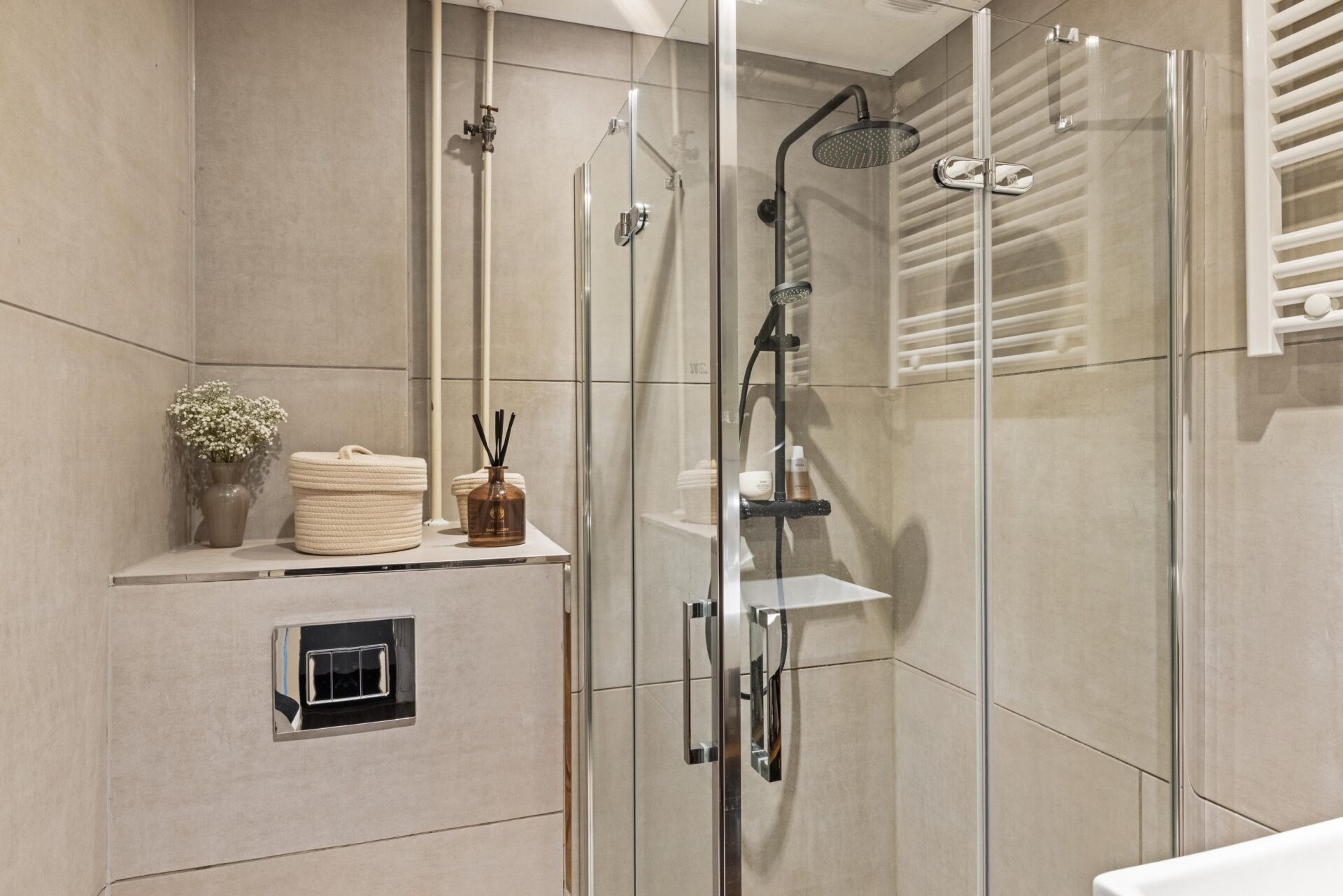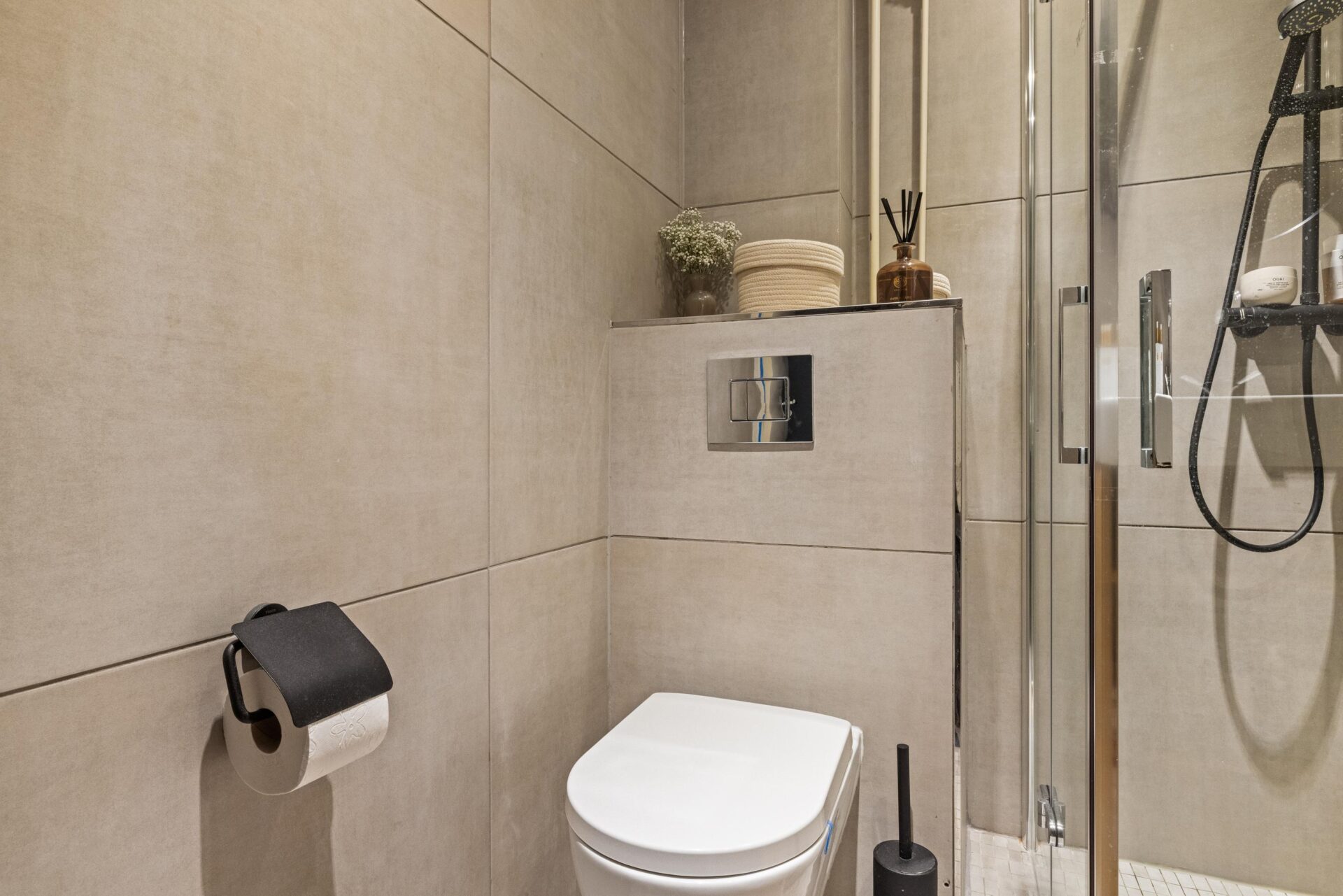De badkamer is modern en voorzien van een inloopdouche, toilet en wastafelmeubel.