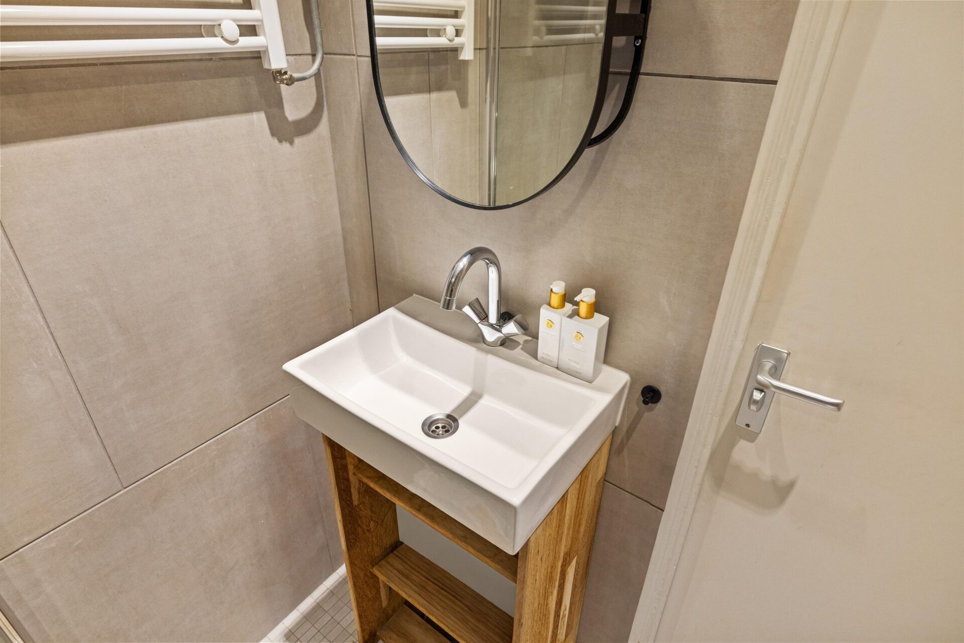 The bedrooms are located at the rear of the apartment. One room is currently used as a walk-in closet, but is also perfectly suitable as a home office or child’s bedroom. Both bedrooms provide access to the west-facing balcony, where you can enjoy the sun from around 1:00 PM until sunset ideal for relaxing in the sunshine after a busy workday.