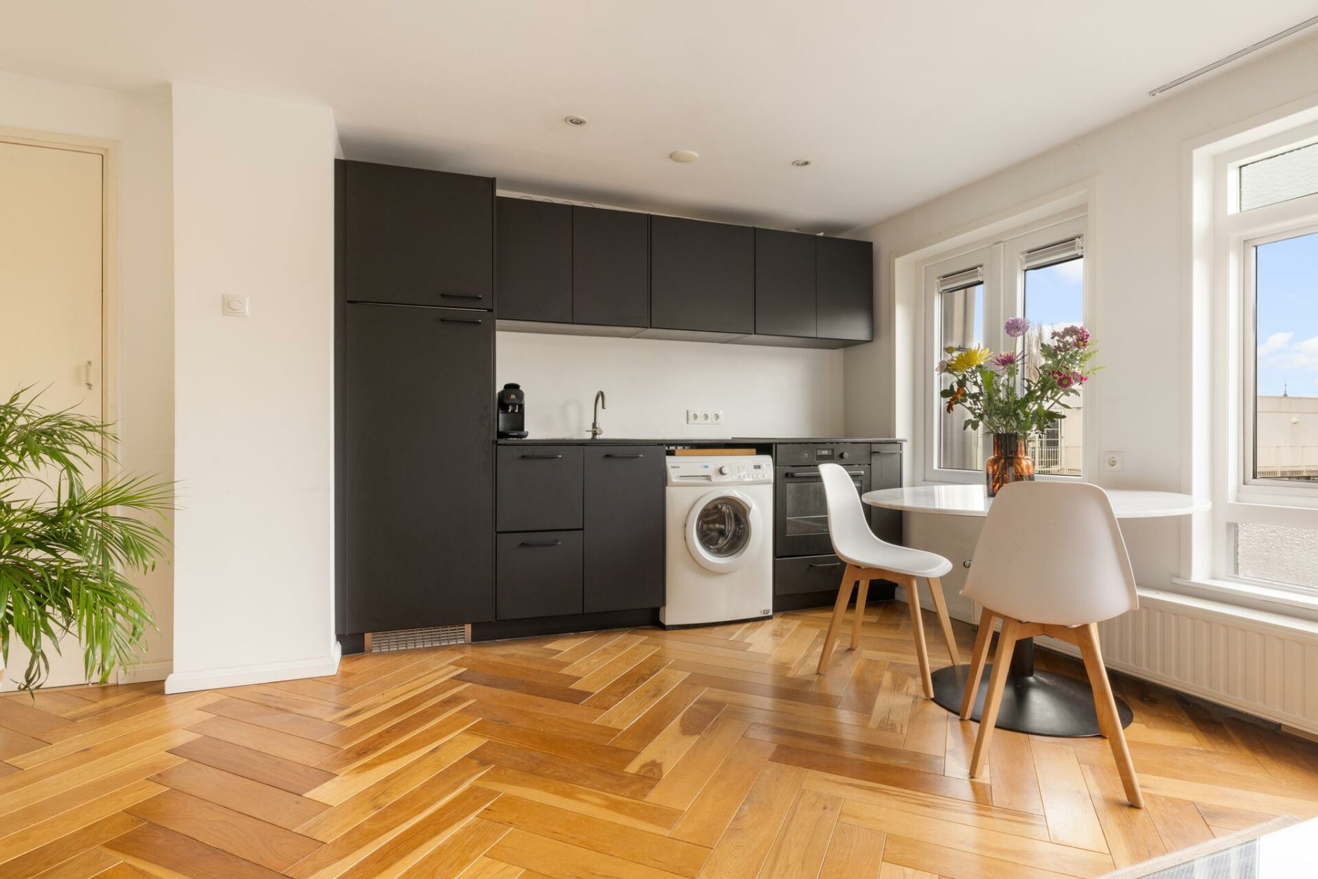 De woning is gelegen op de vierde etage en heeft een fijne indeling. Bij binnenkomst word je gelijk overspoeld door het fijne licht dat naar binnen komt. De woonkamer met moderne open keuken (2021) bevindt zich aan de achterzijde van het appartement. Er is hier genoeg ruimte voor een gezellige eettafel en lekkere zithoek. Elke vierkante meter wordt hier goed gebruikt. De nette badkamer is voorzien van een douche, wastafel en toilet. Grenzend aan de badkamer vind je de slaapkamer met dakraam.