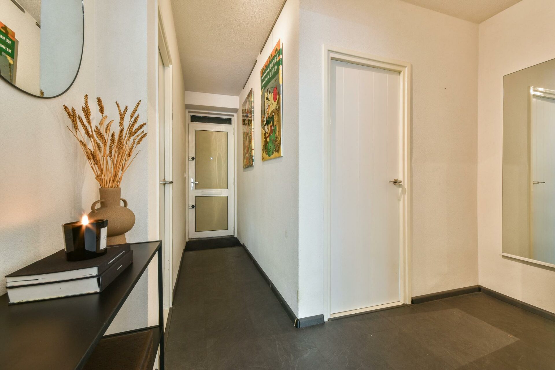 Vanaf het trappenhuis of de lift loop je via de galerij naar de entree van het appartement. Bij binnenkomst betreed je een tochtportaal met doorgang naar de centrale hal, die toegang biedt tot vrijwel alle vertrekken.