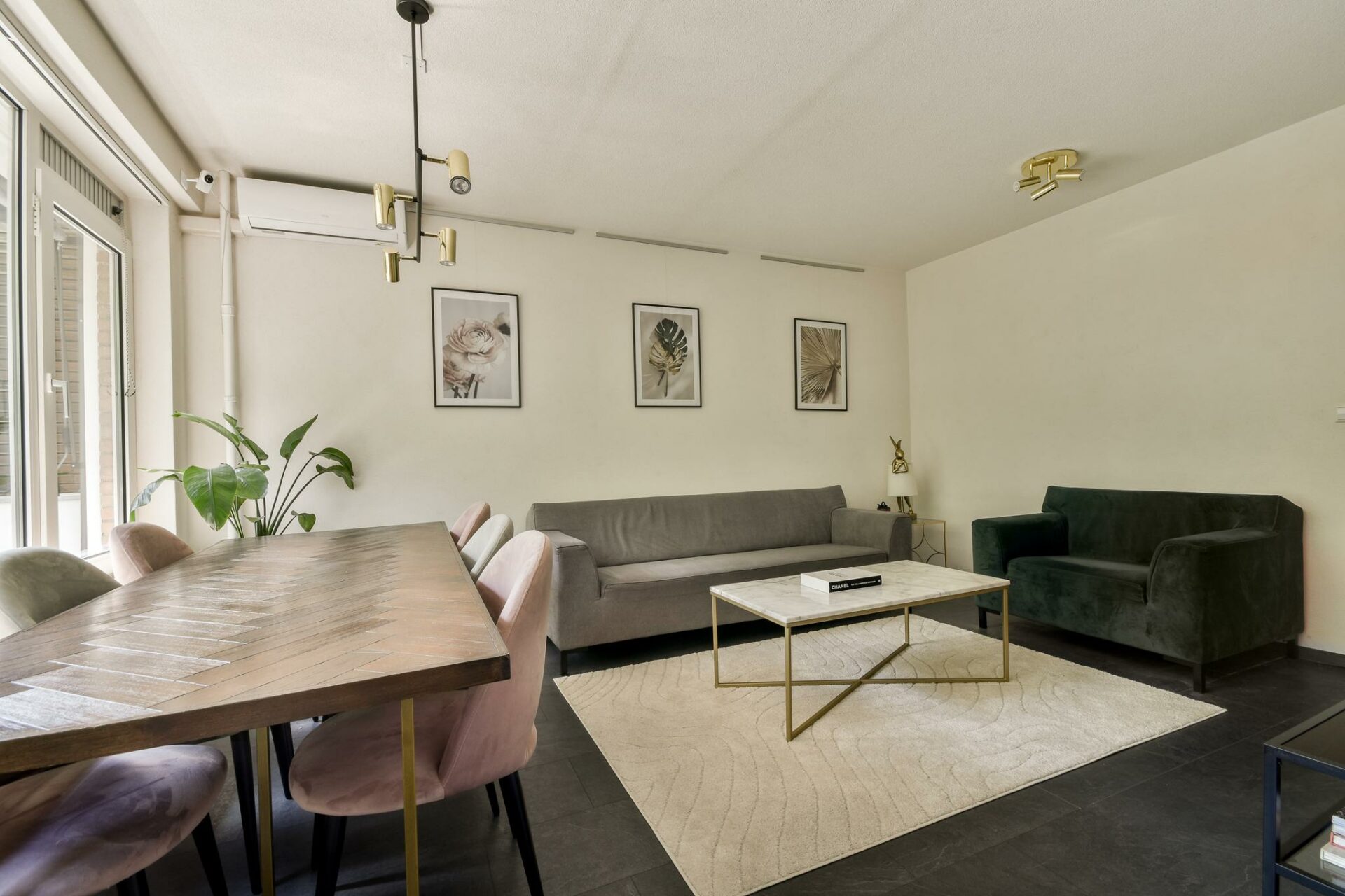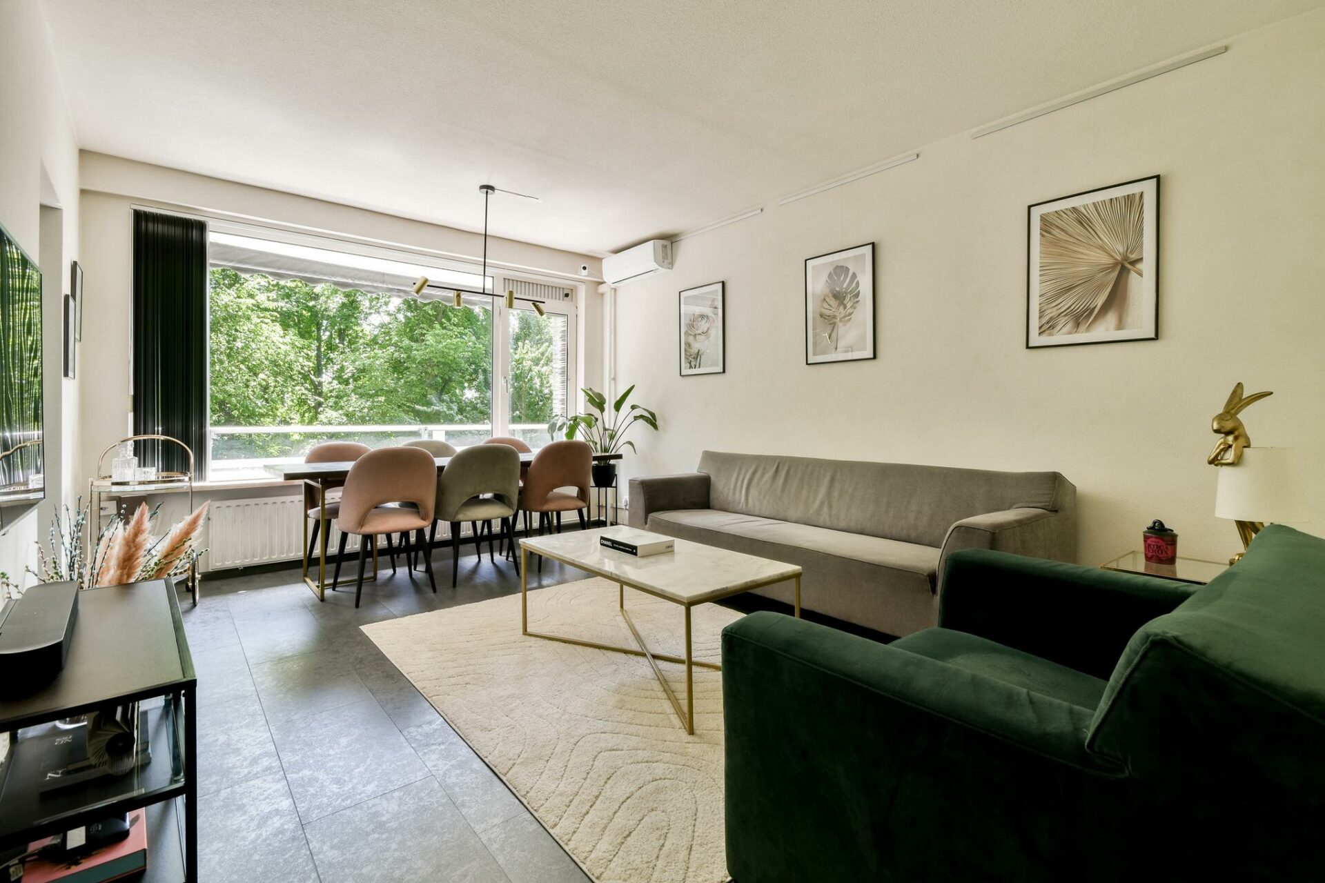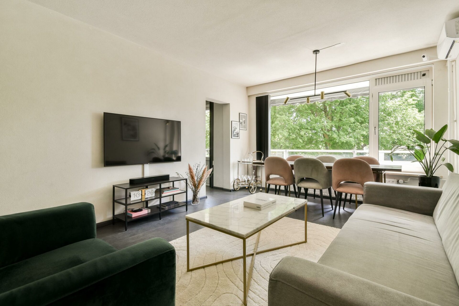 The living room is located at the rear of the apartment and stands out thanks to its large windows and abundant natural light. It offers views of the surrounding greenery and direct access to the spacious open kitchen. The living room easily accommodates both a comfortable sitting area and a large dining space.