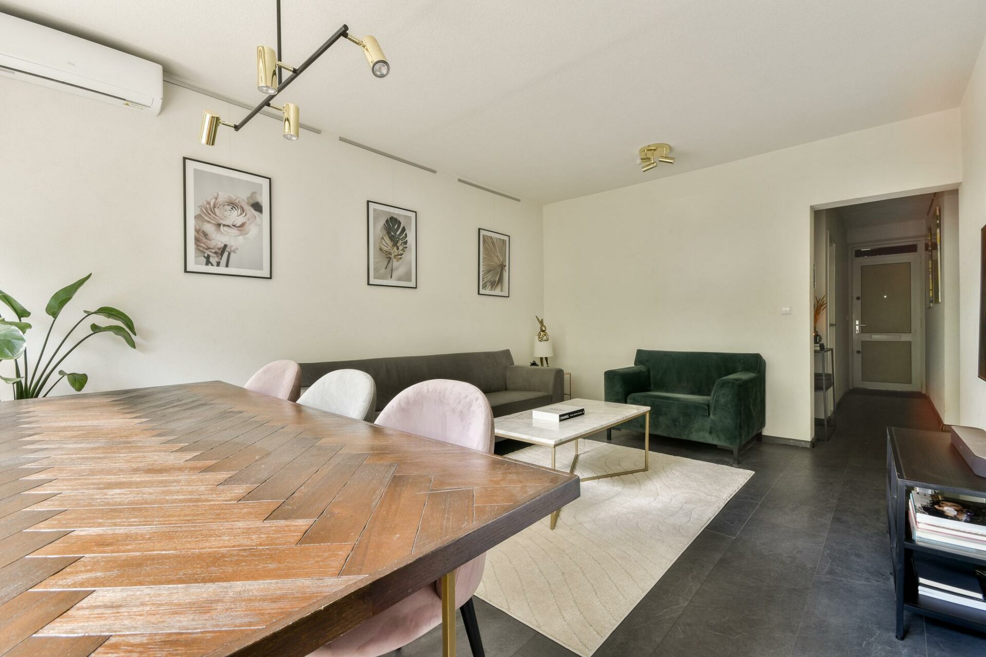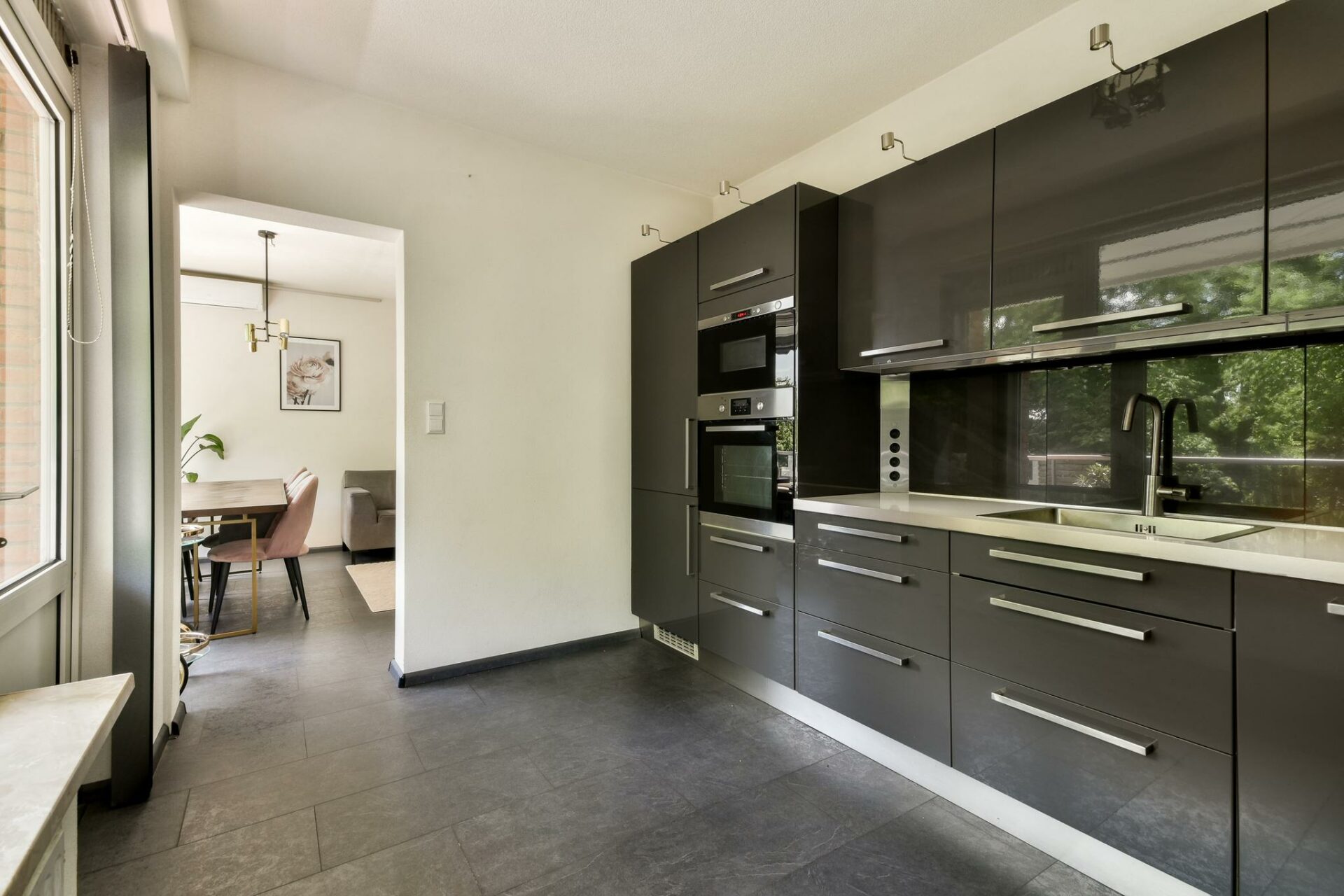 De woonkamer ligt aan de achterzijde van het appartement en valt direct op door de grote raampartij en de hoeveelheid licht, met uitzicht op het groen en directe toegang tot de royale woonkeuken. De woonkamer biedt meer dan genoeg ruimte voor een comfortabele zithoek én een royaal eetgedeelte.