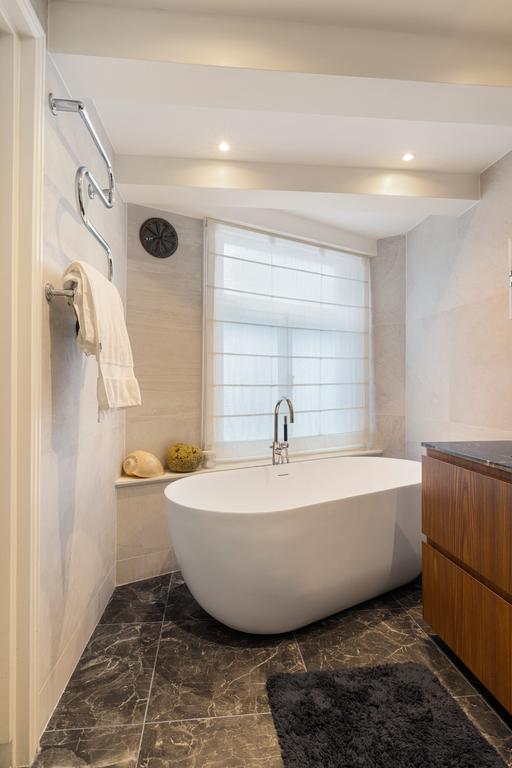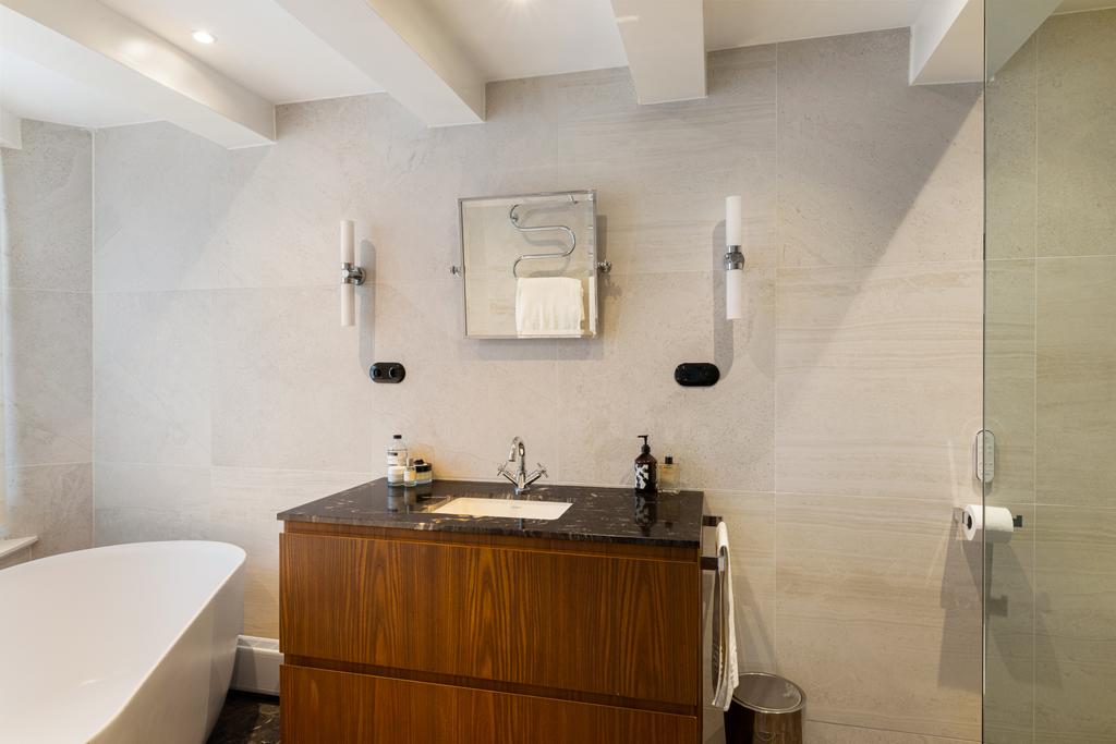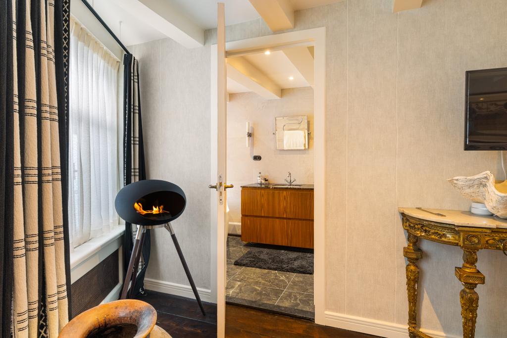 De trap in de hal brengt u naar de eerste etage. De eerste etage is ingericht als een luxe hotel kamer. Hier vindt u een werkkamer en een ruime slaapkamer. Deze verdieping is voorzien van een mooie houten vloer, open haard, houten balken en een grote glaspartij. De slaapkamer, gelegen aan de achterzijde, is van goed formaat en heeft een badkamer en-suite. Deze luxe badkamer heeft een vrijstaand bad, wastafelmeubel, inloop (regen) douche en een toilet. En niet te vergeten, een inloopkast grenzend aan de slaapkamer. Wie wil dat nou niet?