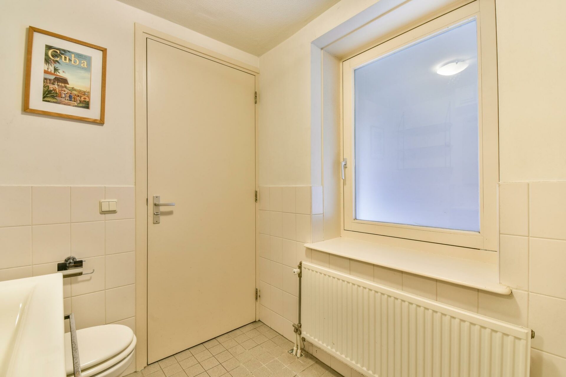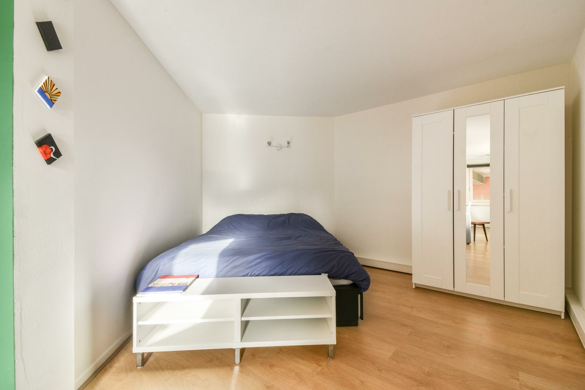 The bathroom has a washbasin, a shower and a toilet. You will also find a handy concealed built-in cupboard with the washing machine connection, the central heating and there is room to store belongings.