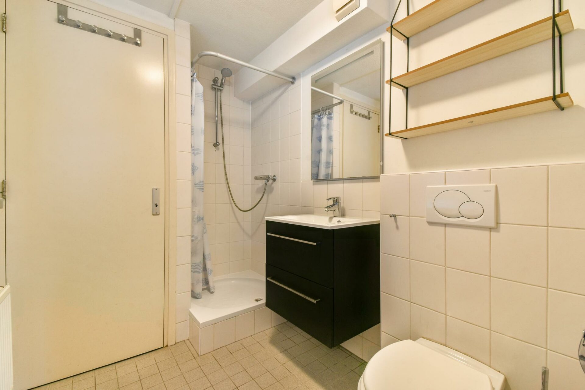 De badkamer is voorzien van een wastafel meubel, een douche en een toilet. Je vindt hier tevens een handig weggewerkte inbouwkast met de wasmachine aansluiting, de CV en er is ruimte om spullen op te bergen.