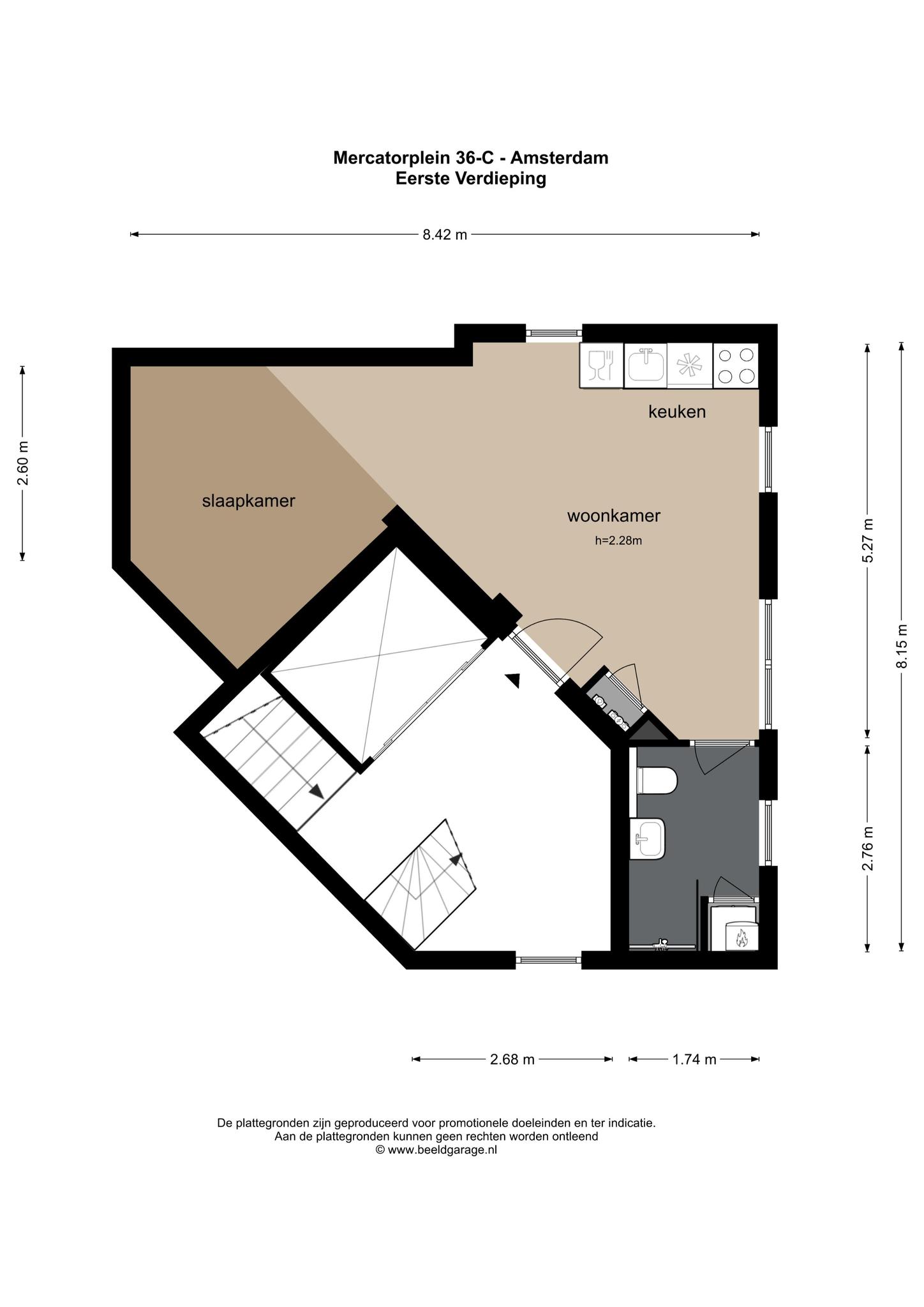Living at the Mercatorplein with a great view? This super nice studio-apartment of 37m2 located at the first floor of a well maintained building with elevator can be yours! The house has a playful layout, windows all around, a cozy living room with dining area and a spacious bathroom. Despite the bustling environment, it is very quiet inside because of the well-insulated walls and windows. Please contact our office to schedule an appointment.