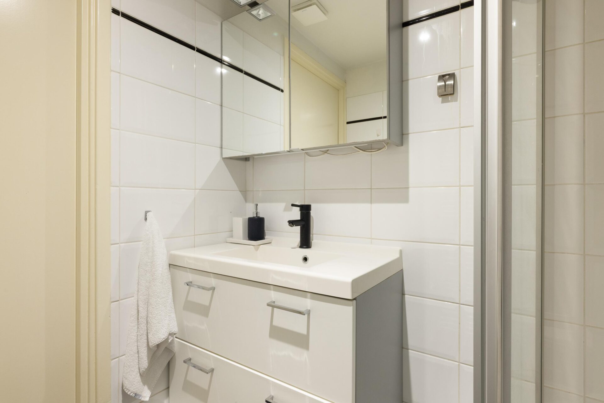 At the front of the apartment is the inviting kitchen, fully equipped with built-in appliances and offering ample space for a large dining table. An ideal setting for long, enjoyable dinners with friends or family. A new video intercom system has also been installed recently.
