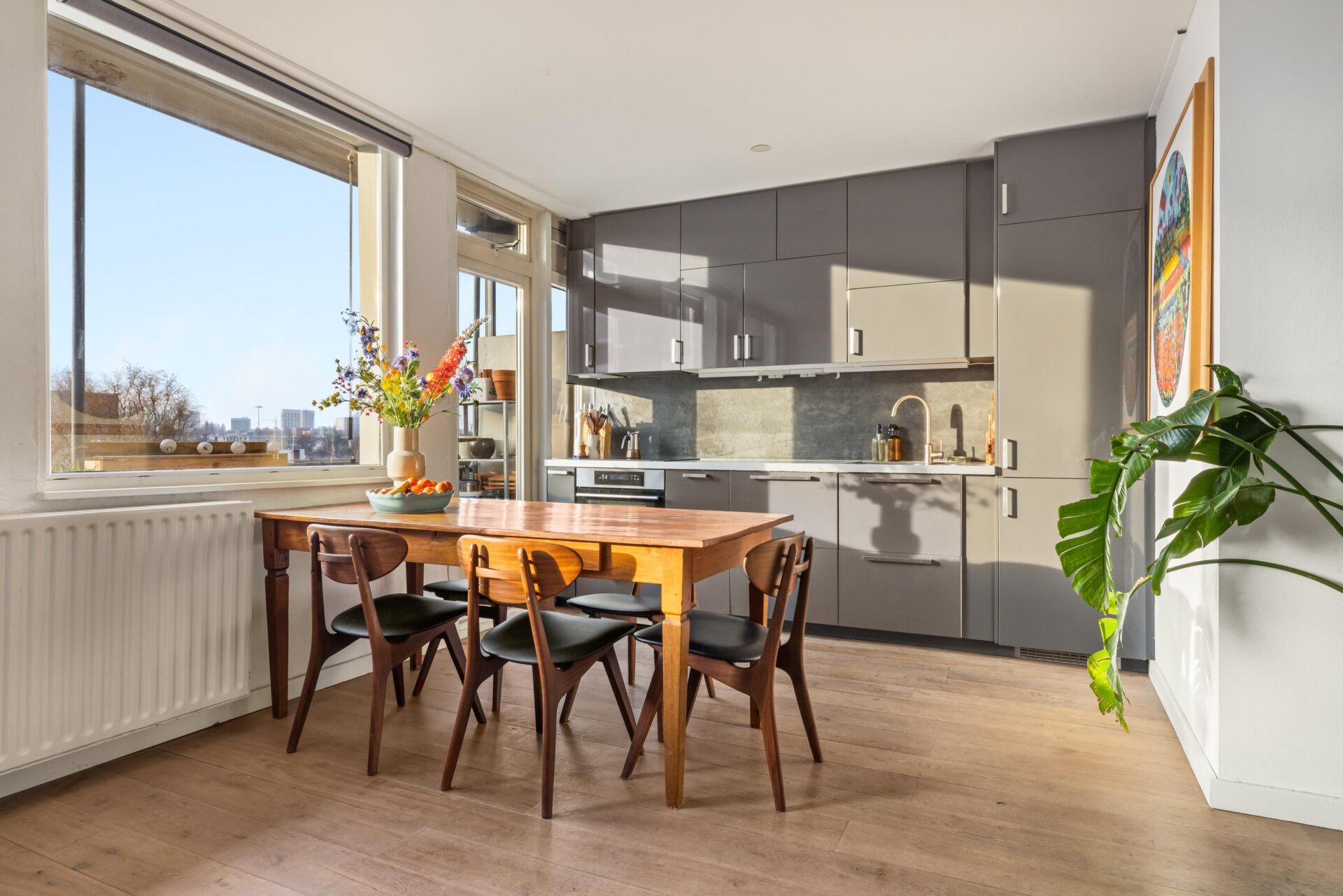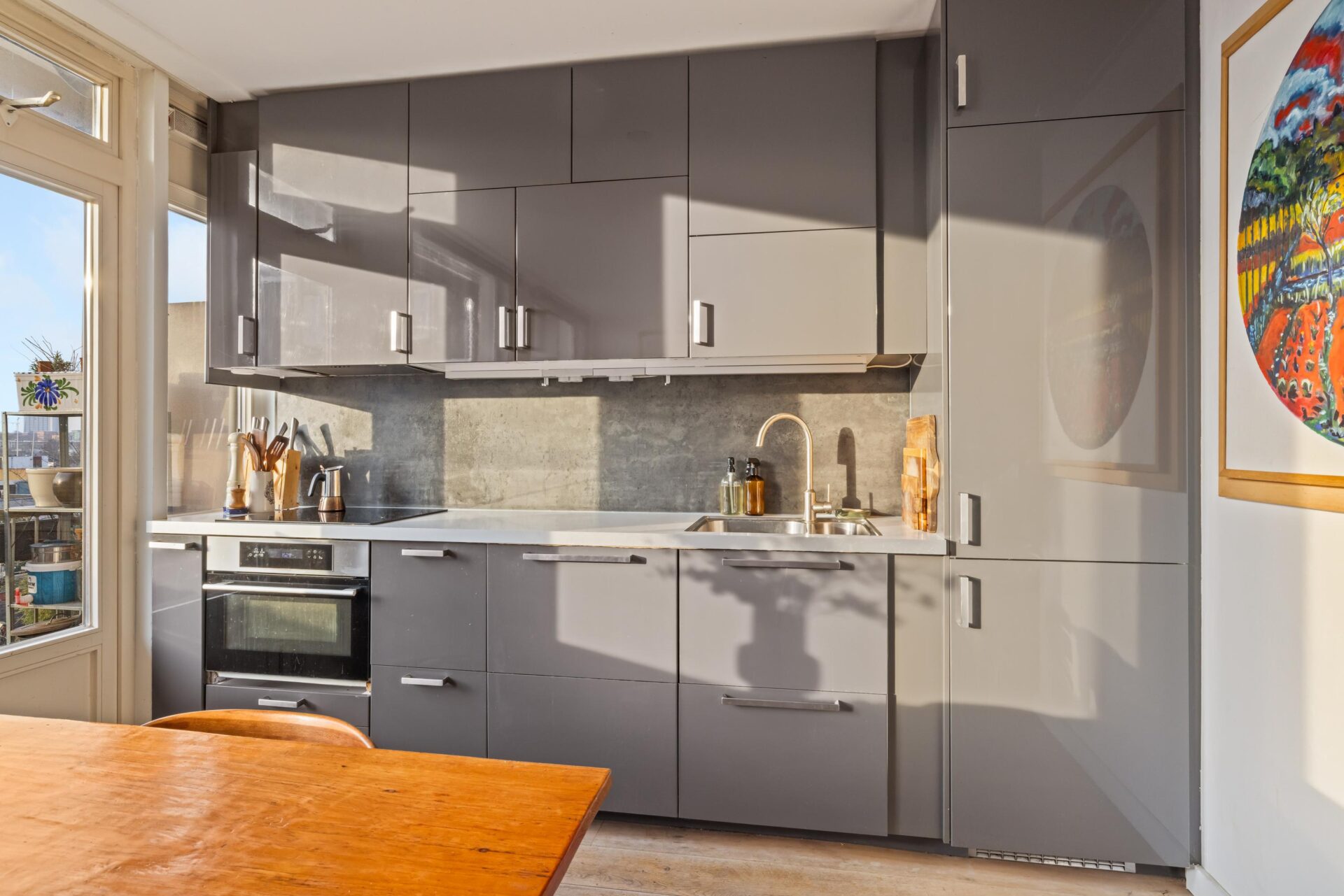 Via het trappenhuis bereik je de woning op de derde verdieping. Bij binnenkomst valt direct de prettige lichtinval op. De ruime woonruimte met open keuken is netjes afgewerkt met o.a een lamel parketvloer en biedt een prachtig vrij uitzicht, wat zorgt voor een extra gevoel van ruimte en privacy. De keuken beschikt over voldoende werk- en kastruimte en is voorzien van diverse inbouwapparatuur, waaronder een inductiekookplaat, afzuigkap, koelkast met vriezer, vaatwasser en combimagnetron.