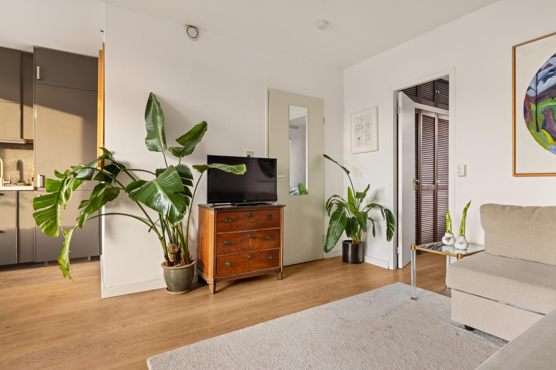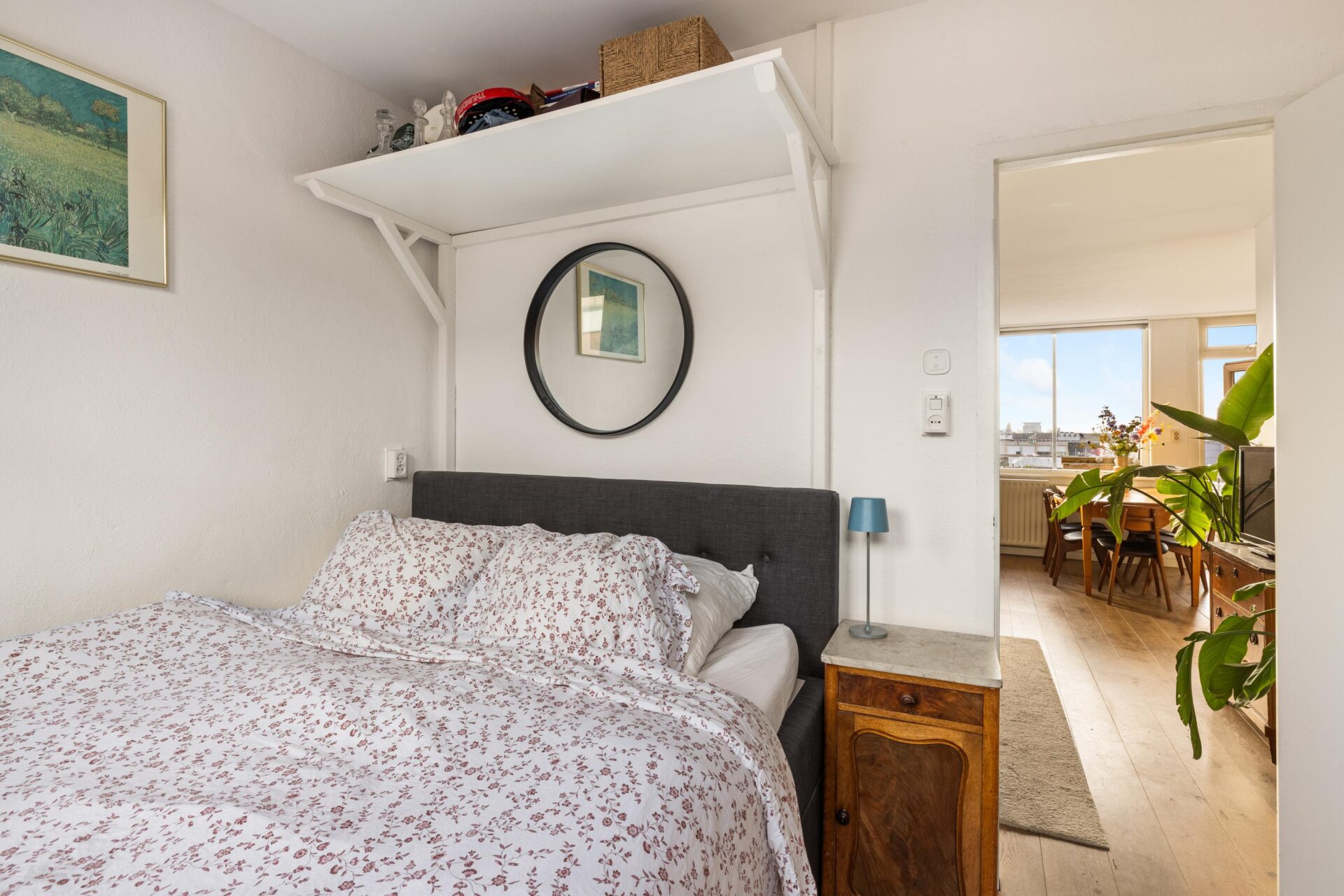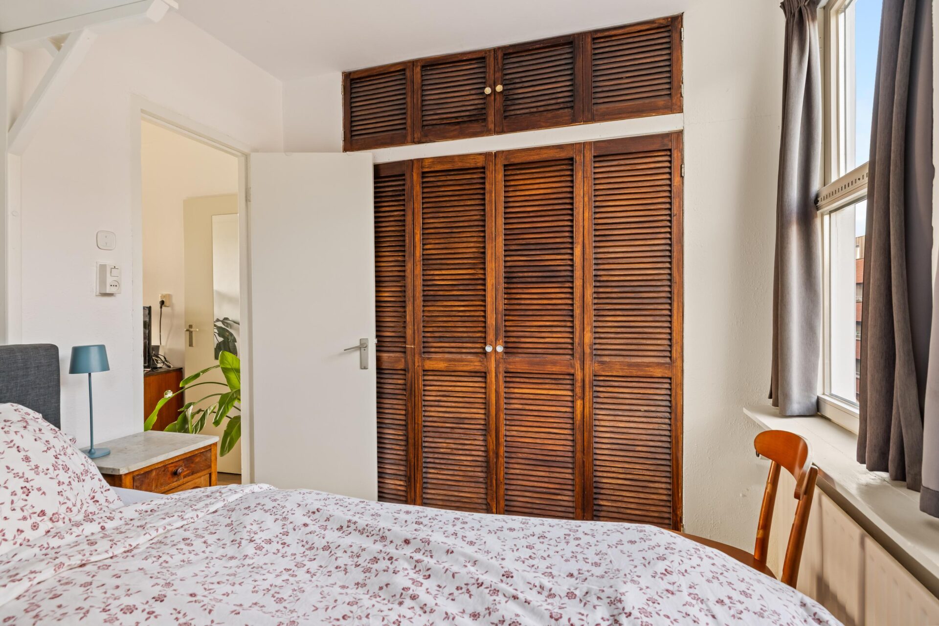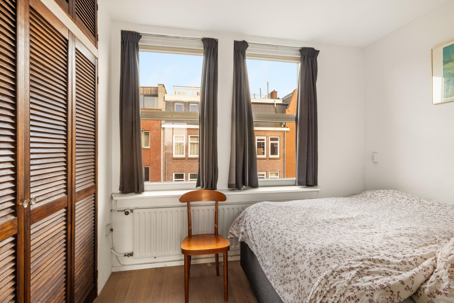 At the front of the apartment is the bedroom, located on a quiet street with only local traffic. The bedroom is large enough for a double bed and a generous wall of wardrobes.