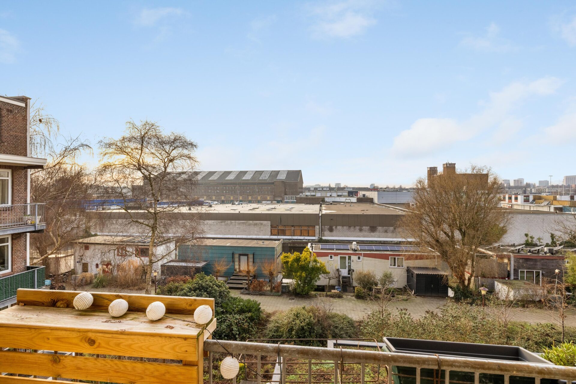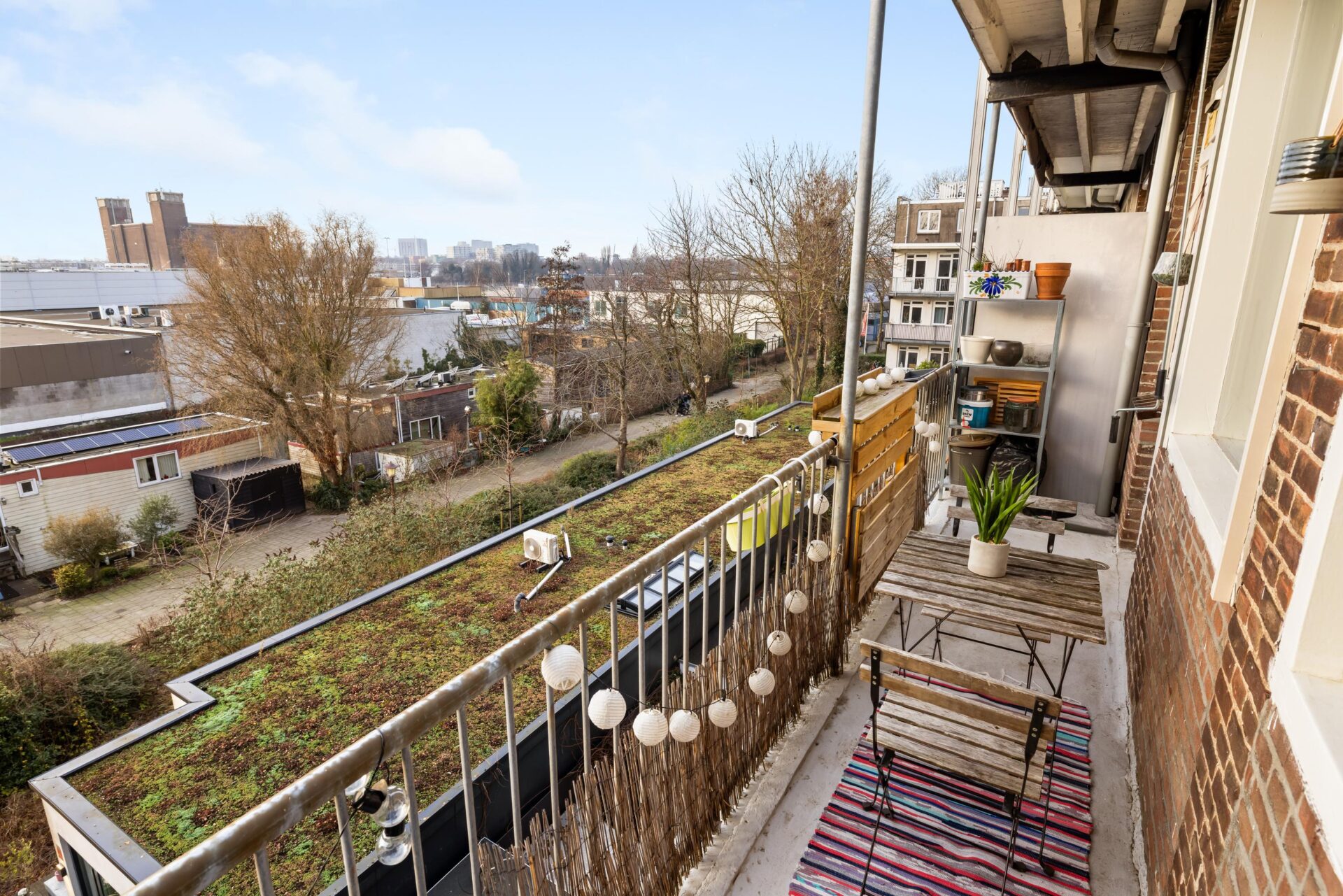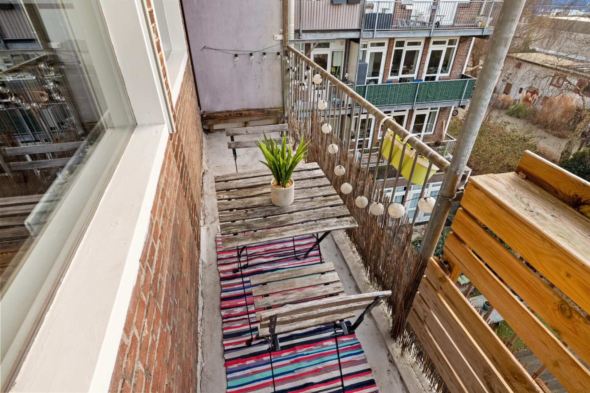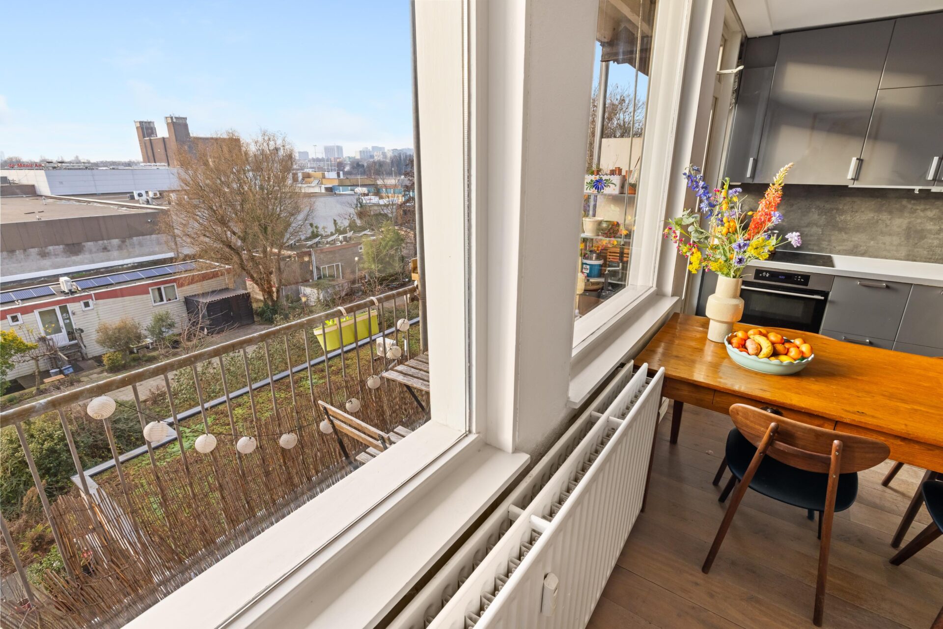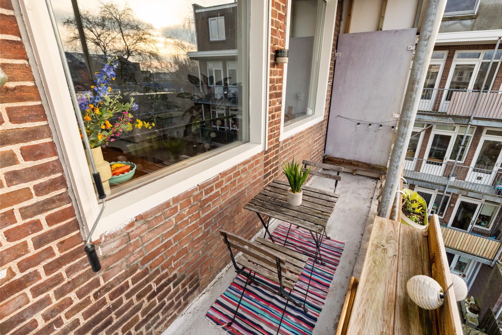 Het zonnige balkon is gelegen op het westen en biedt een vrij uitzicht. Hier kun je vanaf de middag tot aan zonsondergang heerlijk van de zon genieten — perfect na een lange werkdag.