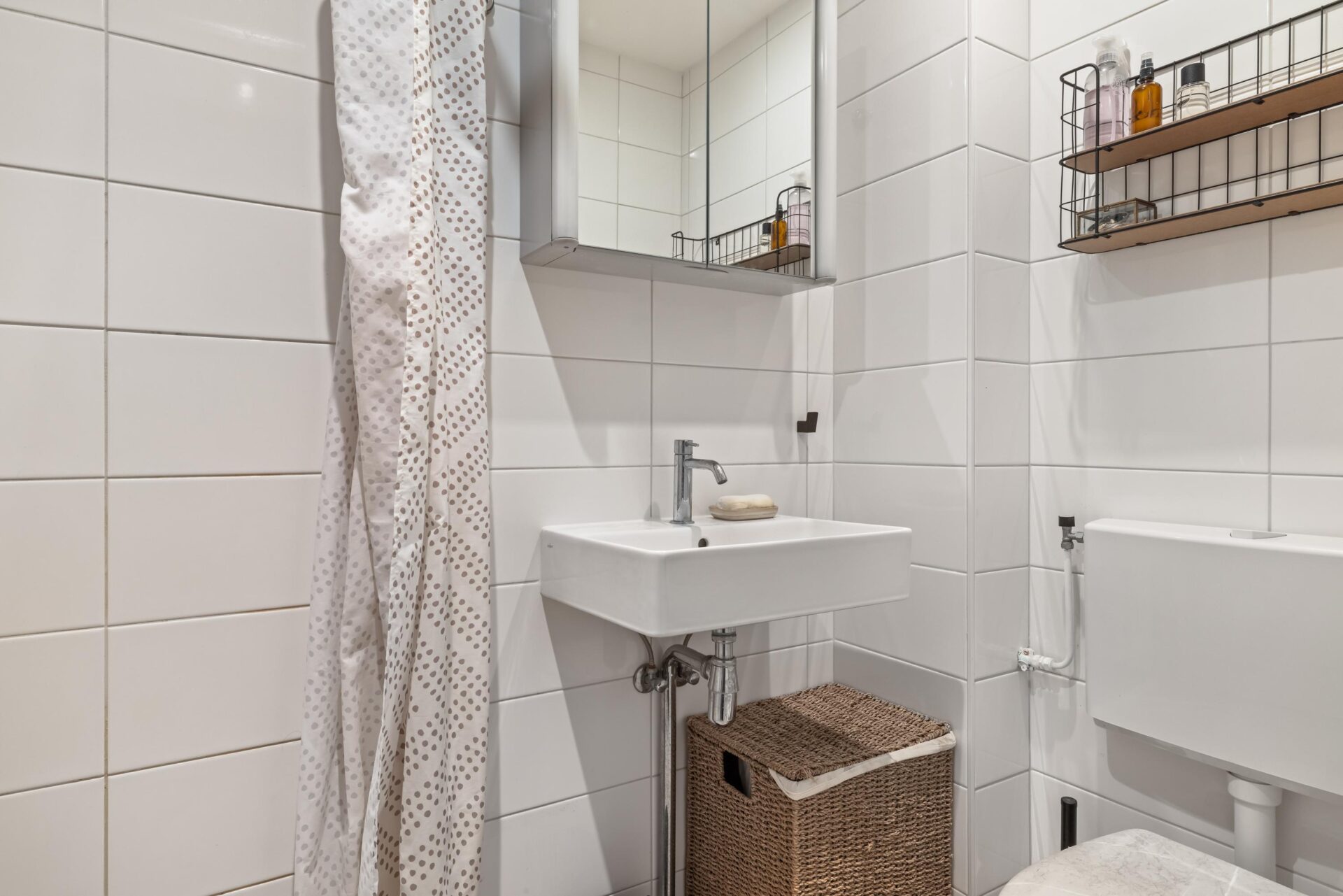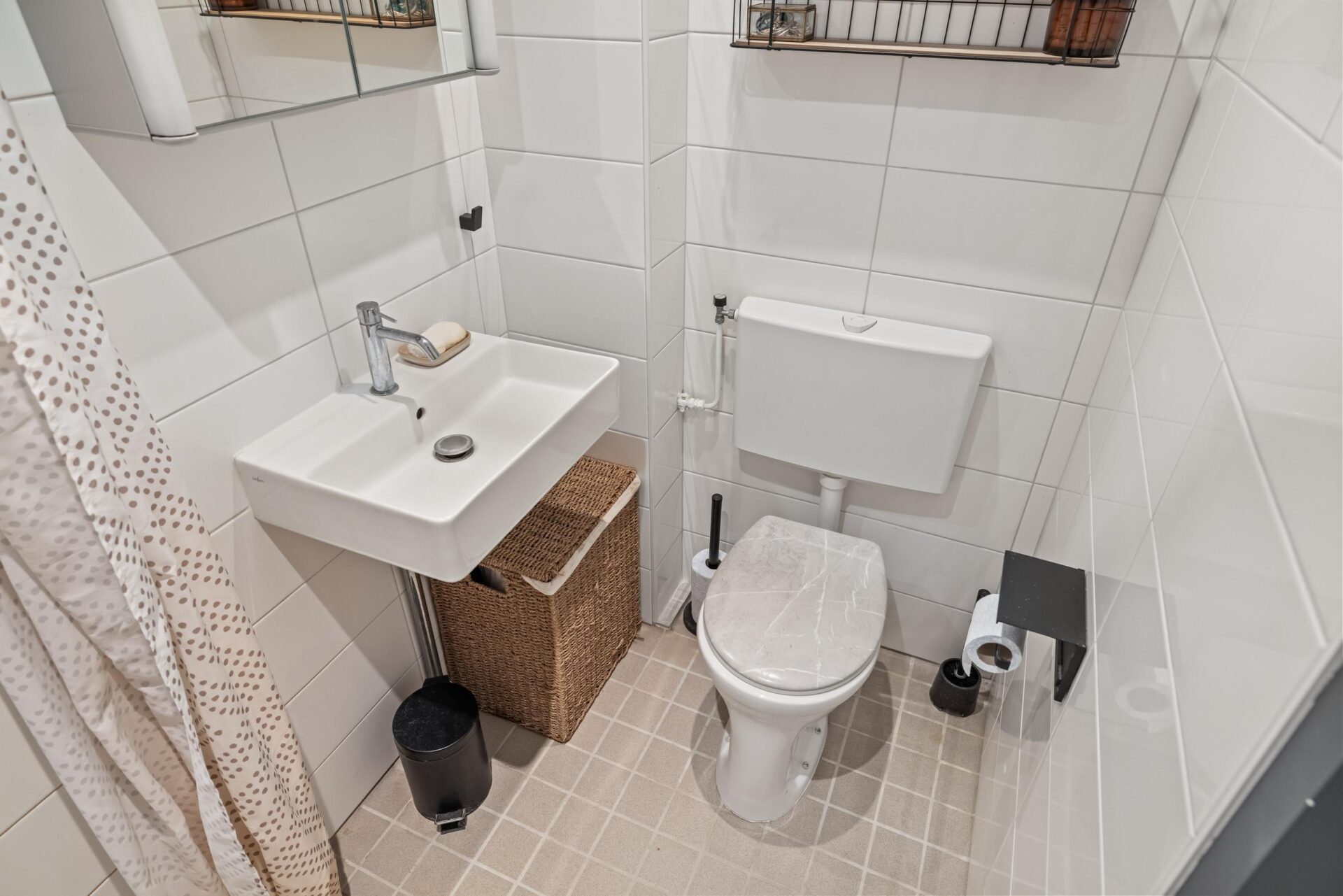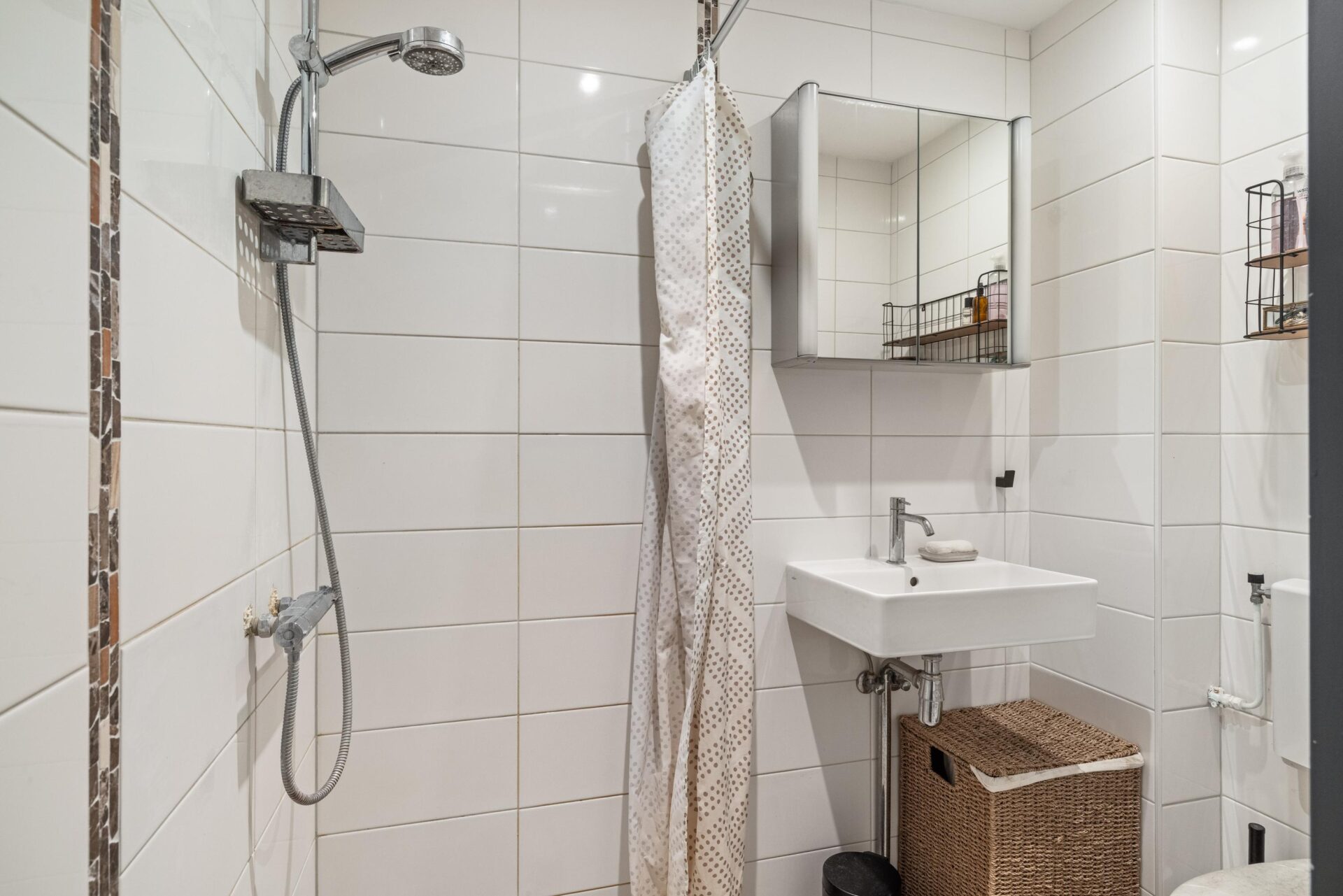 The neat and fresh bathroom features a shower, toilet, and washbasin. Separately, in the hallway, there is an internal storage room with connections for laundry appliances.