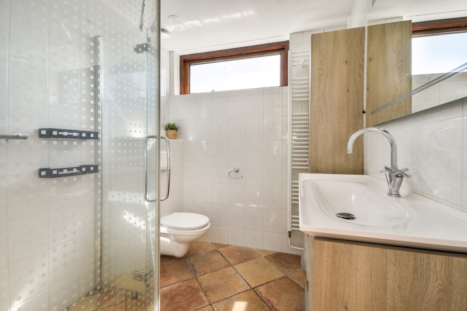 On the first floor, you’ll find the bedrooms and bathroom. The bedrooms are of good size, with the master bedroom featuring a built-in wardrobe. The bathroom is fitted with a toilet, vanity unit, and shower.