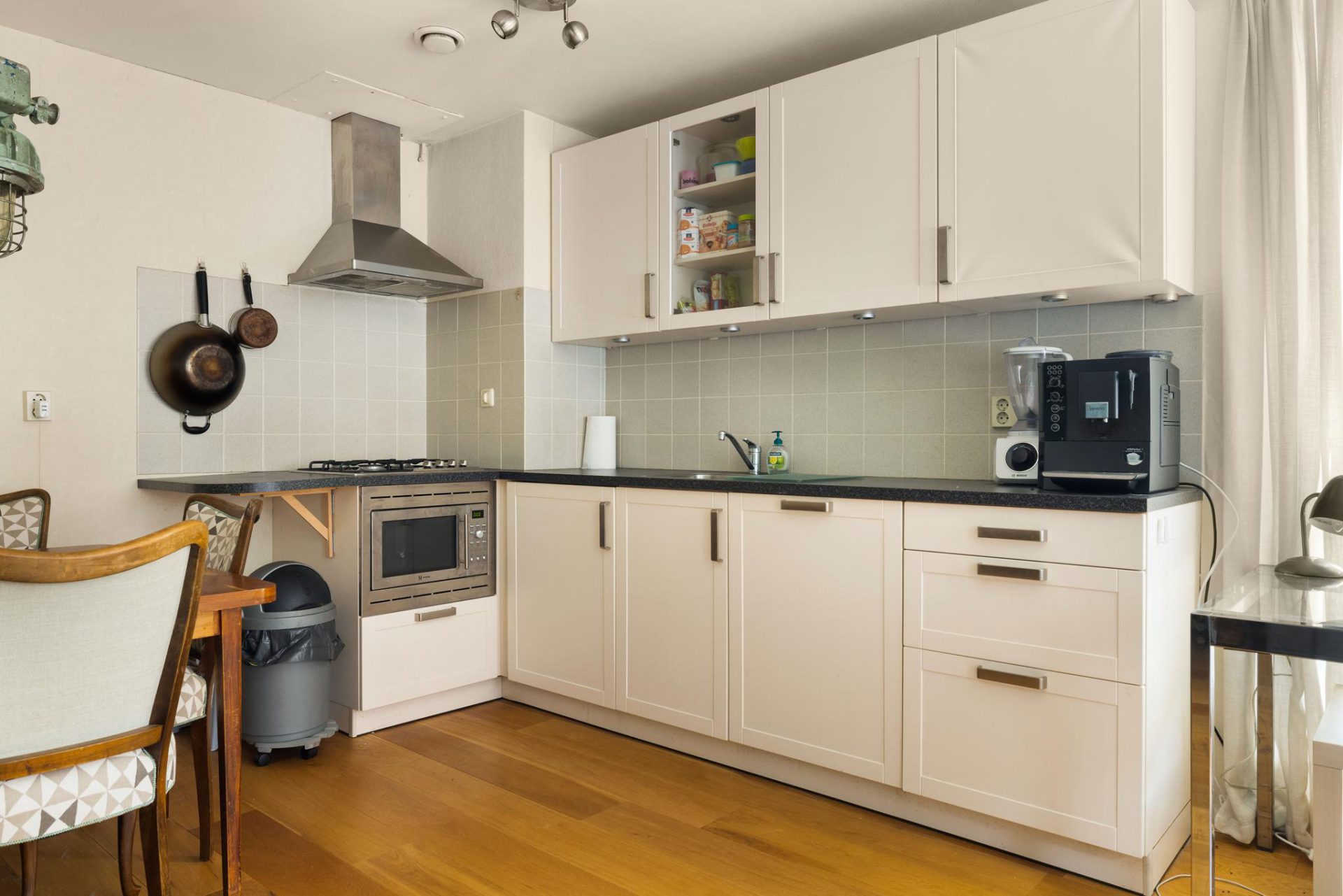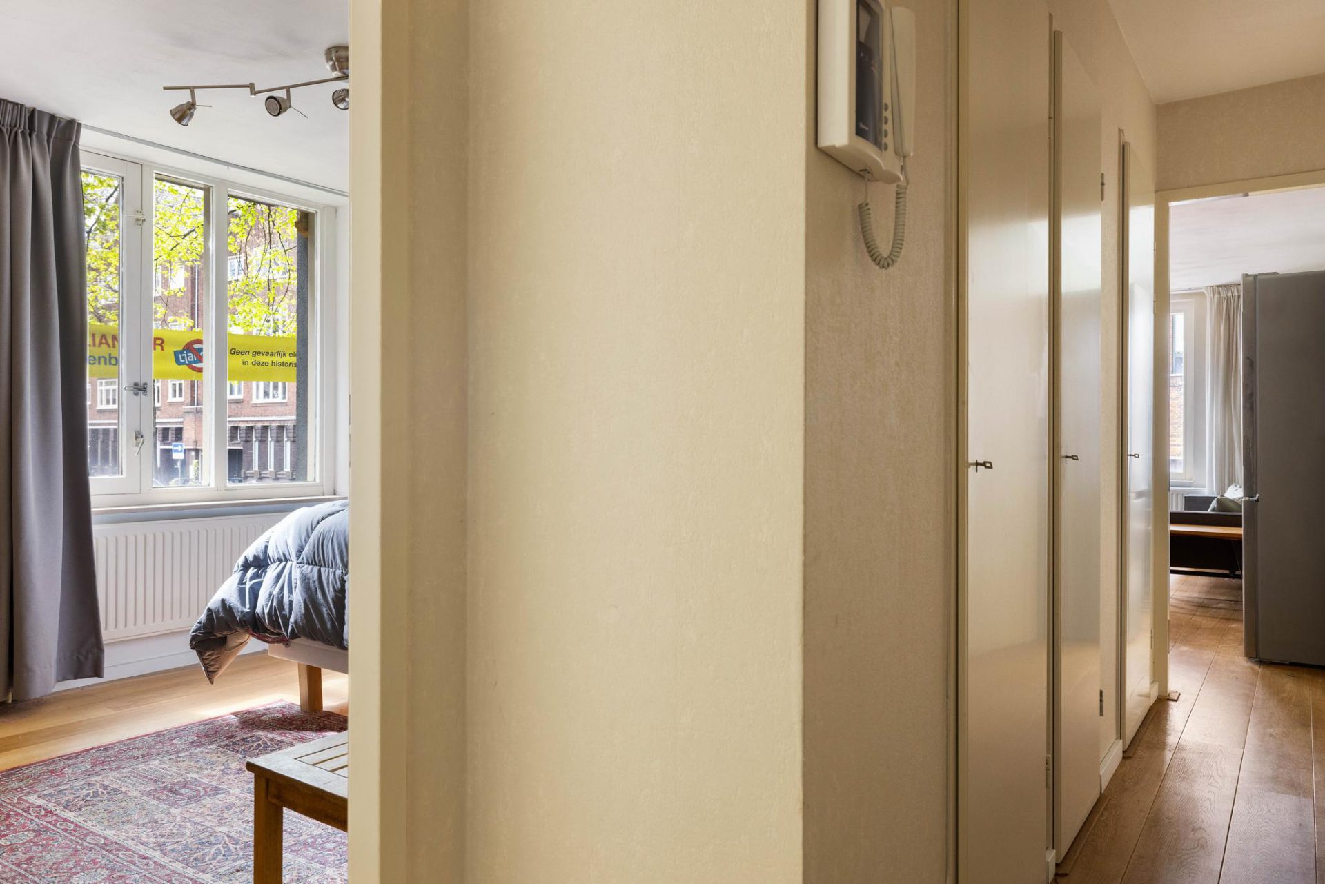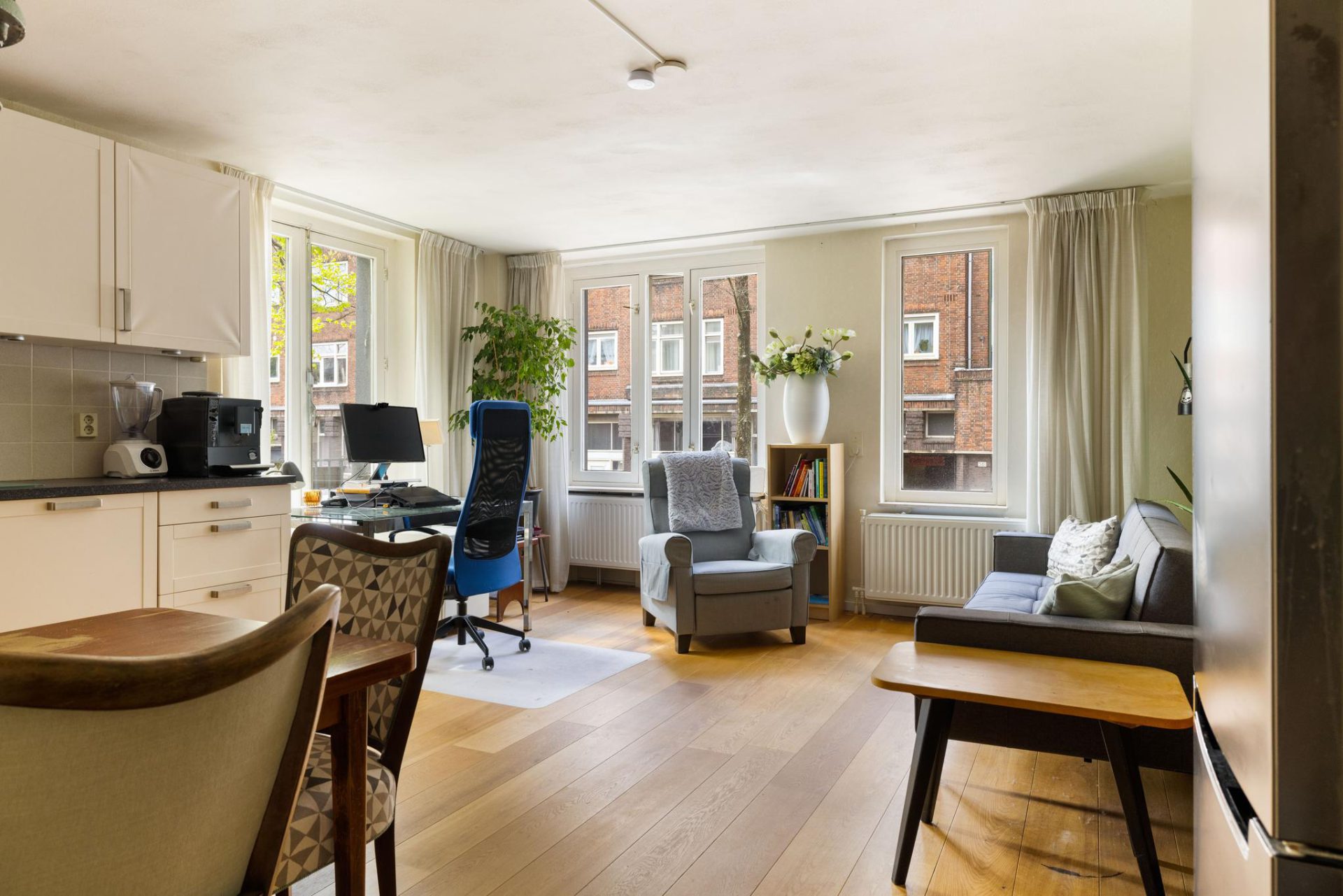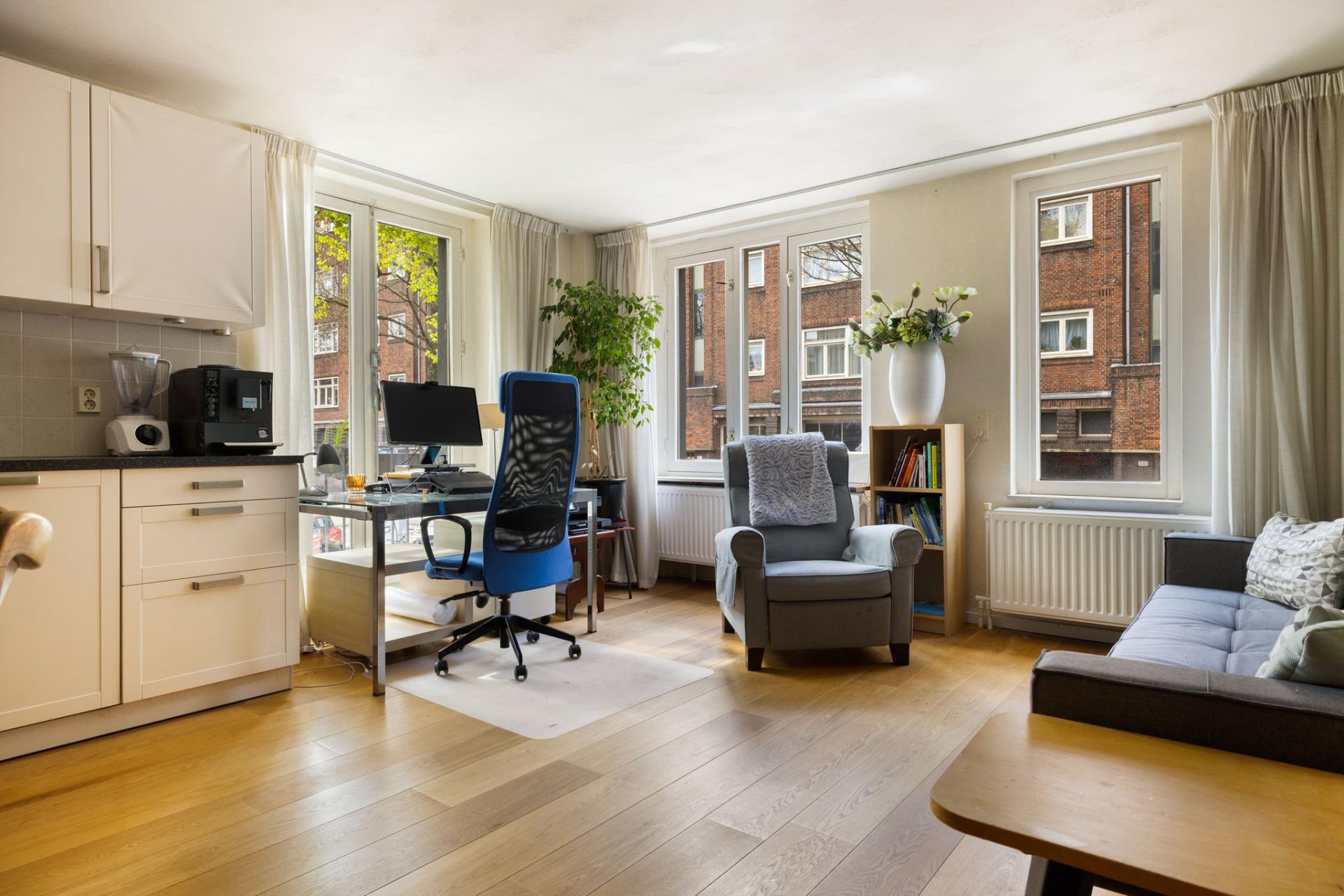 Middels de lift of het gezamenlijke trappenhuis bereikt u de eigen voordeur op de eerste etage. U komt als eerst binnen in de ruime hal, waar meer dan voldoende plek is om uw jassen op te bergen. De hal biedt toegang tot alle vertrekken, evenals de drie praktische inbouwkasten. De woonkamer is aan de voorzijde gelegen en heeft meer dan voldoende plek voor een zithoek, eethoek en thuiswerplek. De open keuken grenst aan de eethoek, en beschikt over een koelkast, vaatwasser, gasfornuis met 4 pitten en afzuigkap.