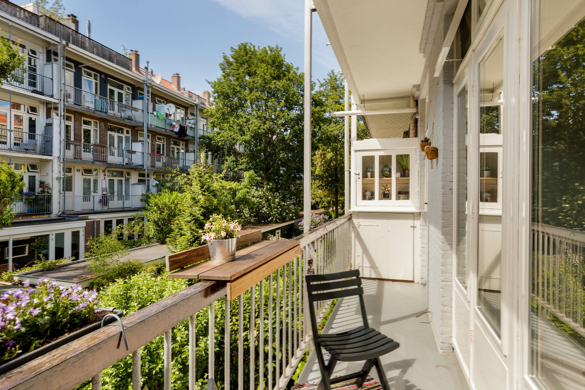 Via the staircase you reach the house on the first floor, you enter a clear hall that gives access to all rooms. Located at the front you will find the spacious living room, what a nice space! The large windows allow a pleasant light to enter. The cozy dining area can serve as a second bedroom via a wall. The spacious bedroom and modern kitchen are located at the rear. The bedroom (over 8m2) has fitted wardrobes, a sink and through the patio doors you reach the quiet balcony. The kitchen is fully equipped. You can also reach the balcony from the kitchen. Here you look out on the cozy and well-maintained inner gardens. The balcony is located on the west. The beautiful bathroom was renewed in 2018 and equipped with a toilet and a shower.