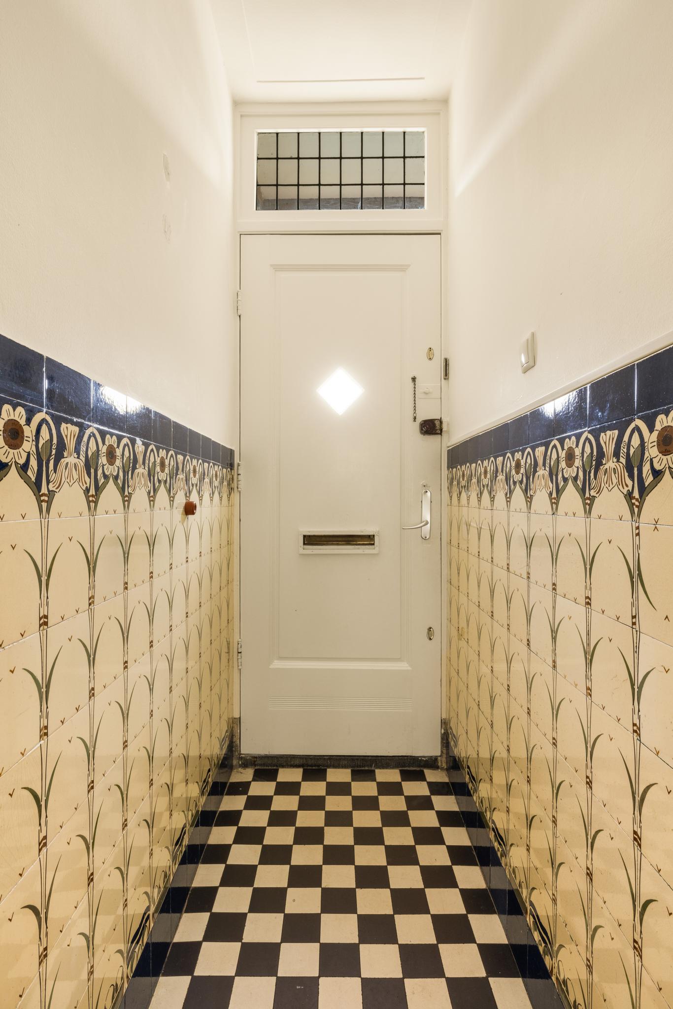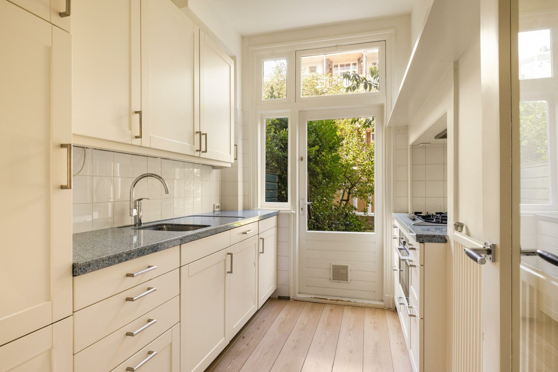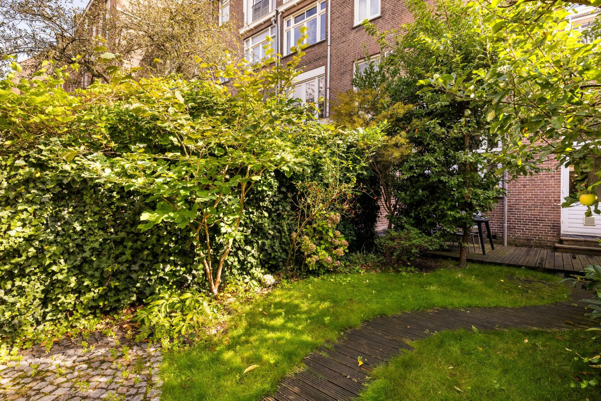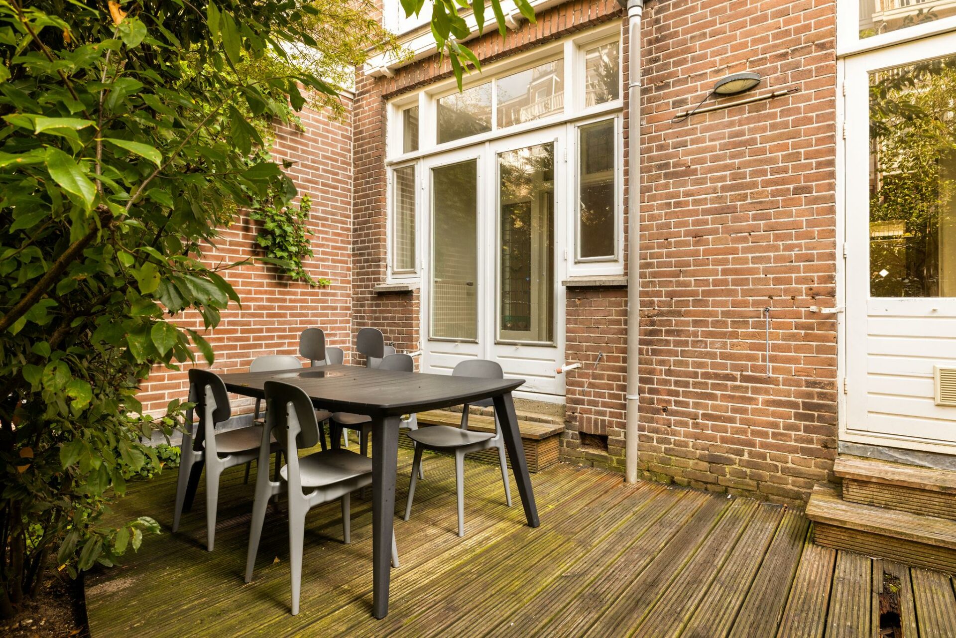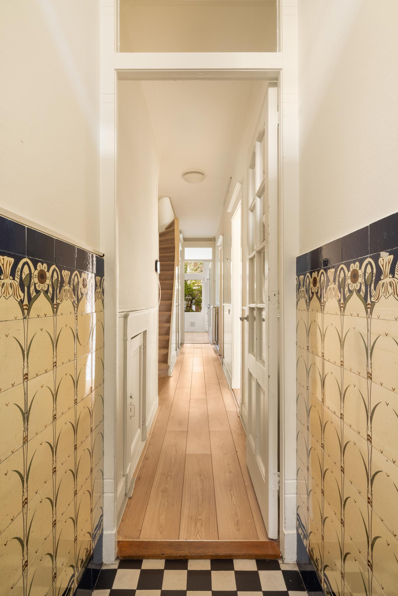 Middels je eigen voordeur betreed je de woning op de begane grond. Middels de hal bereik je alle vertrekken. De authentieke details zijn op deze etage mooi zichtbaar, en-suite deuren met handige inbouwkasten en een glas in lood raampartij met schuifdeuren naar de tuin. Als de zon hier naar binnen schijnt is het werkelijk waar een feestje! De keuken vind je aan de linkerzijde en ook middels deze ruimte bereik je de tuin. De tuin is ca. 55m2 en voorzien van een tuinhuis met verwarming, een toilet en er liggen zonnepanelen op het dak. Wij hoeven natuurlijk niet te vertellen wat er allemaal mogelijk is met zo een tuinhuis.