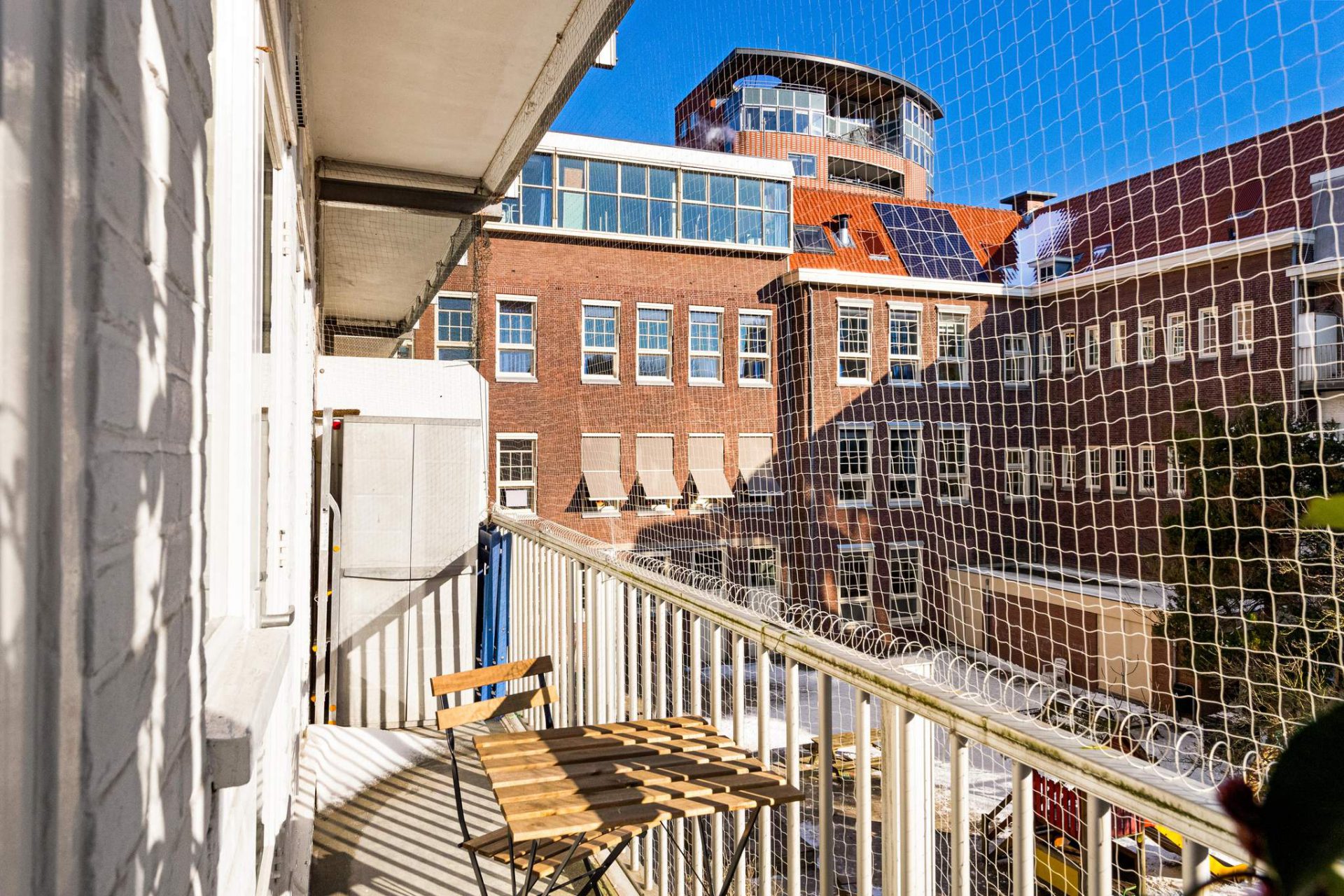 Via the neat and wide staircase you reach this nice apartment on the second floor. You firstly enter the cozy living room. The living room is a beautiful bright space due to it’s large windows. From there you have a wide and open view to the front, towards the Ceramplein. The kitchen is located at the front. The kitchen is equipped with a 4-burner gas stove and a separate fridge / freezer and combi-microwave. At the rear you will find the bedroom. This bright bedroom is of a very good size. You have the option of converting this into 2 bedrooms. Through French doors (and a regular door) you reach the balcony, located on the east. The balcony spans over the entire rear of the house and from here you have a beautiful and unobstructed view. The bathroom, located in the middle of the apartment, has a bath, sink, toilet and washing machine connection.