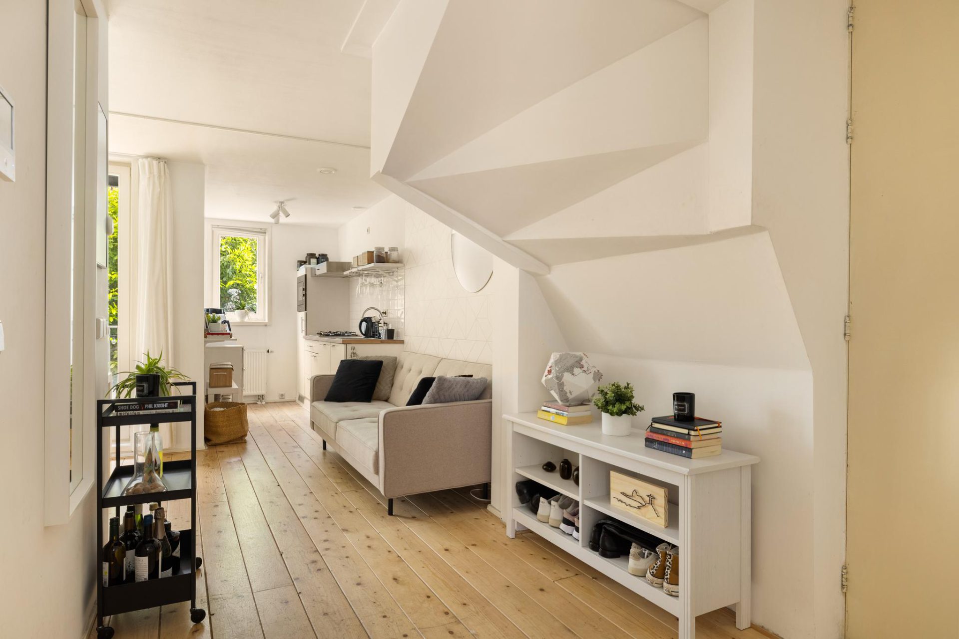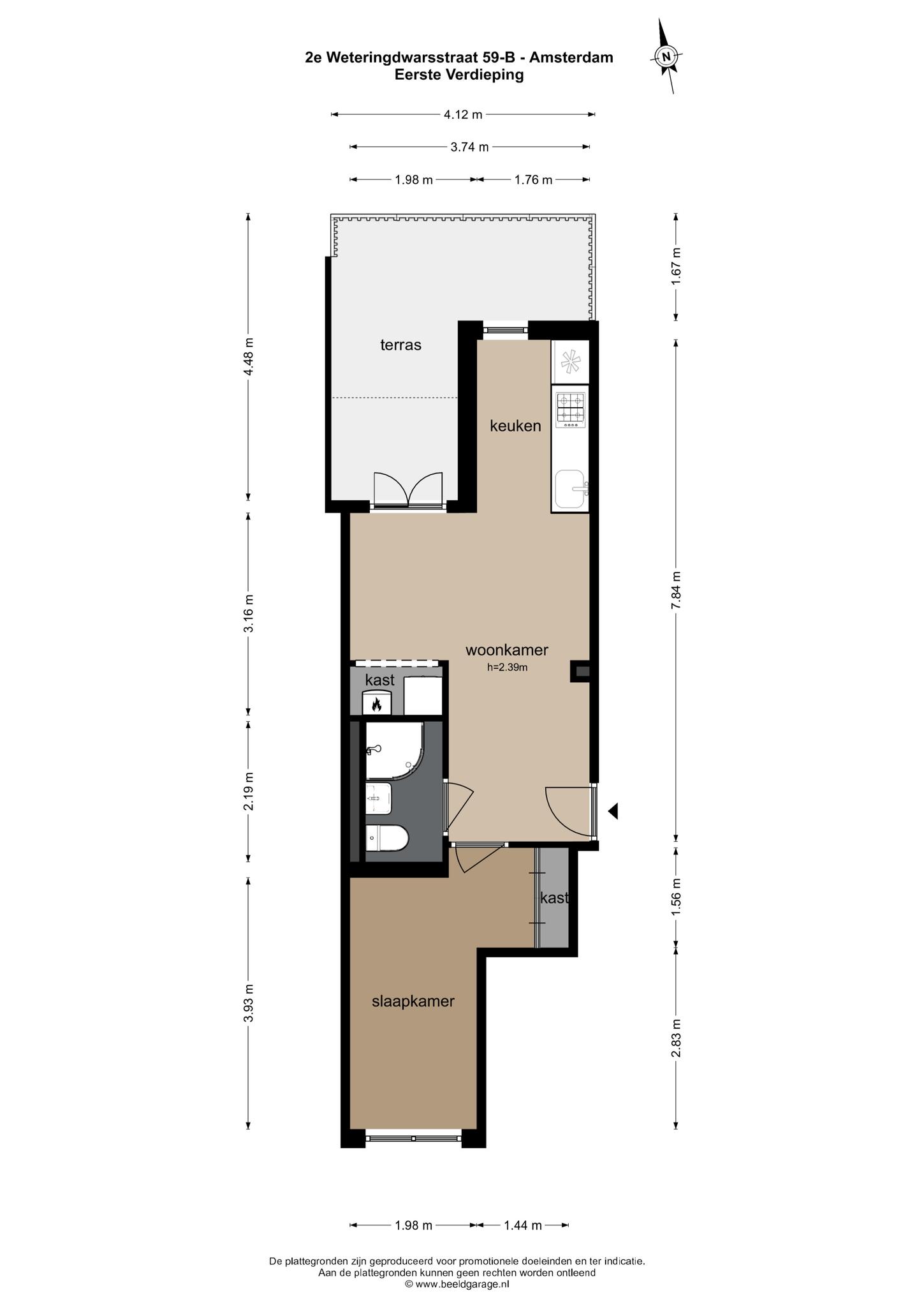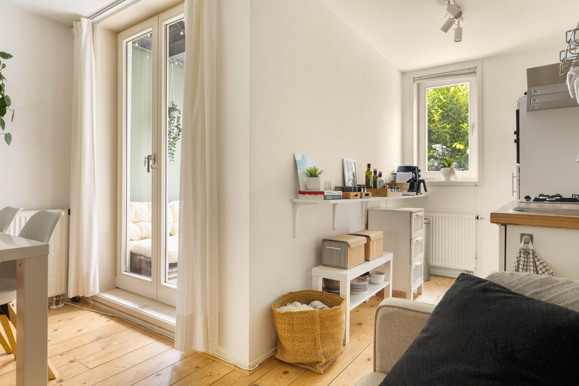 Via de gemeenschappelijke entree bereikt u de voordeur van het appartement op de beletage. Bij binnenkomst komt u terecht in de woonkamer. Er ligt een mooie houten vloer en er is een bergingsruimte gecreëerd met o.a. de wasmachineaansluiting. Via de openslaande deuren betreedt u het terras, gelegen op het noordoosten. Het terras is maar liefst 12,40m2 en u kunt hier heerlijk genieten van de zon. De halfopen keuken is tevens gelegen aan de achterzijde en is voorzien van diverse inbouwapparatuur zoals een koelkast met vriesvak, vaatwasser, oven en een gaskookplaat. De badkamer bevindt zich in het midden van de woning en heeft een douche, wastafel en toilet. De slaapkamer is een fijne lichte kamer en grenst aan de voorzijde en is van goed formaat.