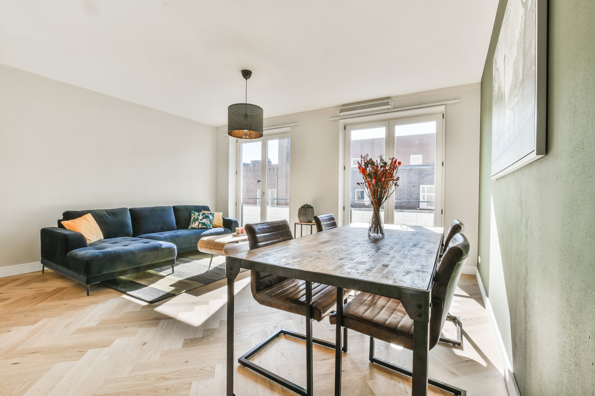 From the joint entrance you can take the elevator or the stairs to the third floor of this building. Once you have reached the third floor, from the balustrade that leads to the apartment you will immediately see the green, communal courtyard, where residents of this building can come together in a cozy way. Upon entering the hall, the modern details of this newly renovated apartment immediately catch your eye. Think of the oak herringbone floor and the black door fittings. From the hall you walk to the front for the living area of ??this apartment. This bright space has south-facing French doors, perfect for enjoying the outdoors on a sunny day.
