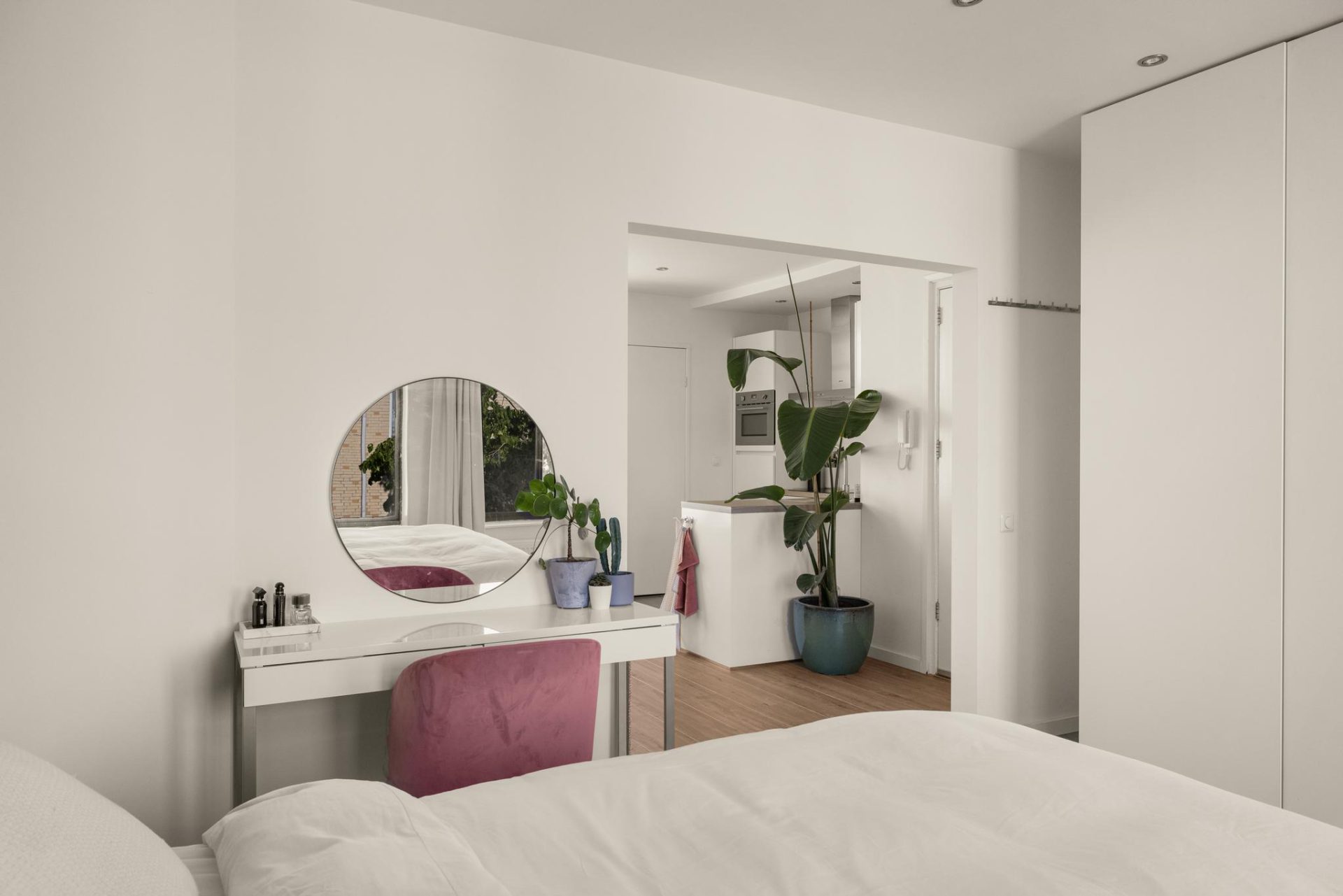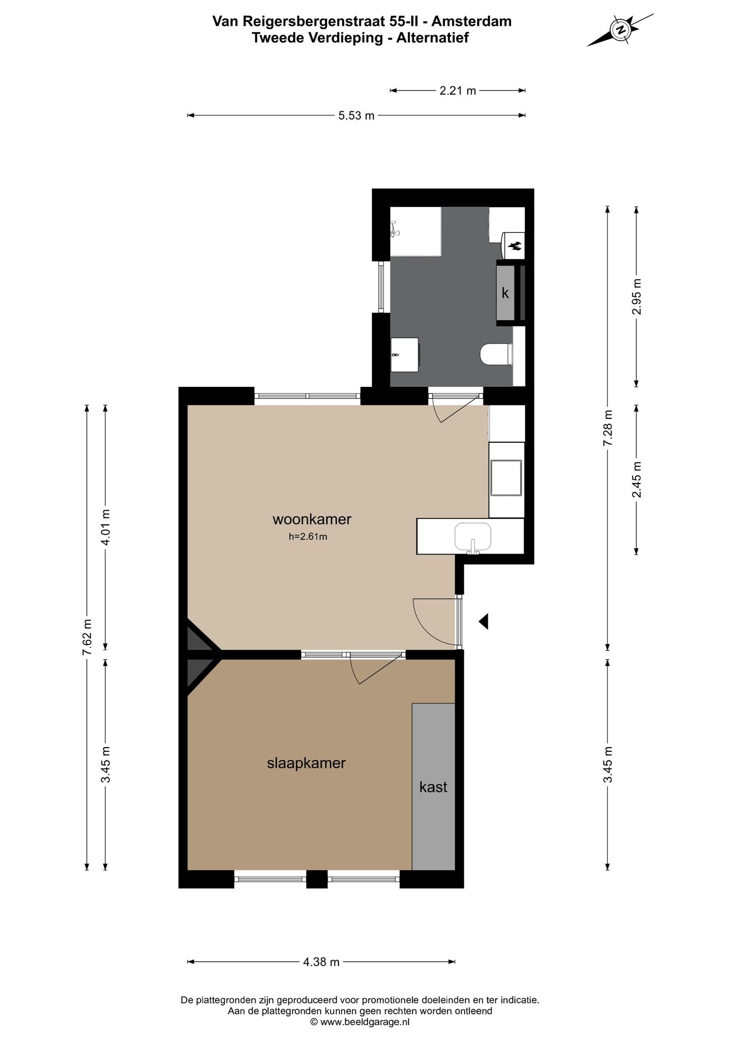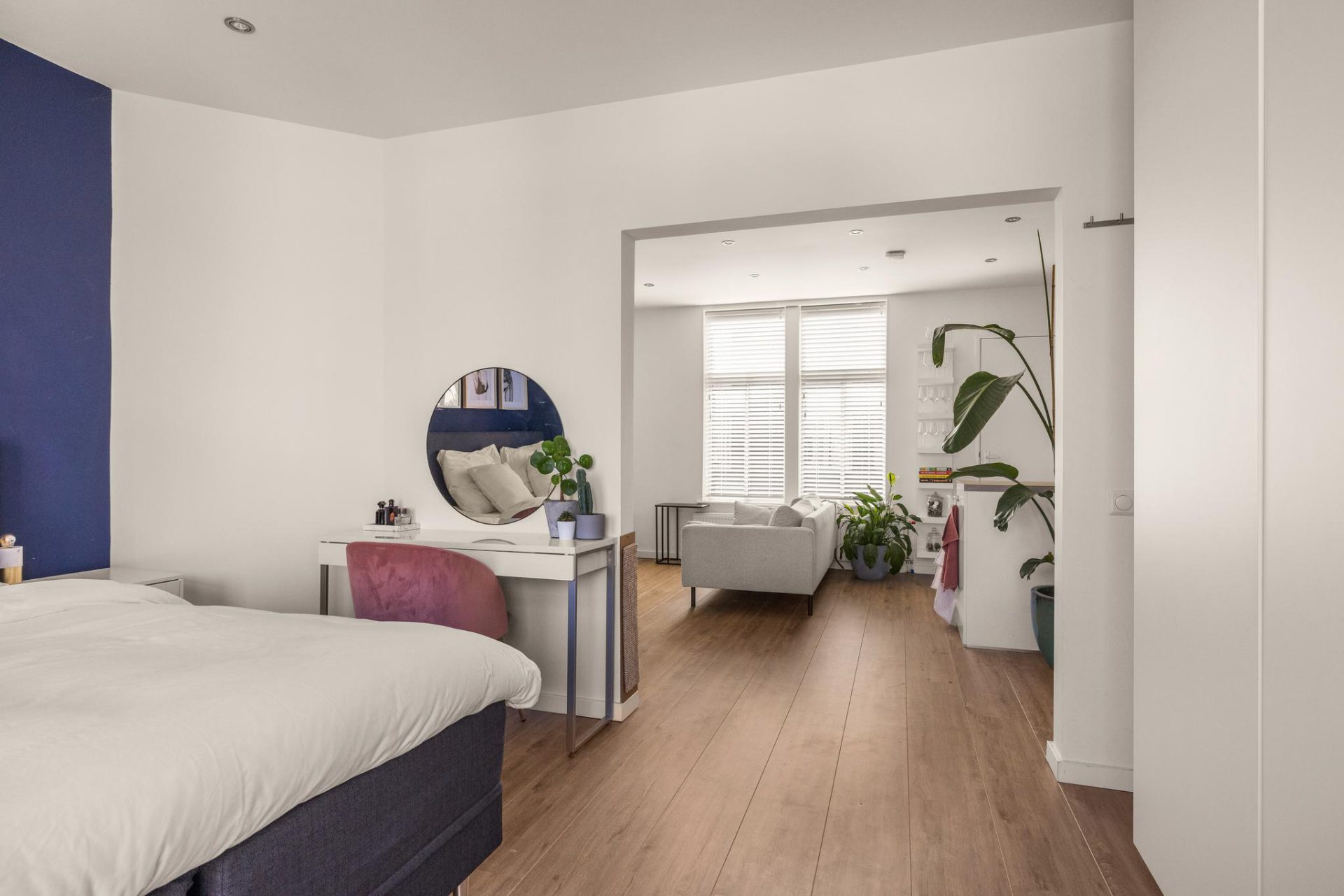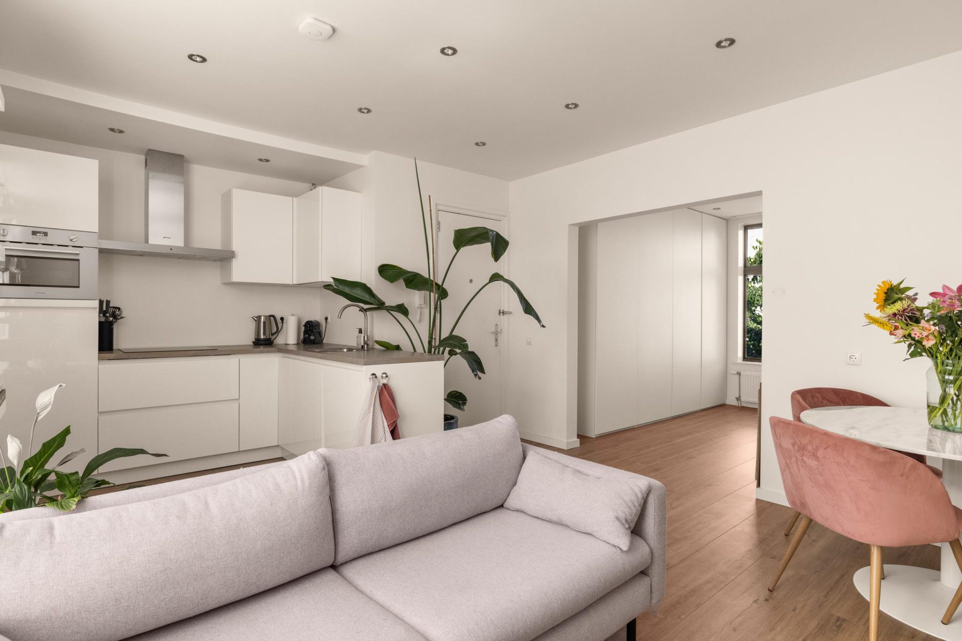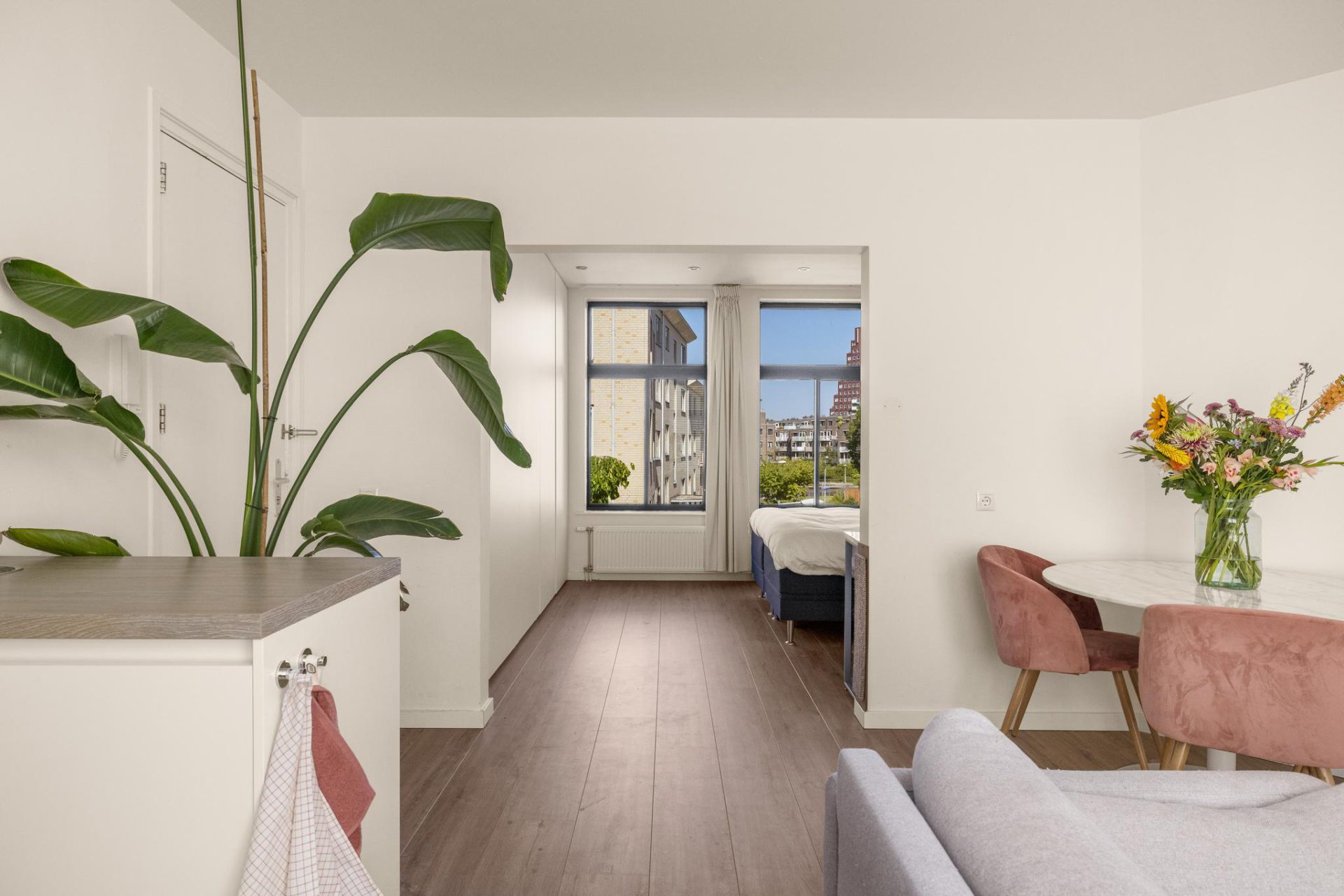 Through the neat communal staircase you reach the front door on the second floor. Upon entering you find yourself in the nice living room with the modern open kitchen. Through the large windows there is a beautiful light inside the house. The open kitchen is fully equipped with various SMEG and AEG appliances. Such as a dishwasher, induction hob, combi oven/microwave and fridge freezer. The bedroom is located at the front and is of very good size. There is room for a king size bed and there is a large closet available containing the meter cupboard. Currently there is no wall between the living room and the bedroom but this is easy to realize (see alternative floor plan). The bathroom is located at the rear and has a marble look floor, a walk-in shower, washbasin, toilet, a built-in closet and a washing machine connection.